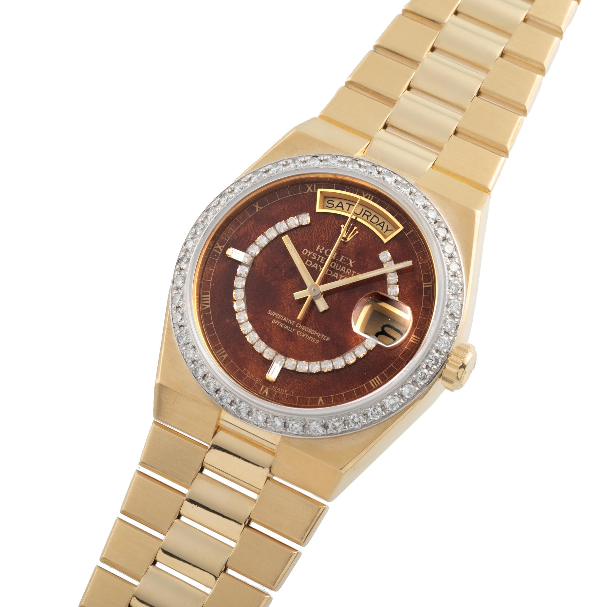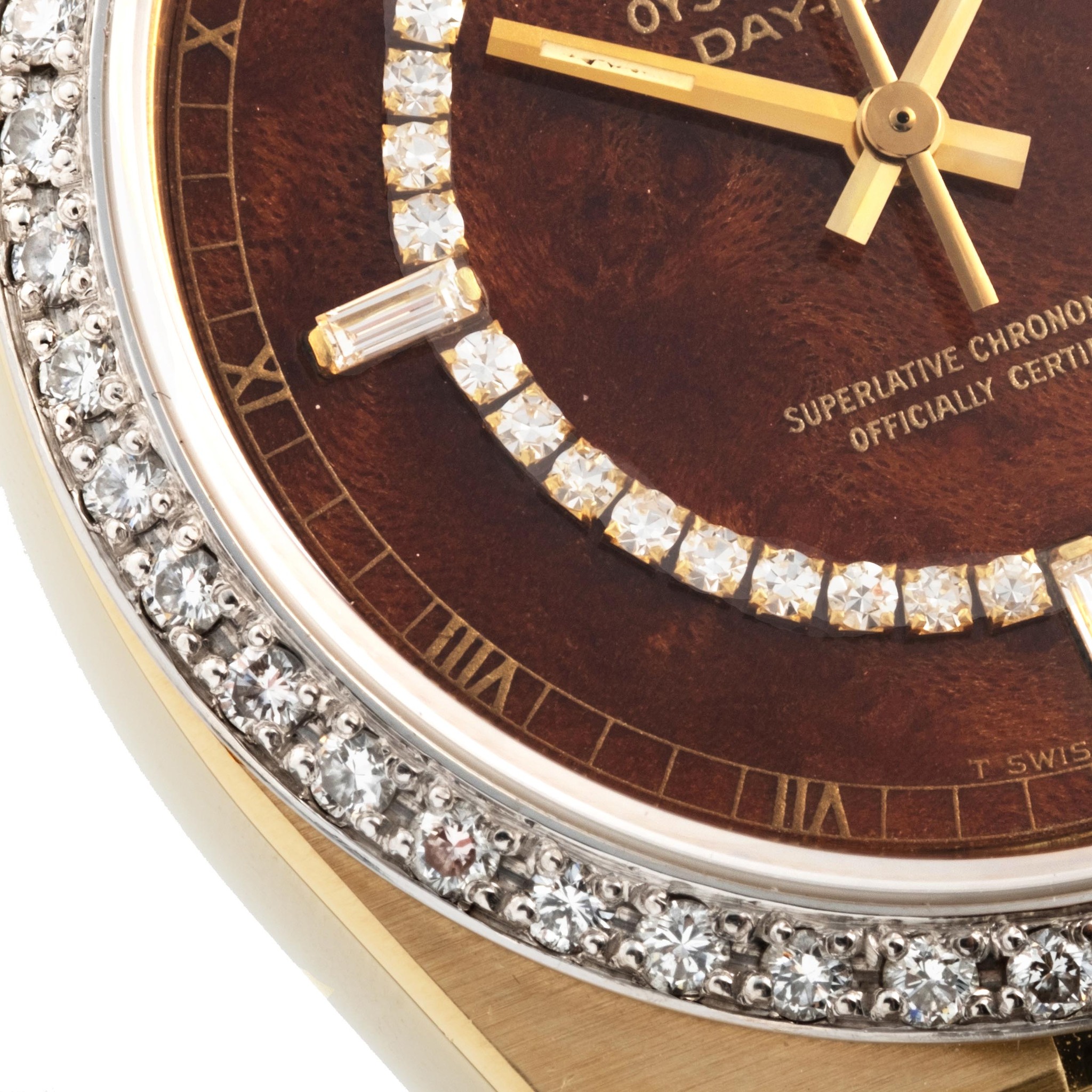 ROLEX, SWITZERLAND, REF. 19048, DAY-DATE, BURLWOOD STRING DIAMOND DIAL AND BEZEL, 18K YELLOW GOLD