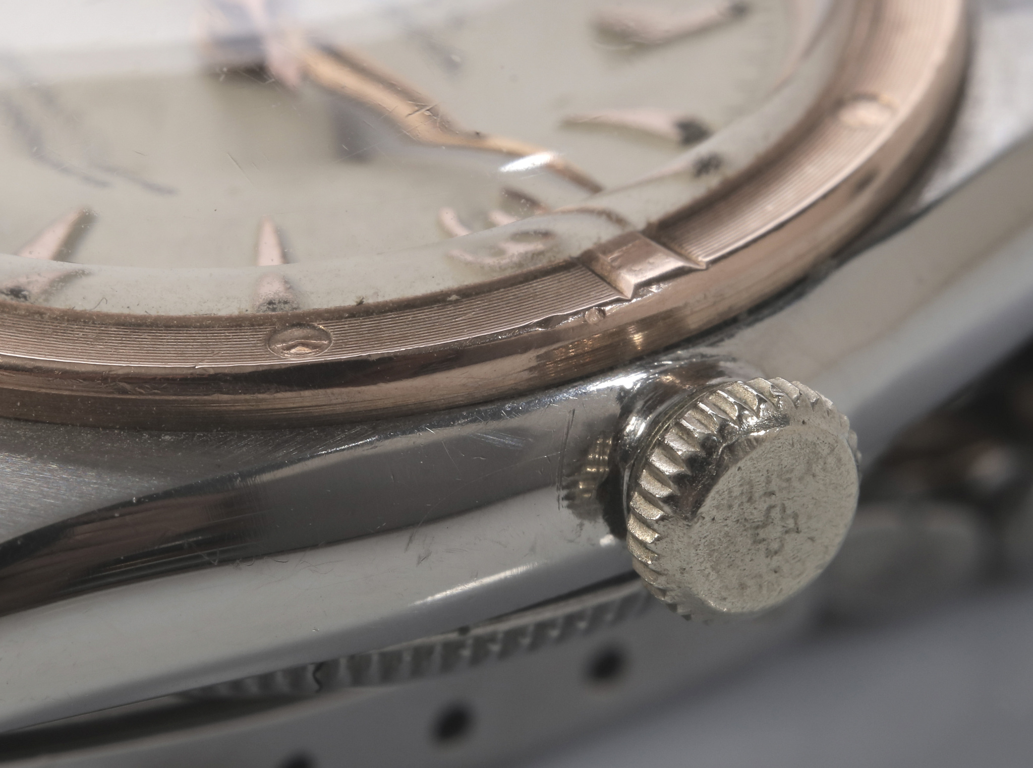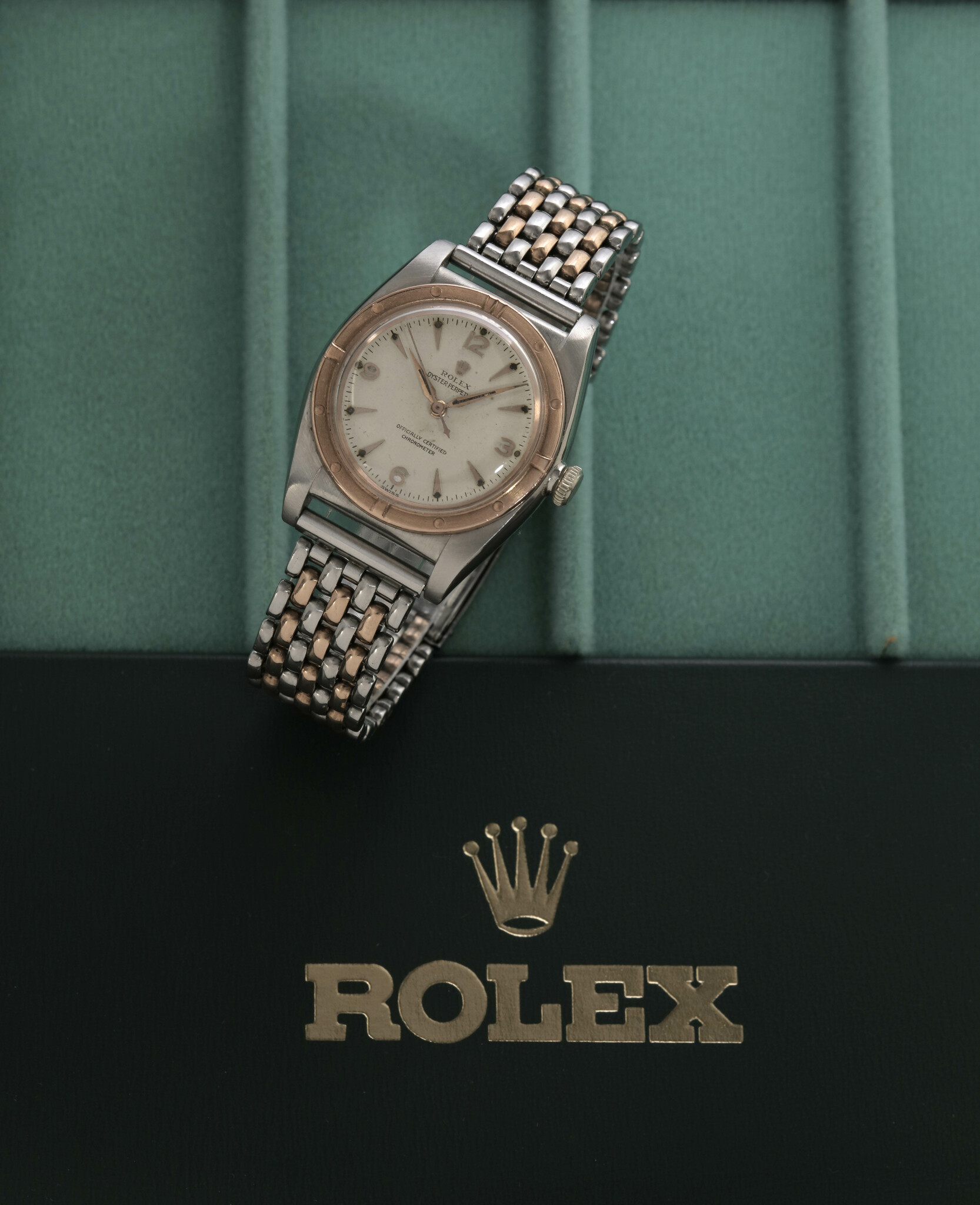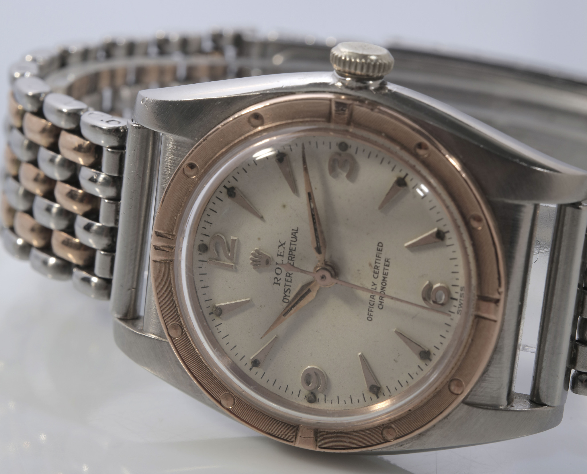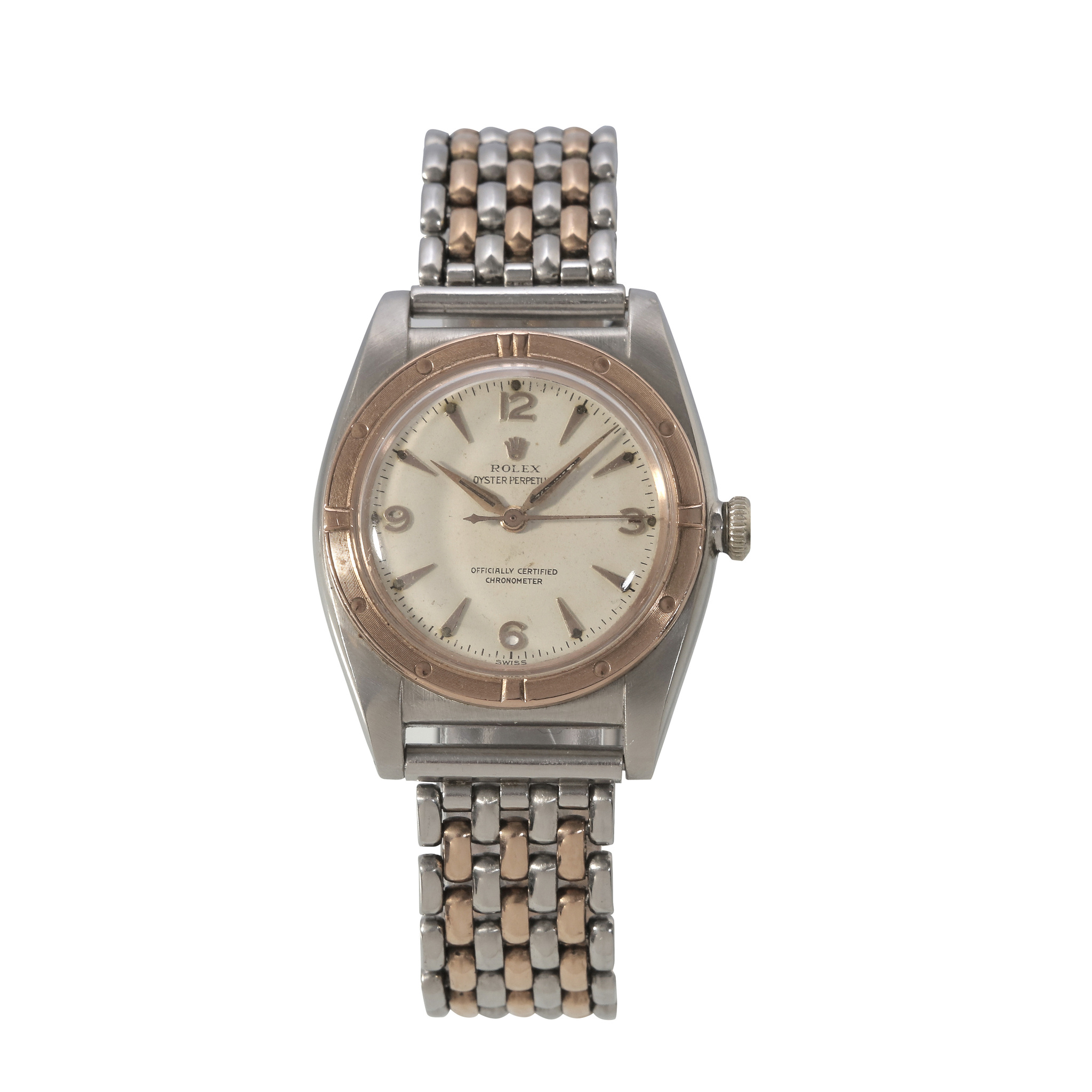 ROLEX, SWITZERLAND, REF. 3372, BUBBLE BACK CHRONOMETER STAINLESS STEEL AND PINK GOLD