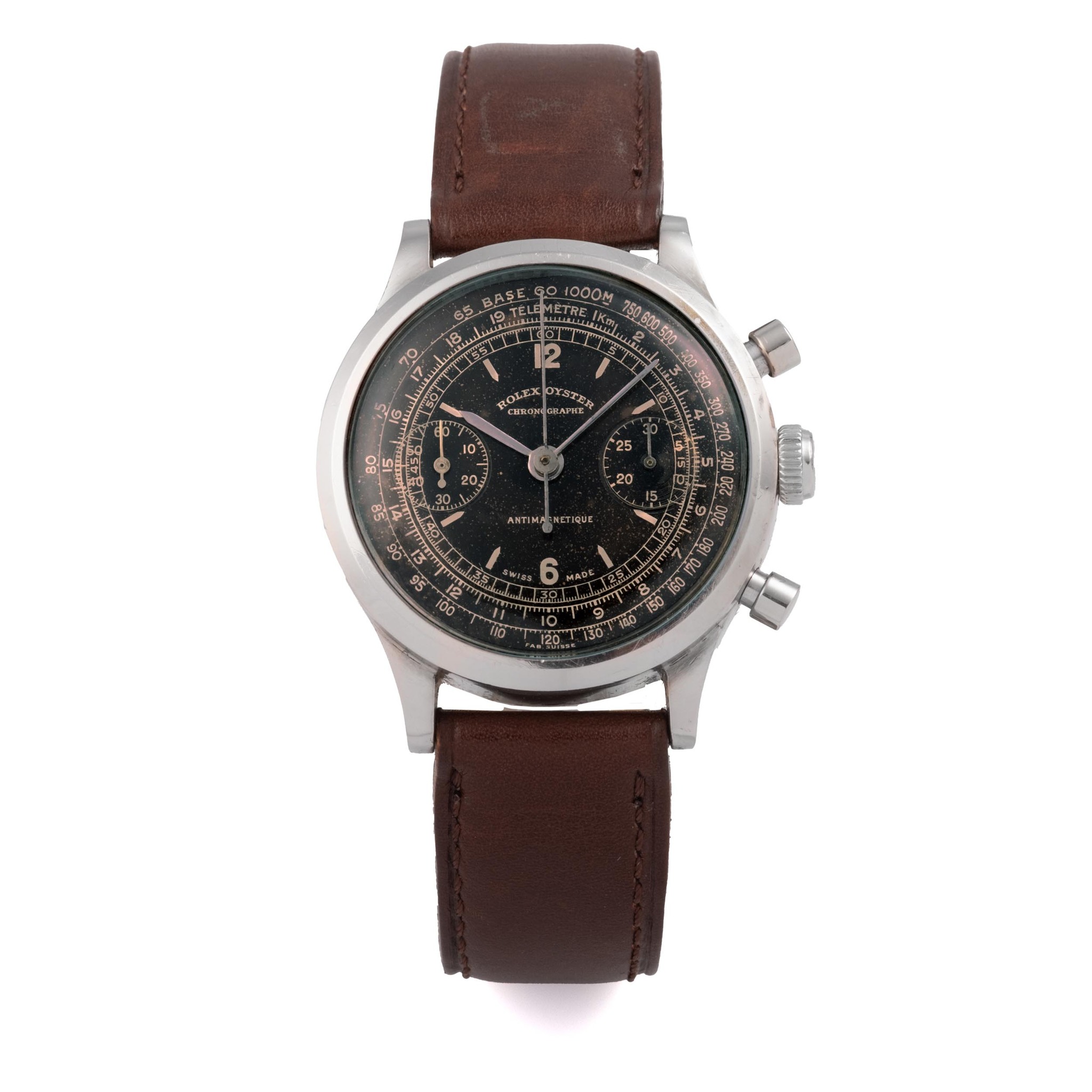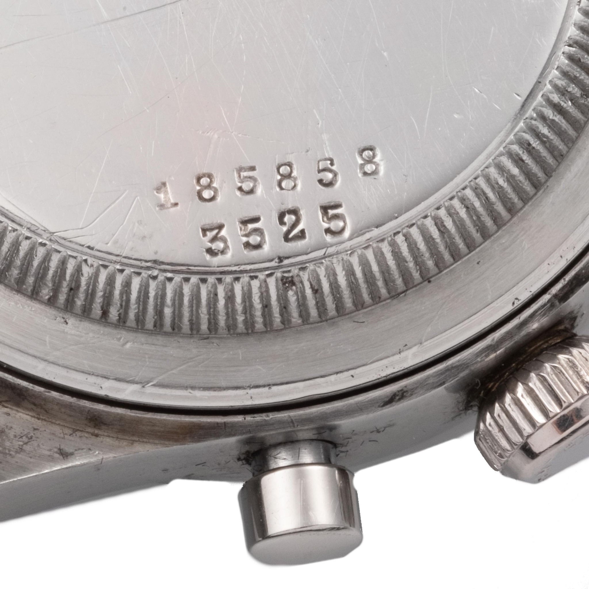 One of the most attractive chronographs ever produced by Rolex, the reference 3525 is known to collectors as monoblocco due to its single case construction. Built as the first oyster case chronograph featuring a screw-down caseback and crown, this first generation example featuring crisp numbers to the caseback has been conserved in wonderful condition and has the rare black dial configuration.