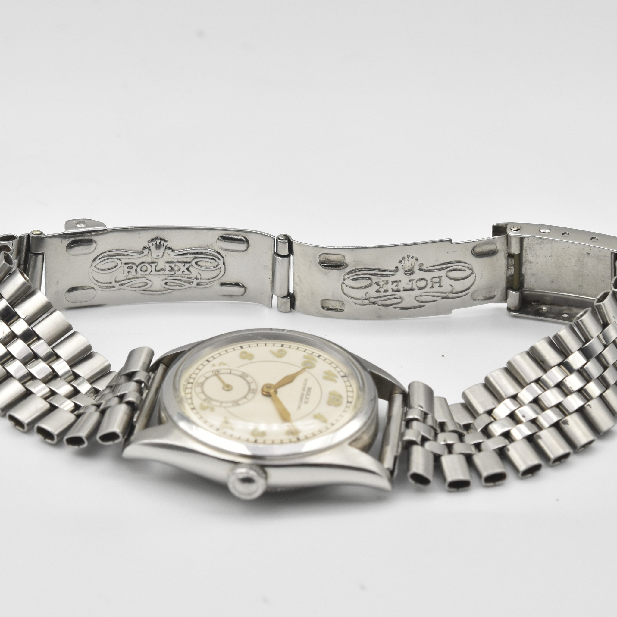 The polished Oyster case retains the rounded, compact proportions typical of the Bubble Back architecture, its thickness a direct result of the early self-winding mechanism housed inside. Paired with a desirable and hard-to-find period “Big Logo” steel bracelet, the watch presents an authentic and cohesive aesthetic, still deeply connected to its era.