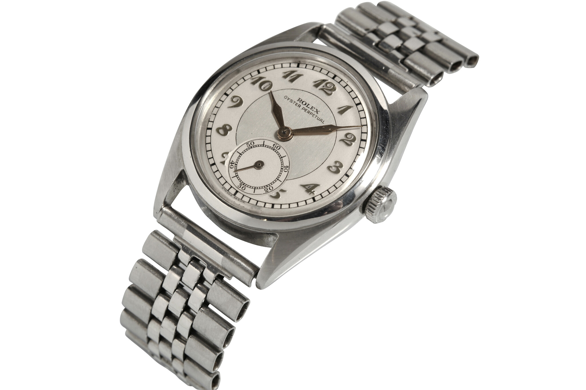 A charming example of one of Rolex’s most historically significant early automatic wristwatches, this stainless steel reference 4392, part of the celebrated “Bubble Back” family combines technical ingenuity with elegant Art Deco aesthetics. Produced in the 1940s, these models marked Rolex’s pioneering transition into fully-waterproof and self-winding wristwatches, forming the foundation of the Oyster Perpetual line as we know it today.