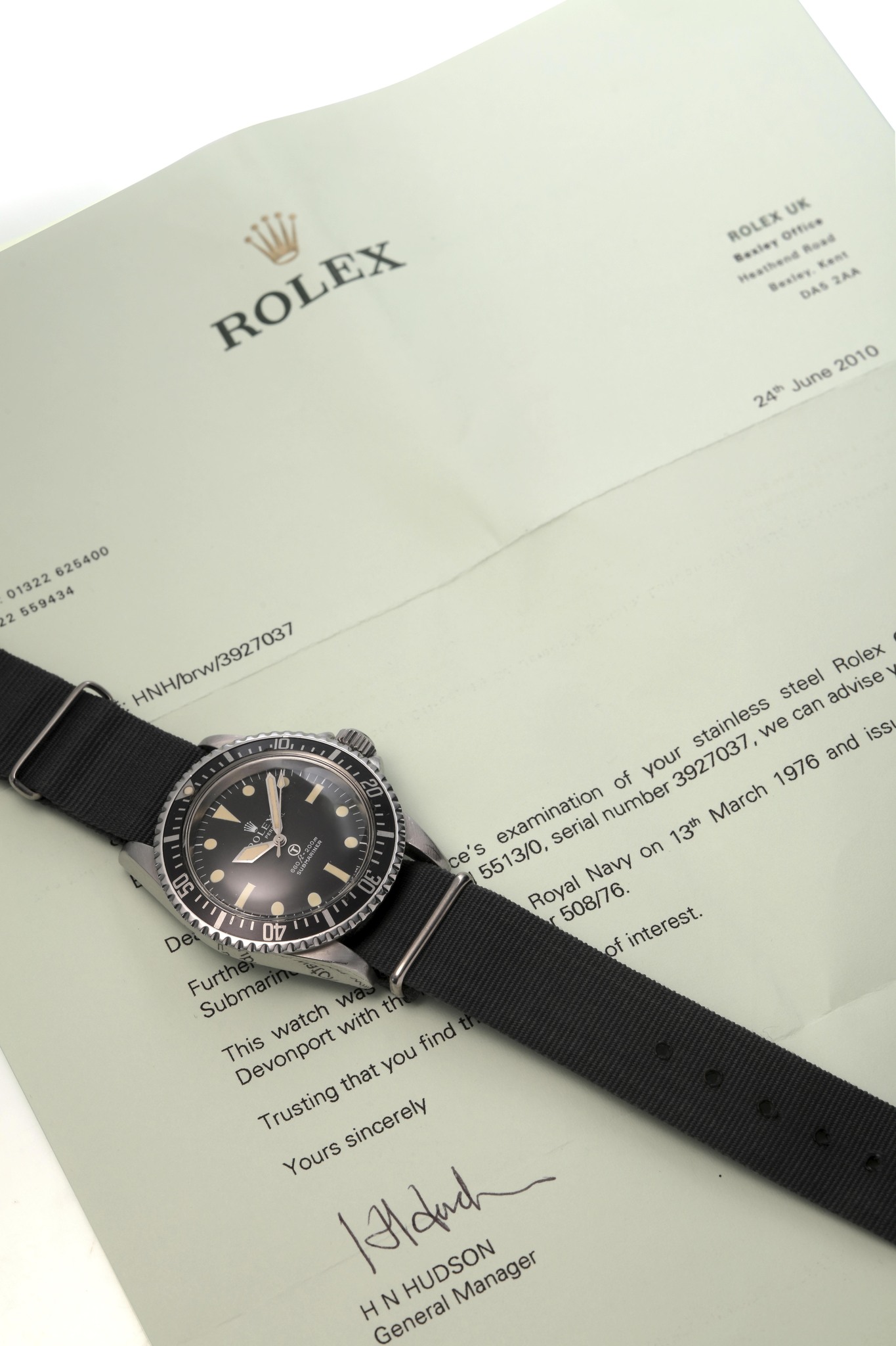 The combination of these documents elevates the present example far beyond mere rarity. It embodies a fully traceable history, uniting mechanical integrity, military specification and personal provenance in a manner seldom encountered. Among the known MilSubs, very few achieve this level of documentary richness, making this reference 5513 not only a remarkable survivor of military service but also one of the most historically significant examples to emerge on the market.