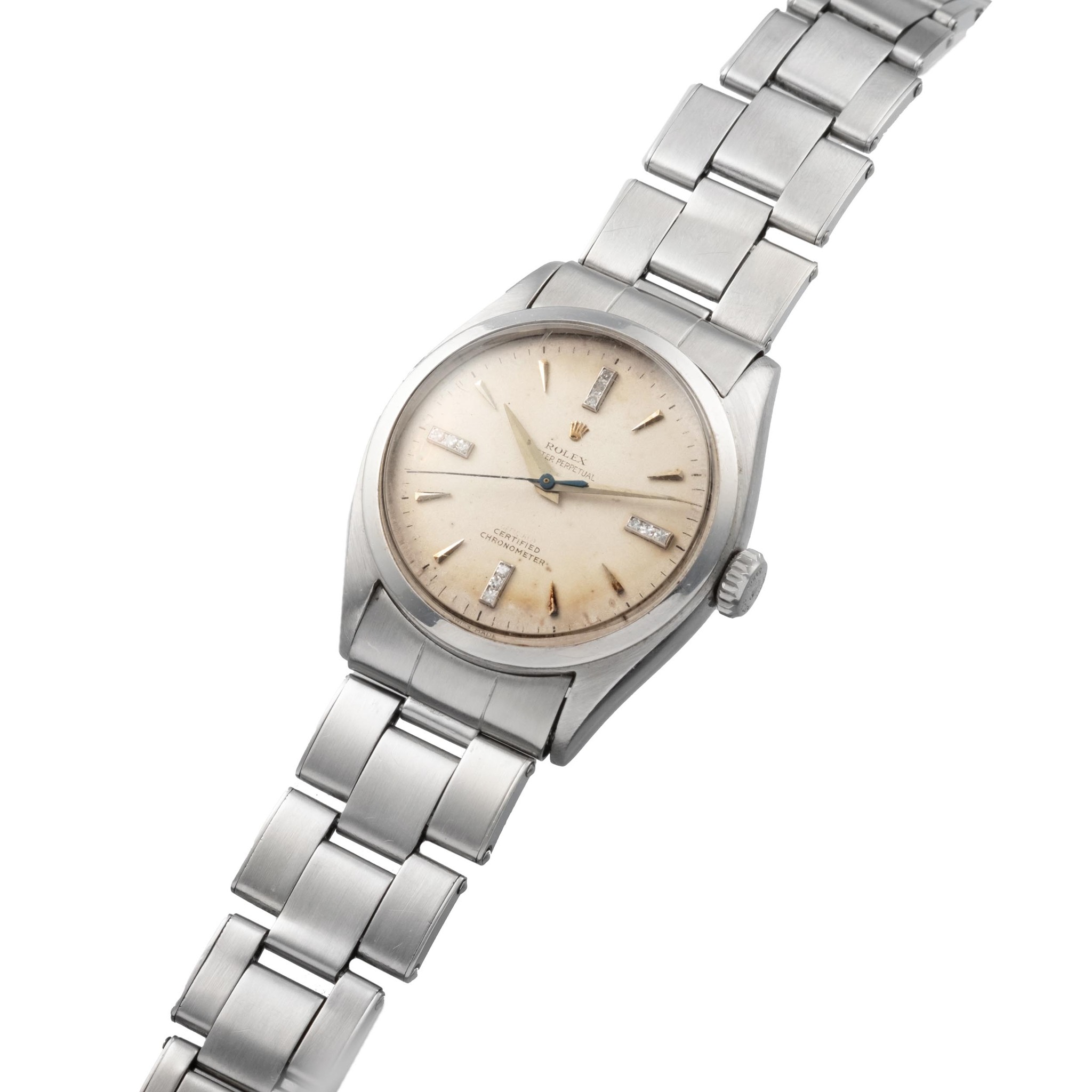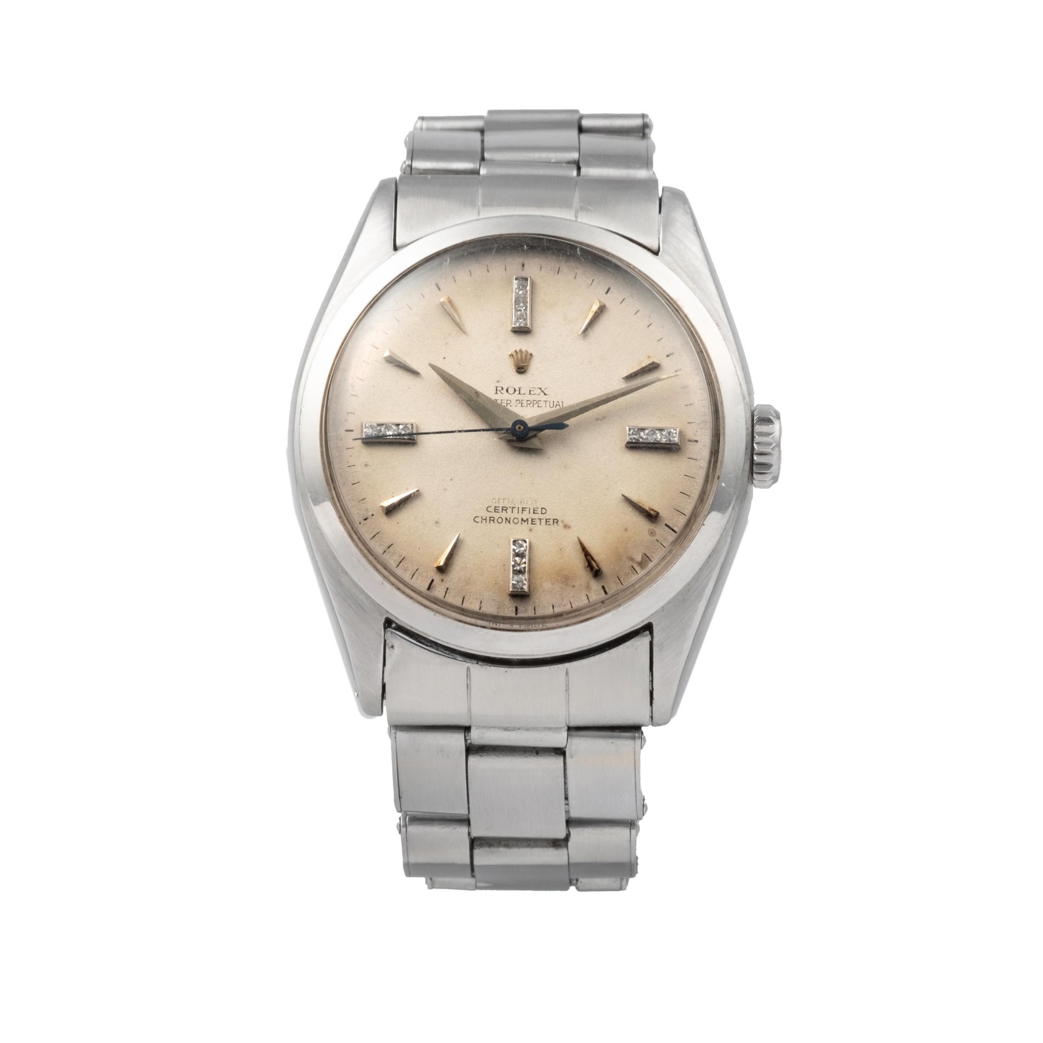 A fine and very rare, center seconds, self-winding, water-resistant, stainless steel chronometer wristwatch, with silver dial and diamonds set with center second