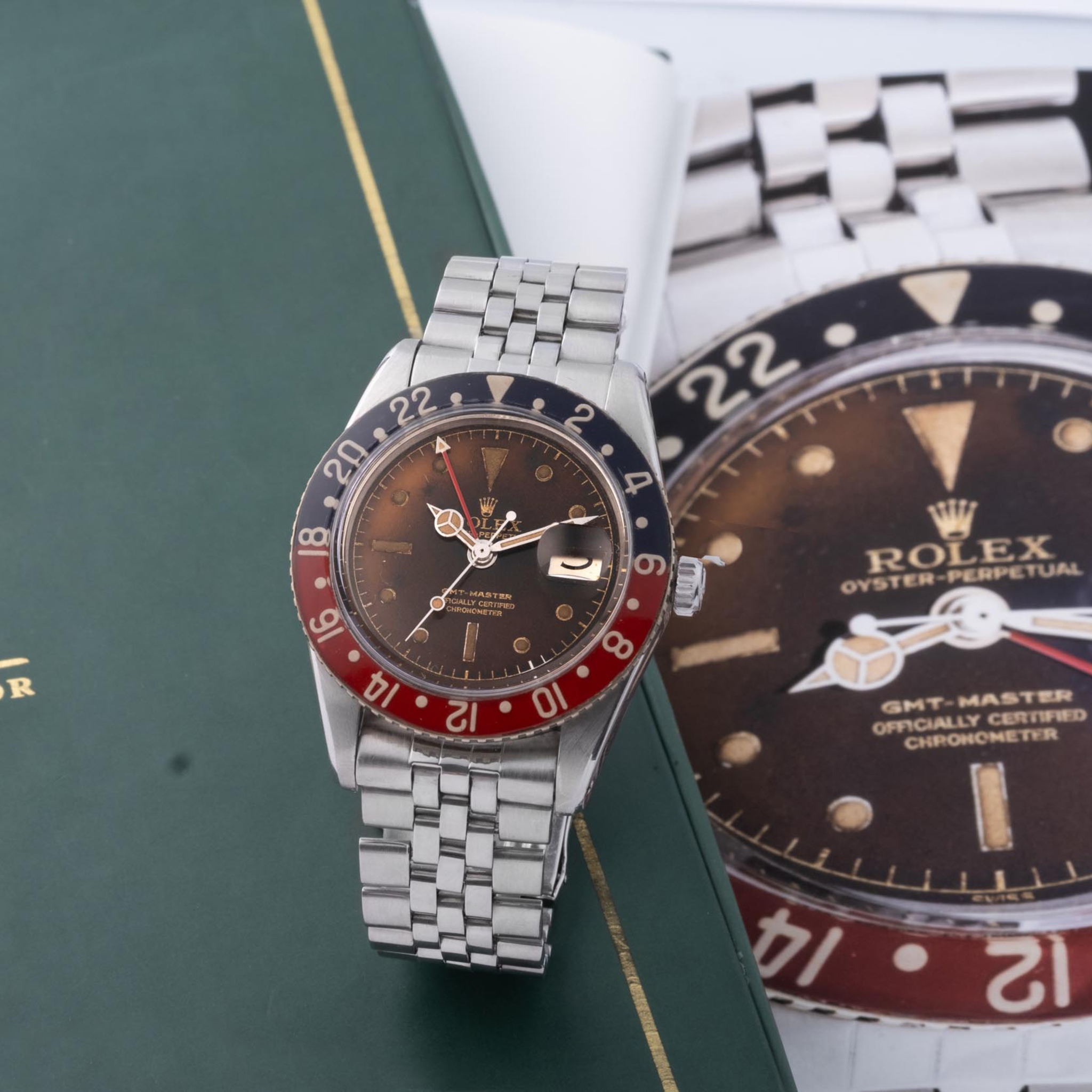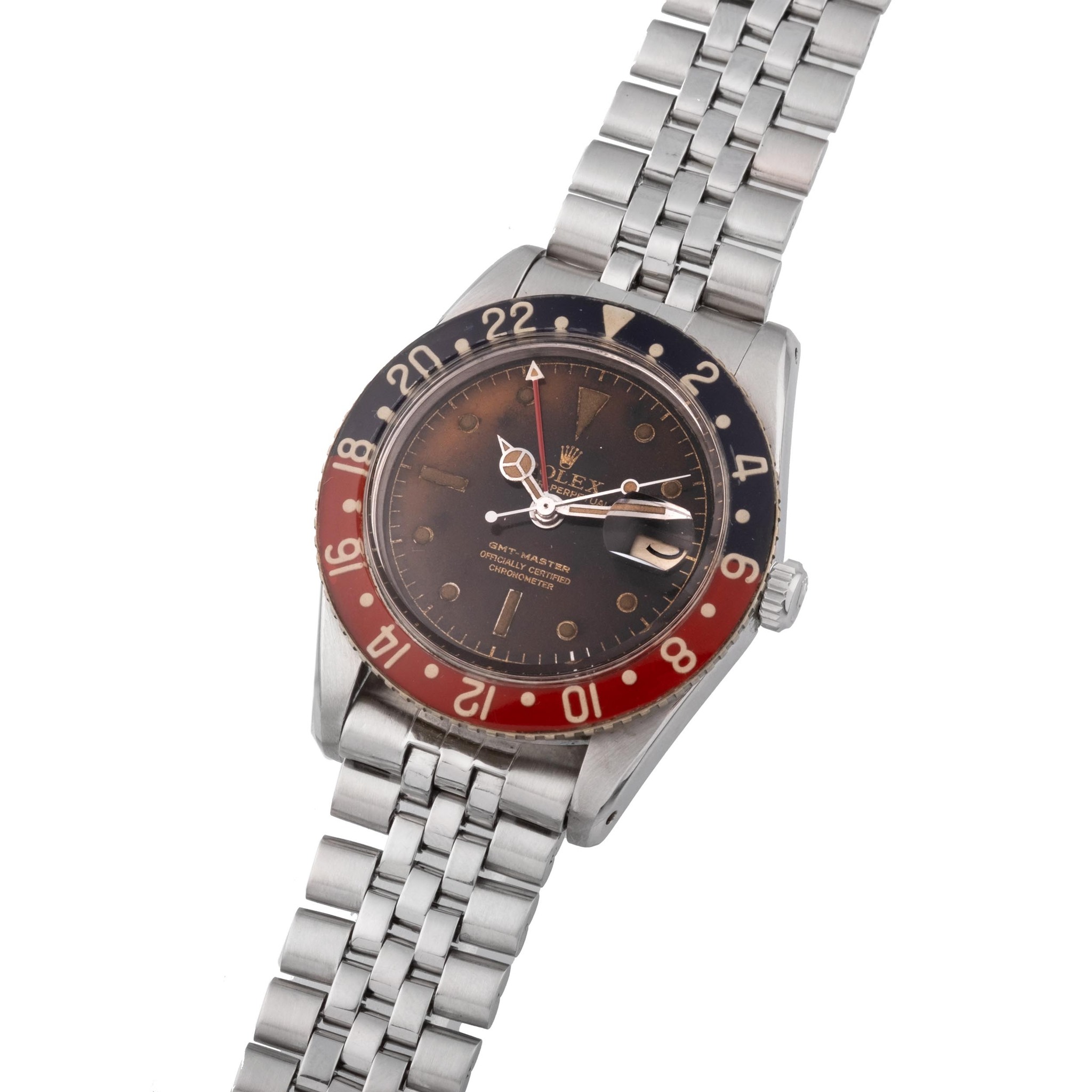 The dial has aged to a rich and attractive tropical brown, the result of a natural and highly sought-after transformation from its original black tone. The luminous hour markers show a later relume, executed with care and sympathetic to the dial’s overall patina. The early-style hands and the prominent GMT indicator further exemplify the design vocabulary unique to the inaugural GMT-Master generation.