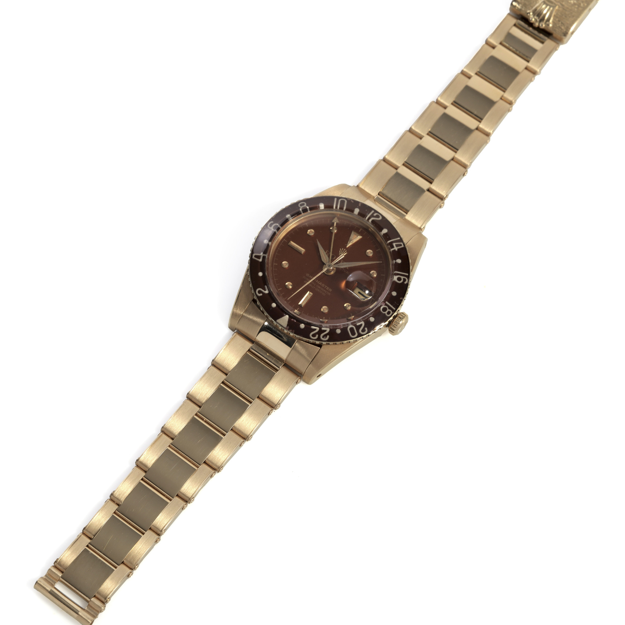 The Bakelite bezel insert, displaying the signature 24-hour scale, is beautifully preserved with its translucent finish and deep red-brown hue, a hallmark feature of the earliest GMT-Master models, and a rarity today due to the fragile nature of the material.