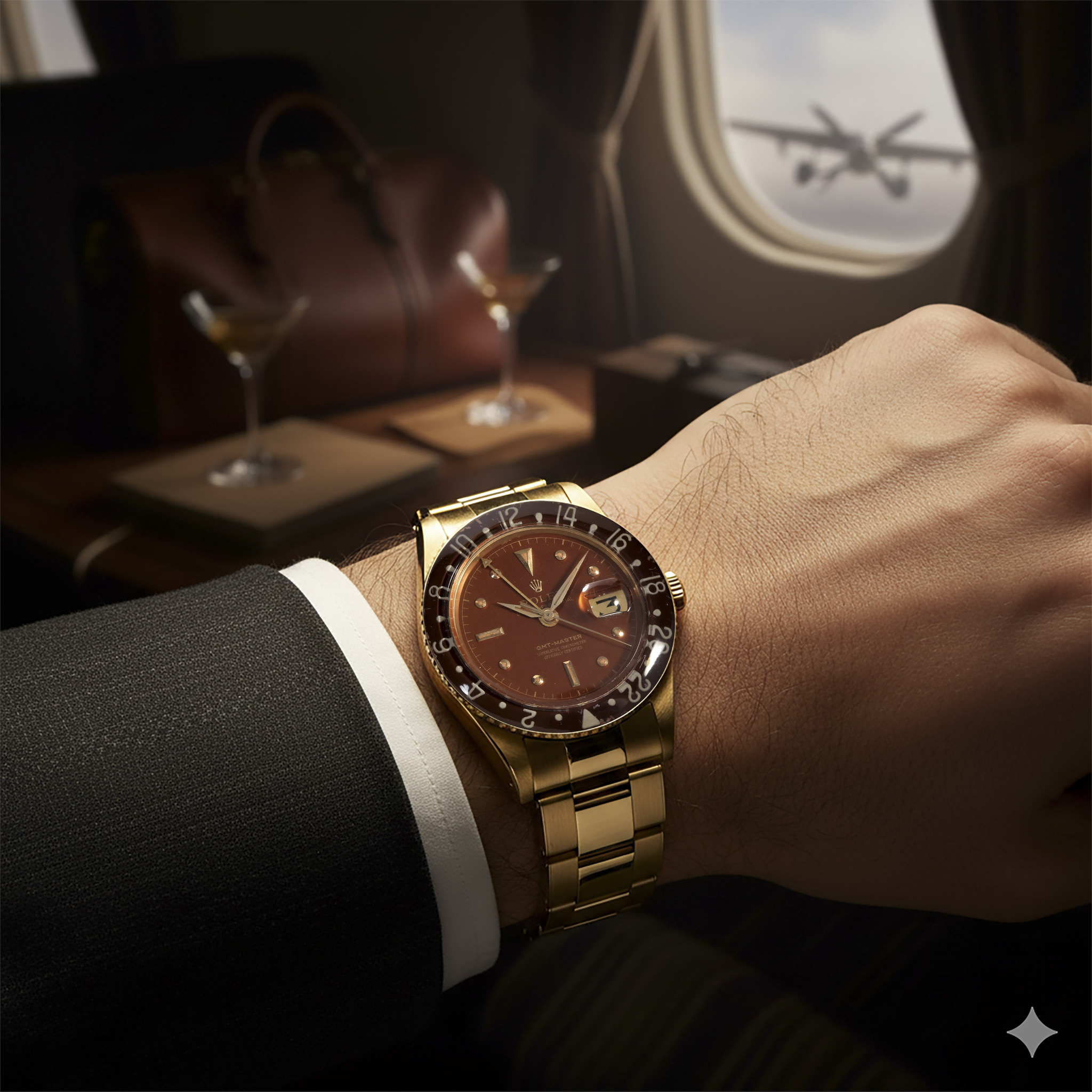 The present watch is an outstanding example of the legendary Rolex GMT-Master reference 6542, crafted entirely in 18K yellow gold and dating from 1959, the final production year of this historic reference. Introduced in 1954 and developed in collaboration with Pan American Airways, the 6542 was Rolex’s first GMT-Master, a pioneering timepiece that defined the dual-time wristwatch for the modern jet age.