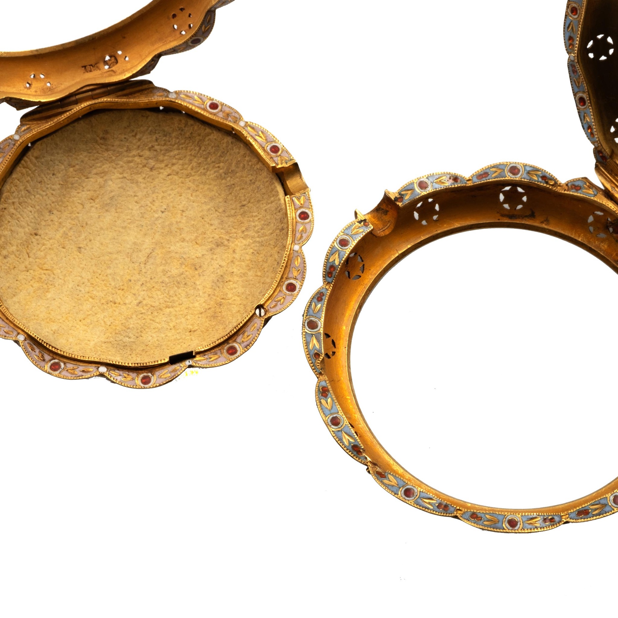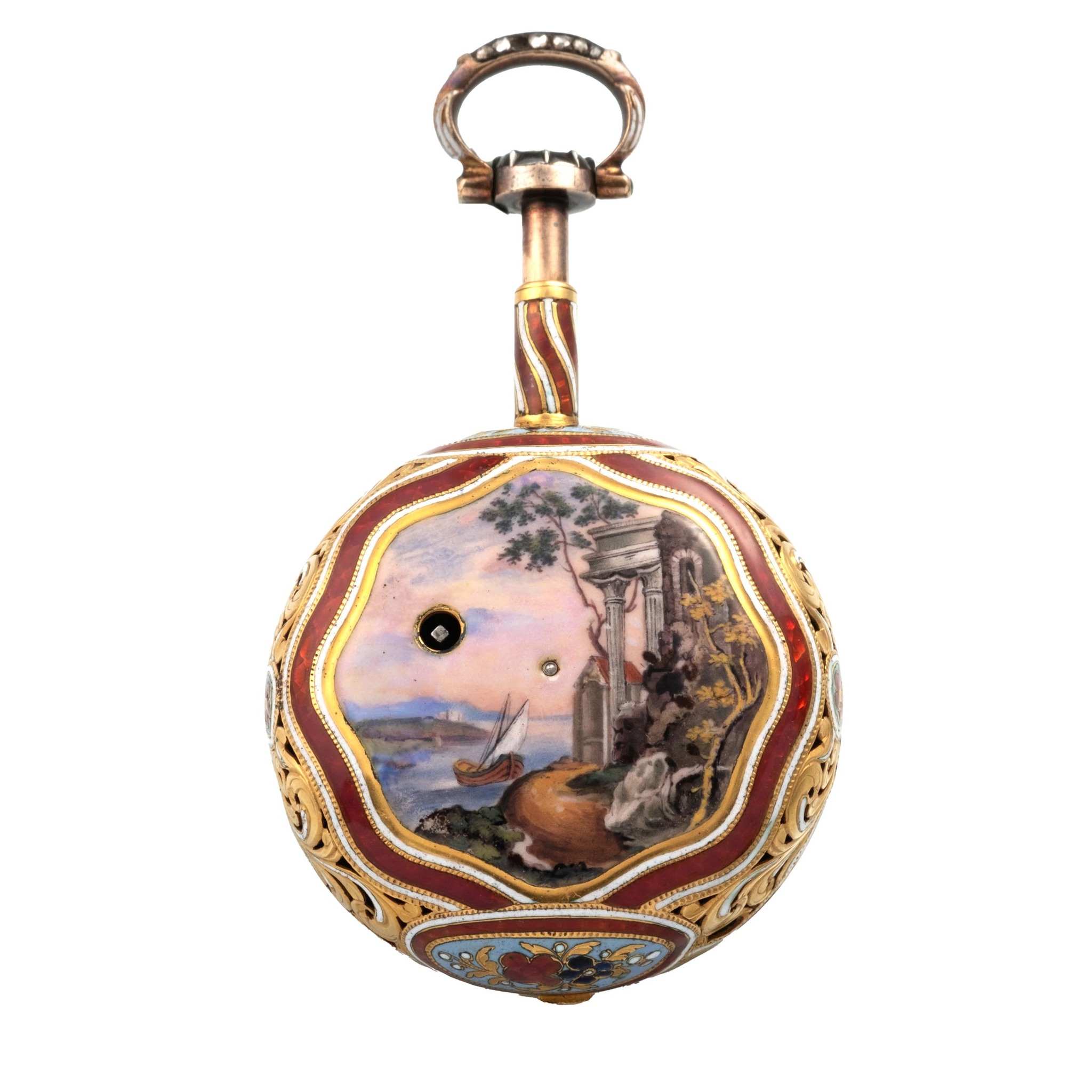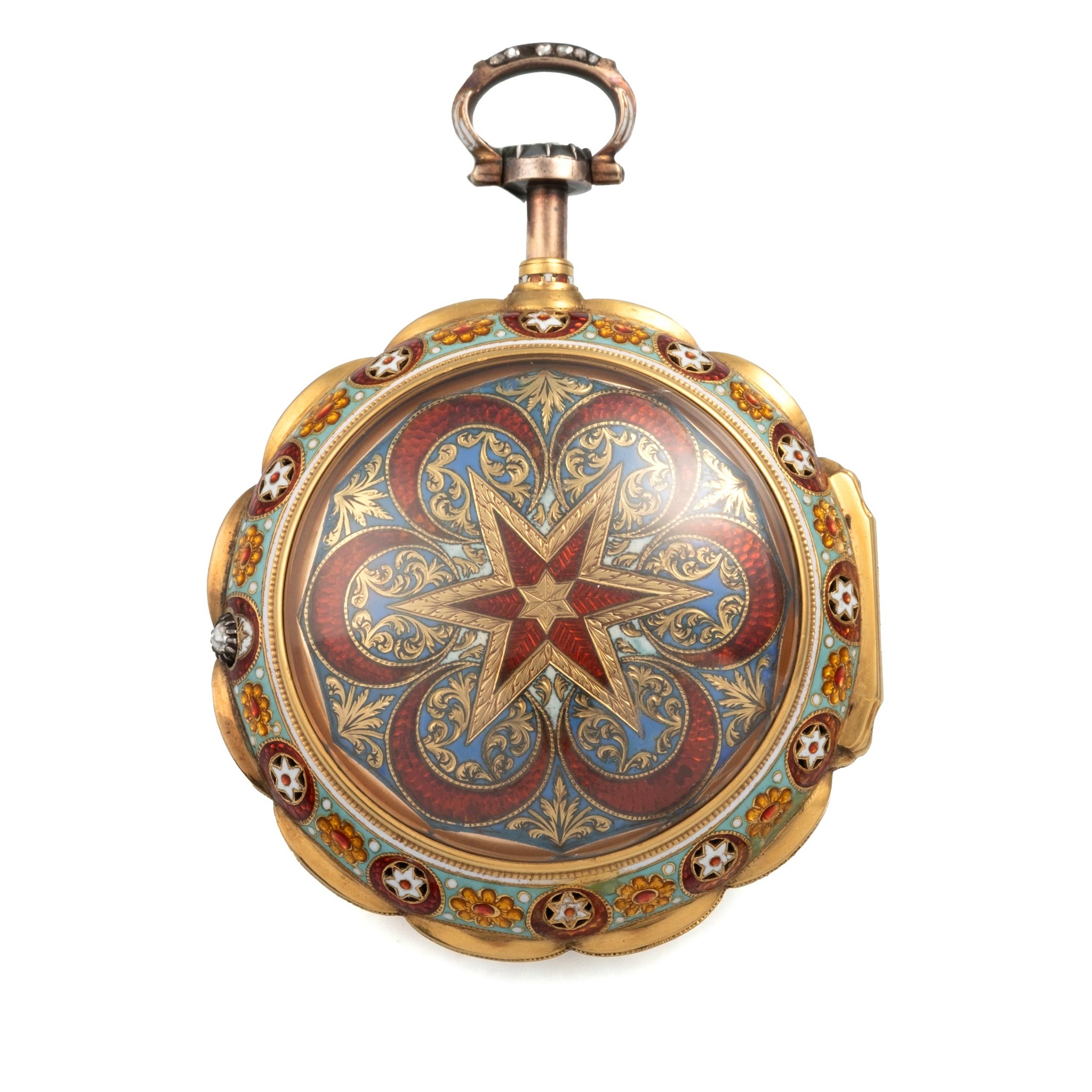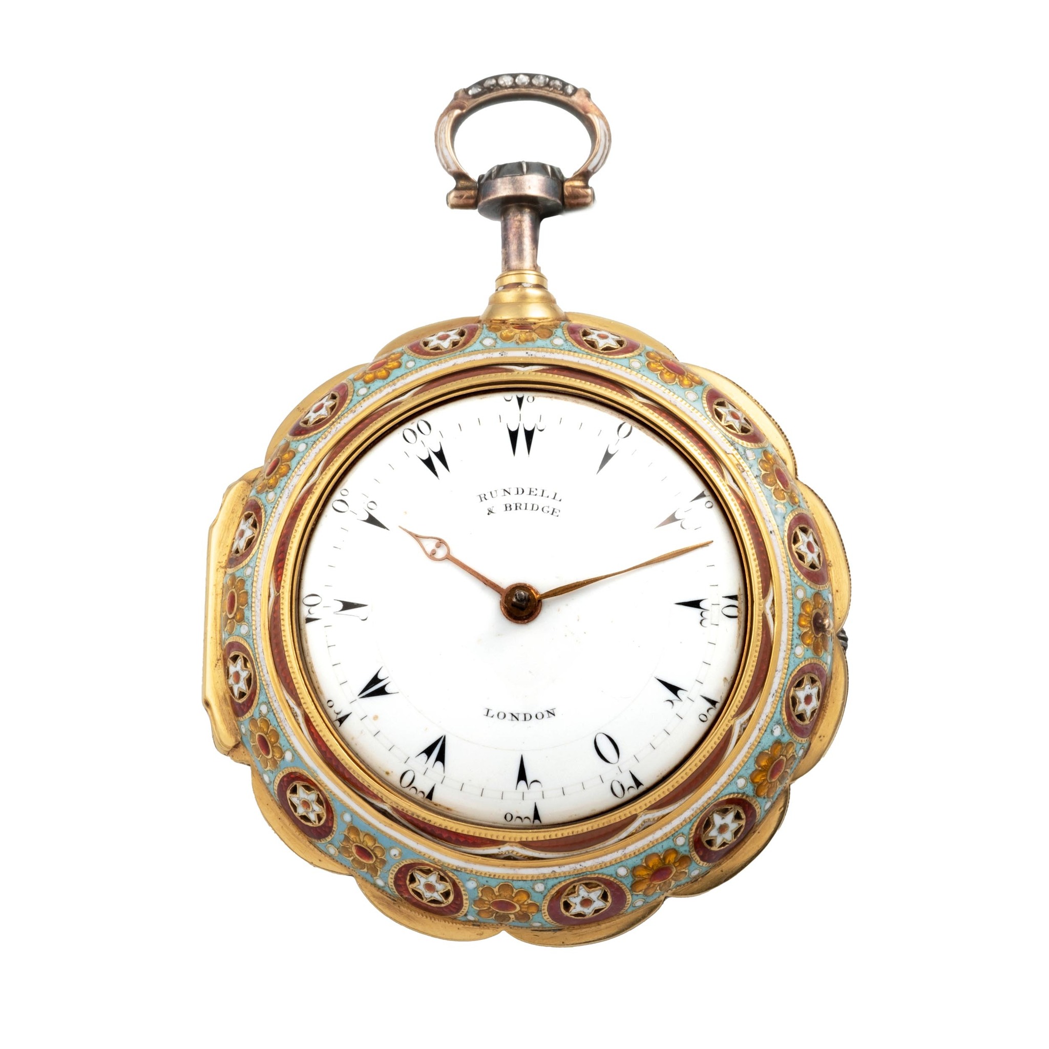 Caliber 39 mm., hinged, gilt brass full plate with turned column pillars, verge escapement, plain three-arm brass balance, blued-steel balance spring, English type one-footed cock pierced and engraved with a flower head, rack and pinion regulator with silver plate with Turkish numerals, striking train with fixed barrel, repeating with two hammers on a bell.