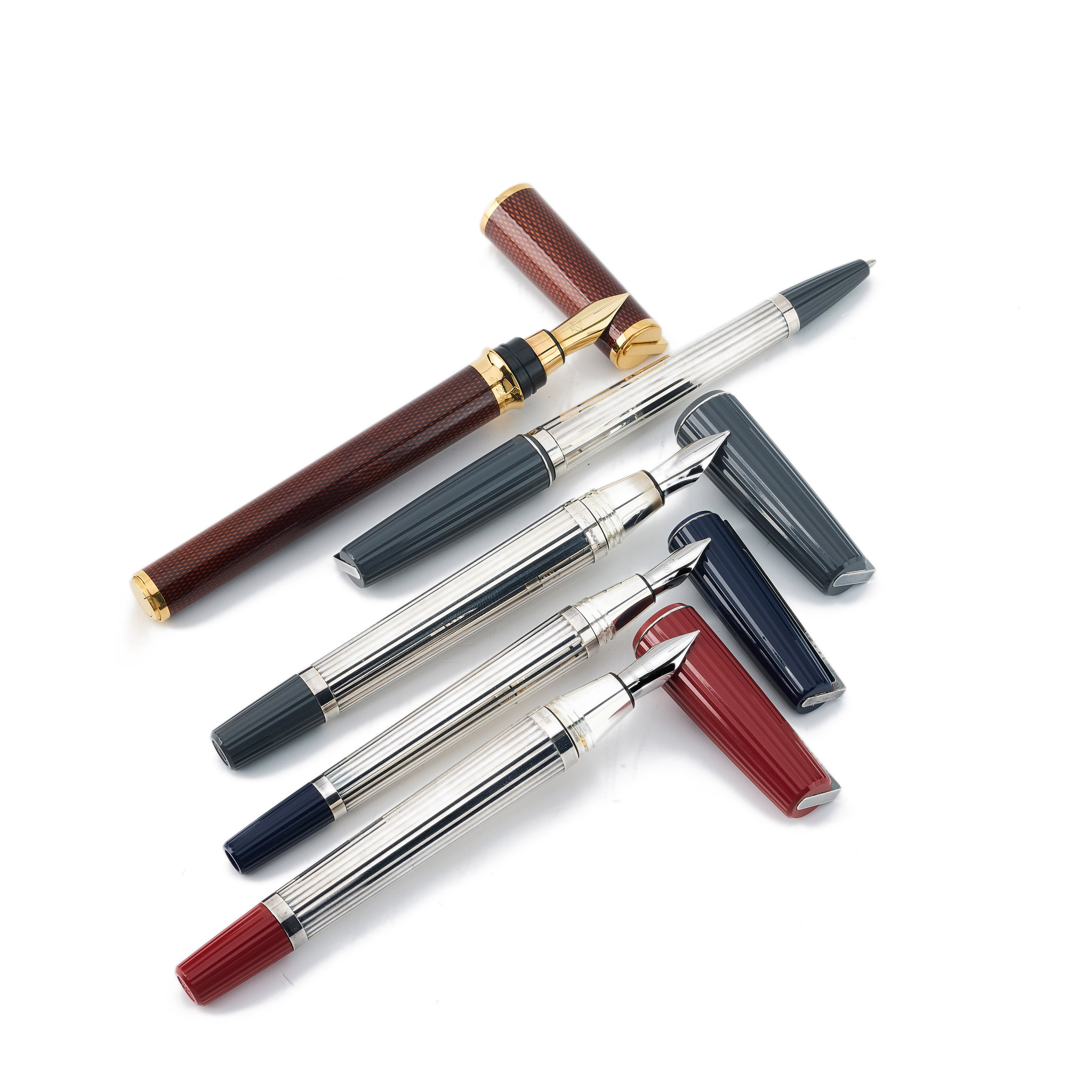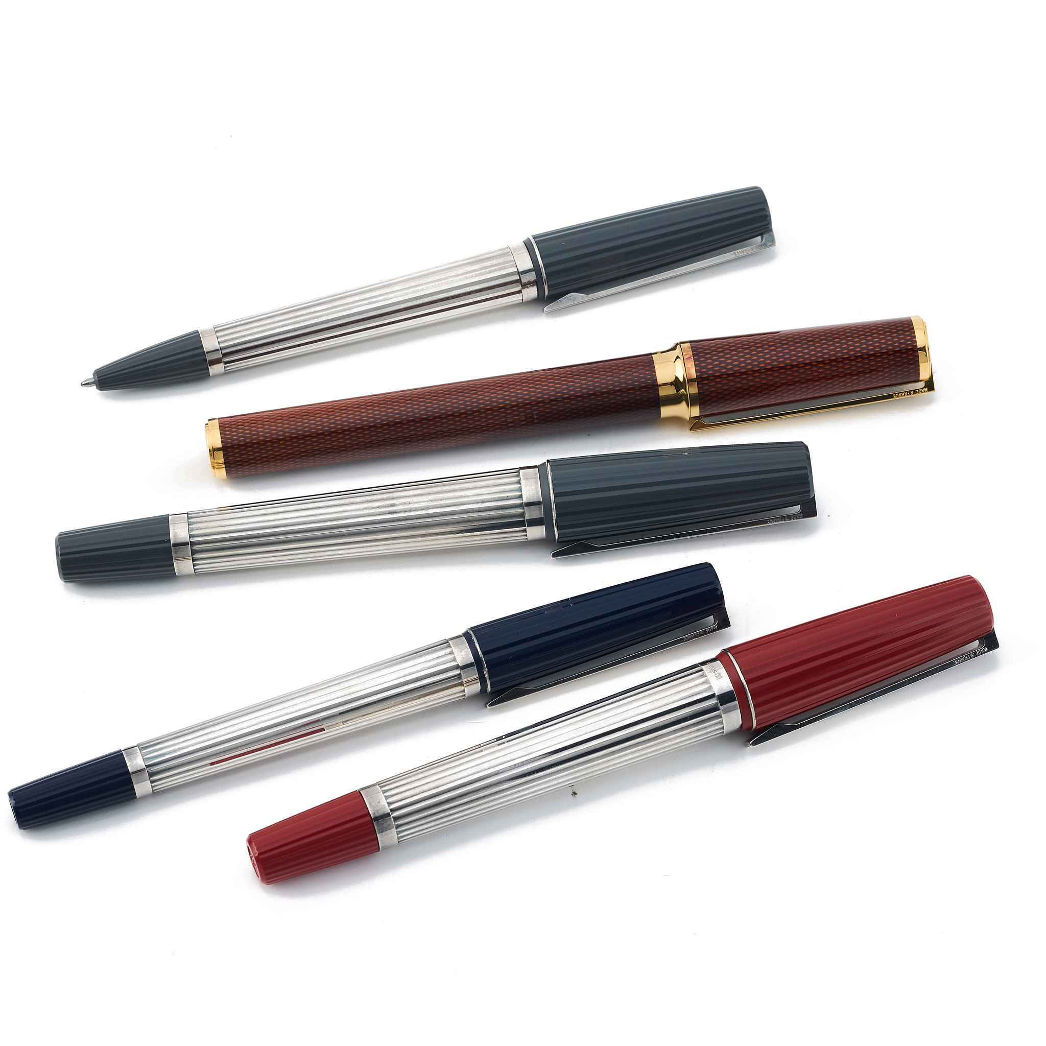 A special set of five writing instruments: 1) Montparnasse Chairman Amber Fountain Pen ; 2) Saint Germain Fountain Pen in three variations: red, grey, and blue ; 3) Saint Germain Grey Ballpoint Pen