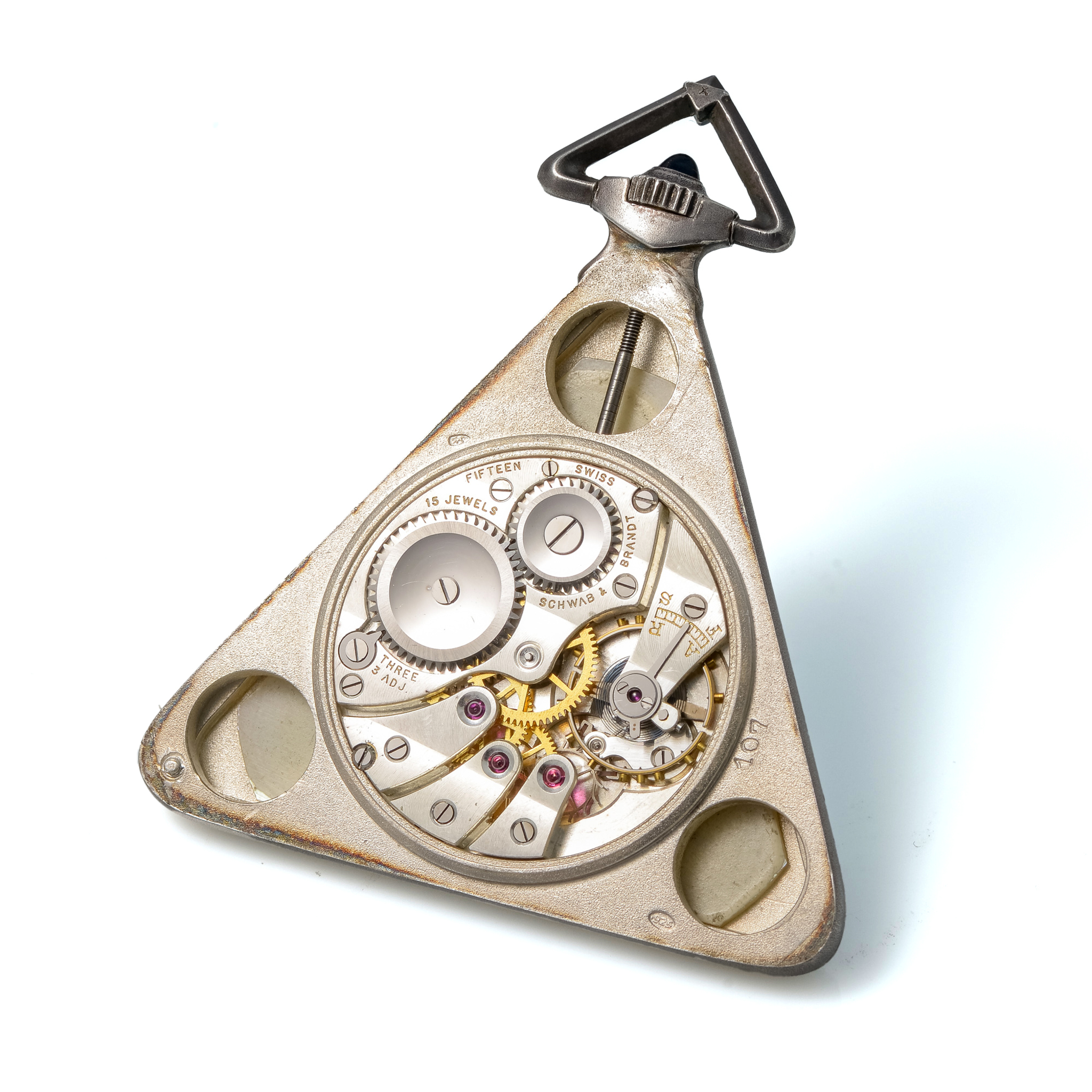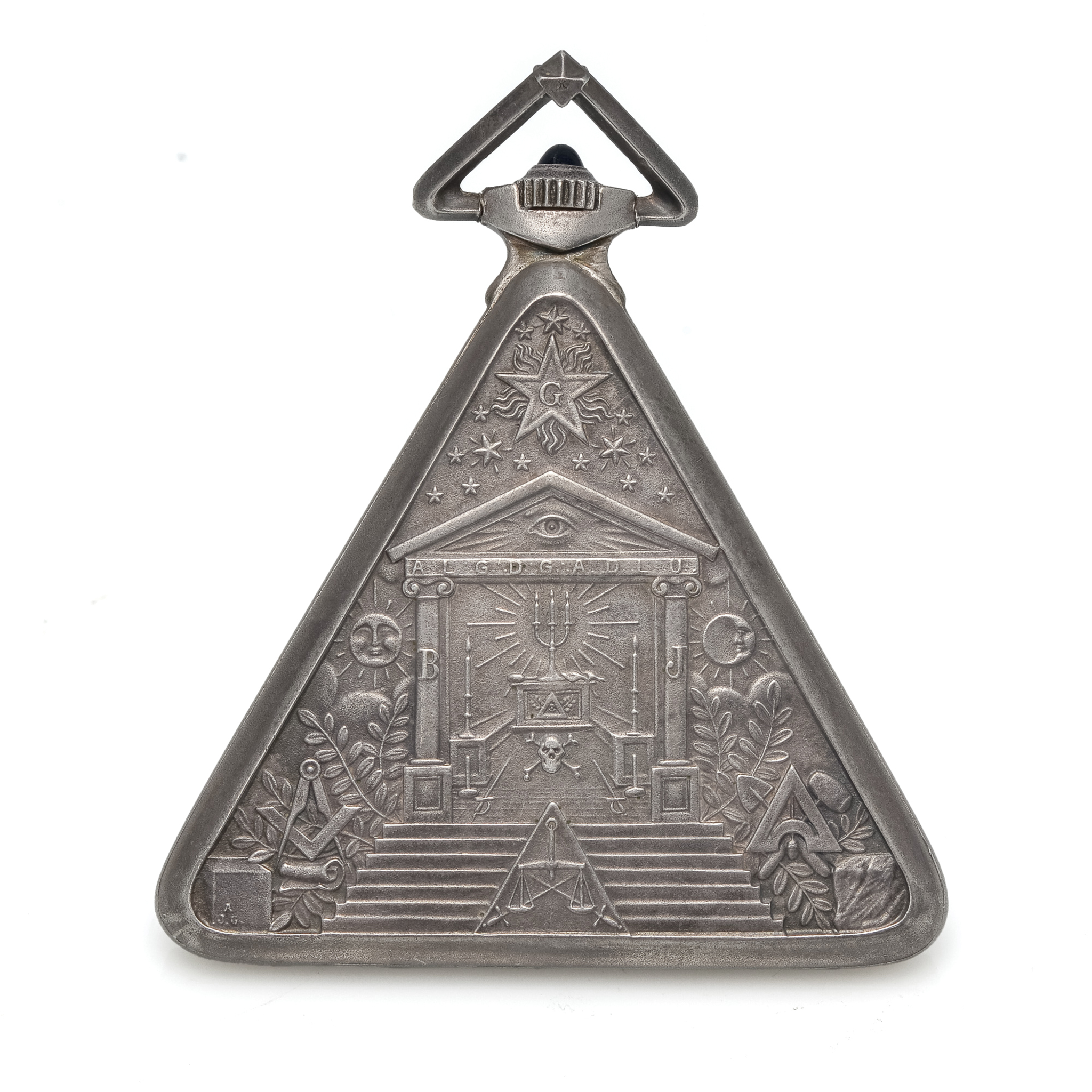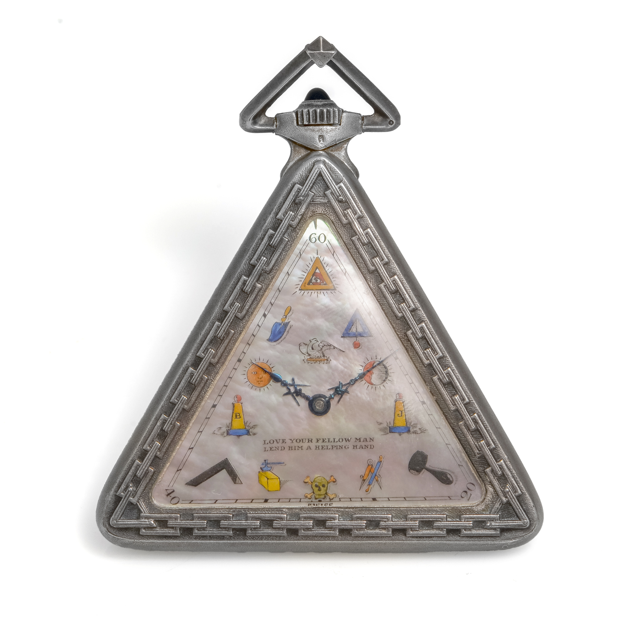 Three-body, triangular, the bezel cast and chased with the Union Chain, the back with the Masonic Temple and symbols. D. Mother of pearl with polychrome painted Masonic symbols in place of numerals and with the inscription: ?Love your fellow man, lend him a helping hand. Blued steel Masonic hands. M. 28 mm., rhodium plated, 15 jewels, straight line lever escapement, cut bimetallic compensation balance with three adjustments, blued steel Breguet balance spring, index regulator. Case and movement signed. Diam. 51