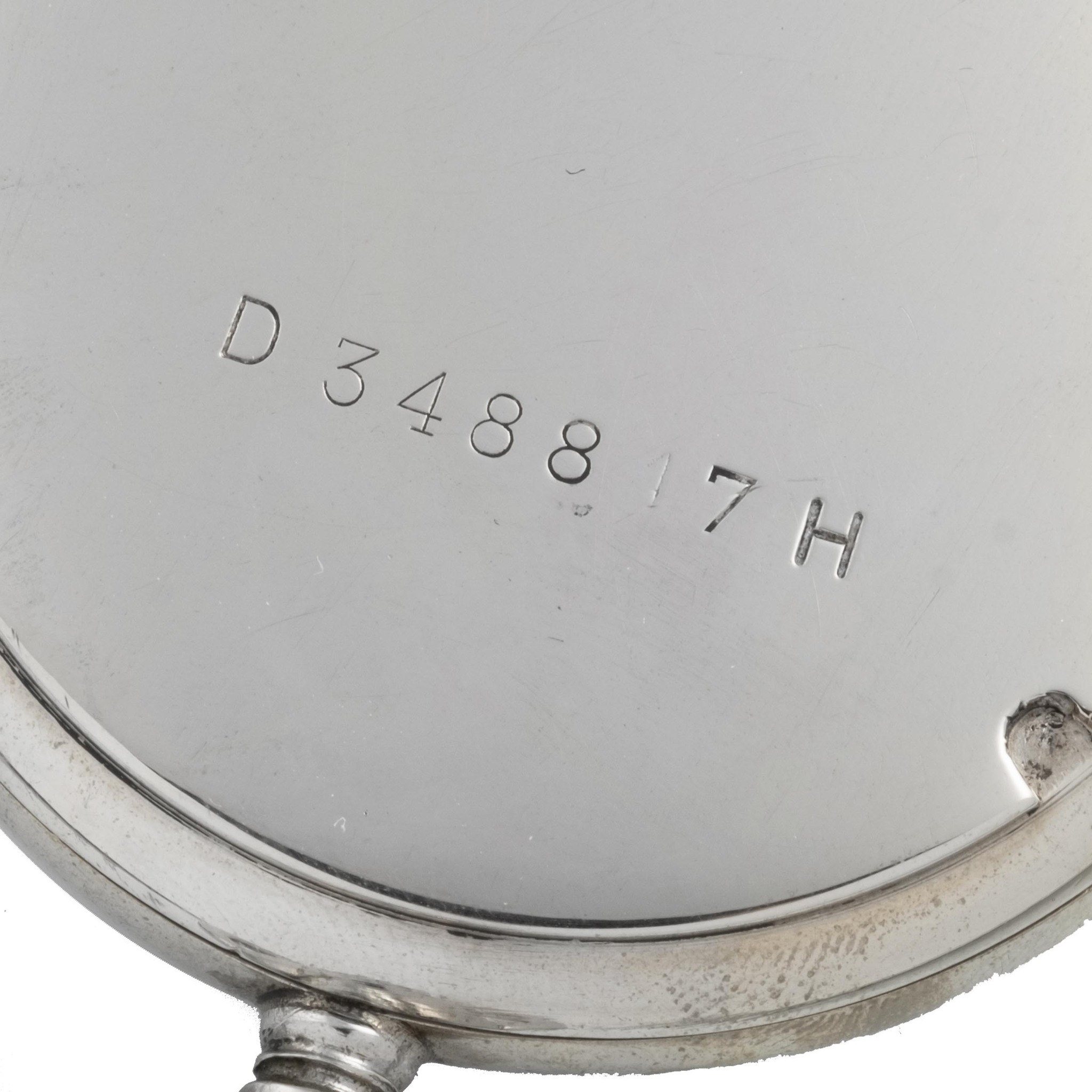 A fine, stainless steel, manual wind open face keyless pocket watch, black dial. The back engraved with German Army registration number D3488H.