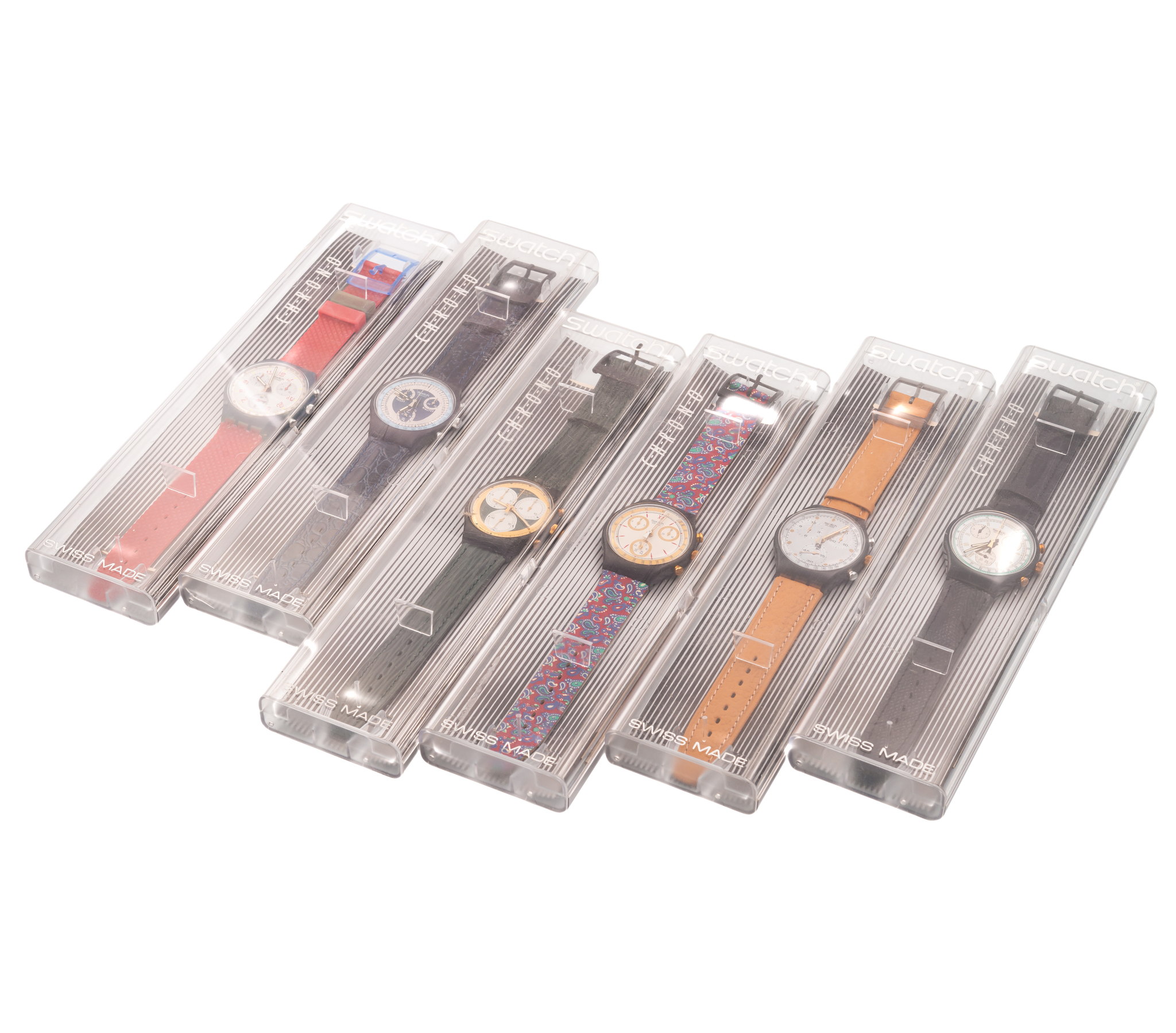 Unusual set of six Swatch chronograph, steel wristwatches quartz