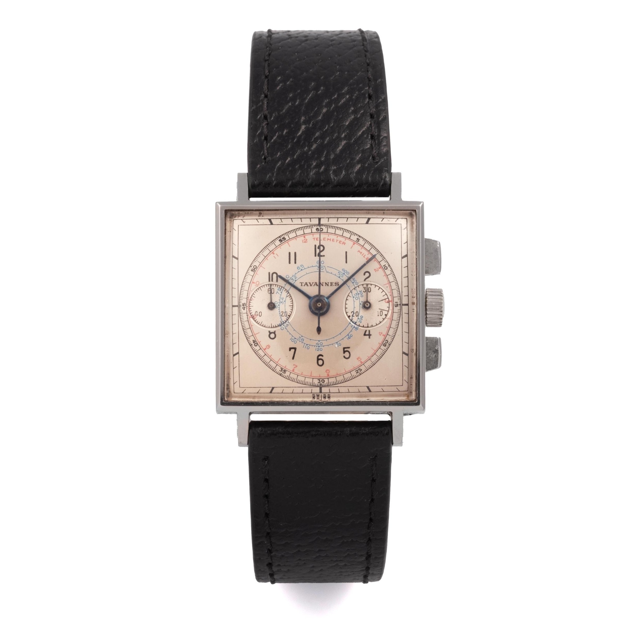 A fine, well-preserved, stainless steel, manual wind square chronograph wristwatch with tachometer and telemeter scale