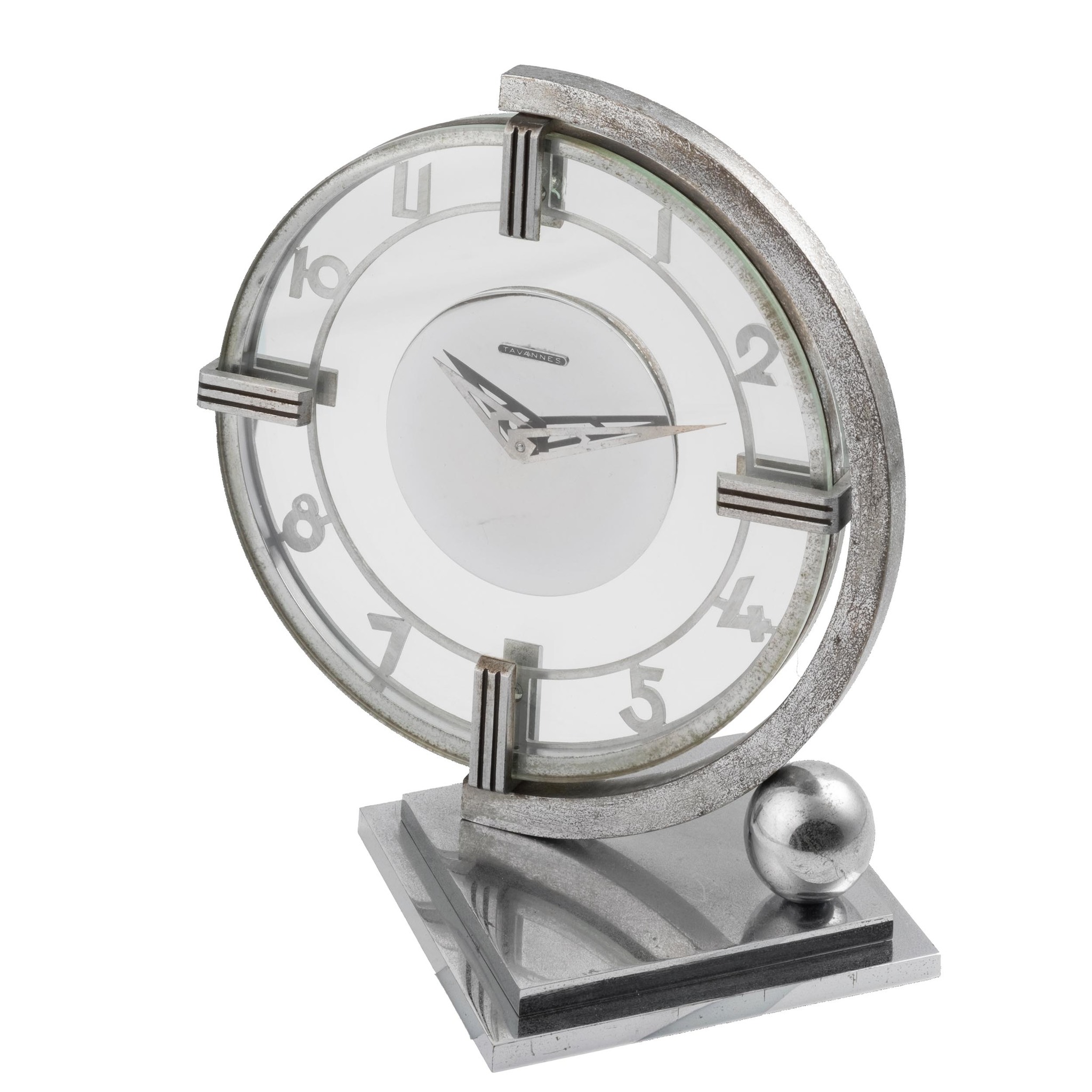 A fine and very rare, chrome plated and glass, manual wind Art Deco desk clock