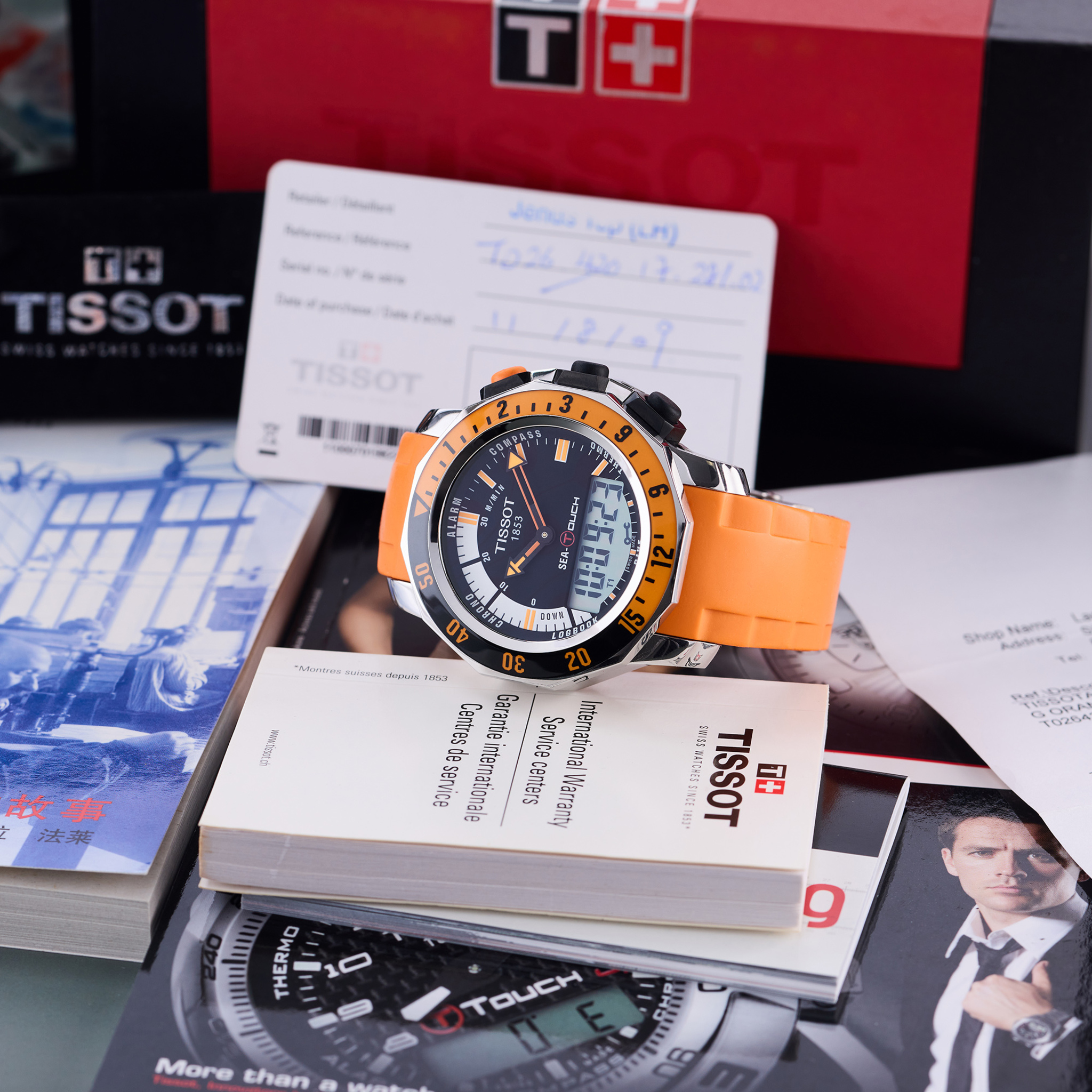 Accessories Tissot fitted box, warranty card dated AUG 2009, instructions booklet, booklets, sale invoice, pouch