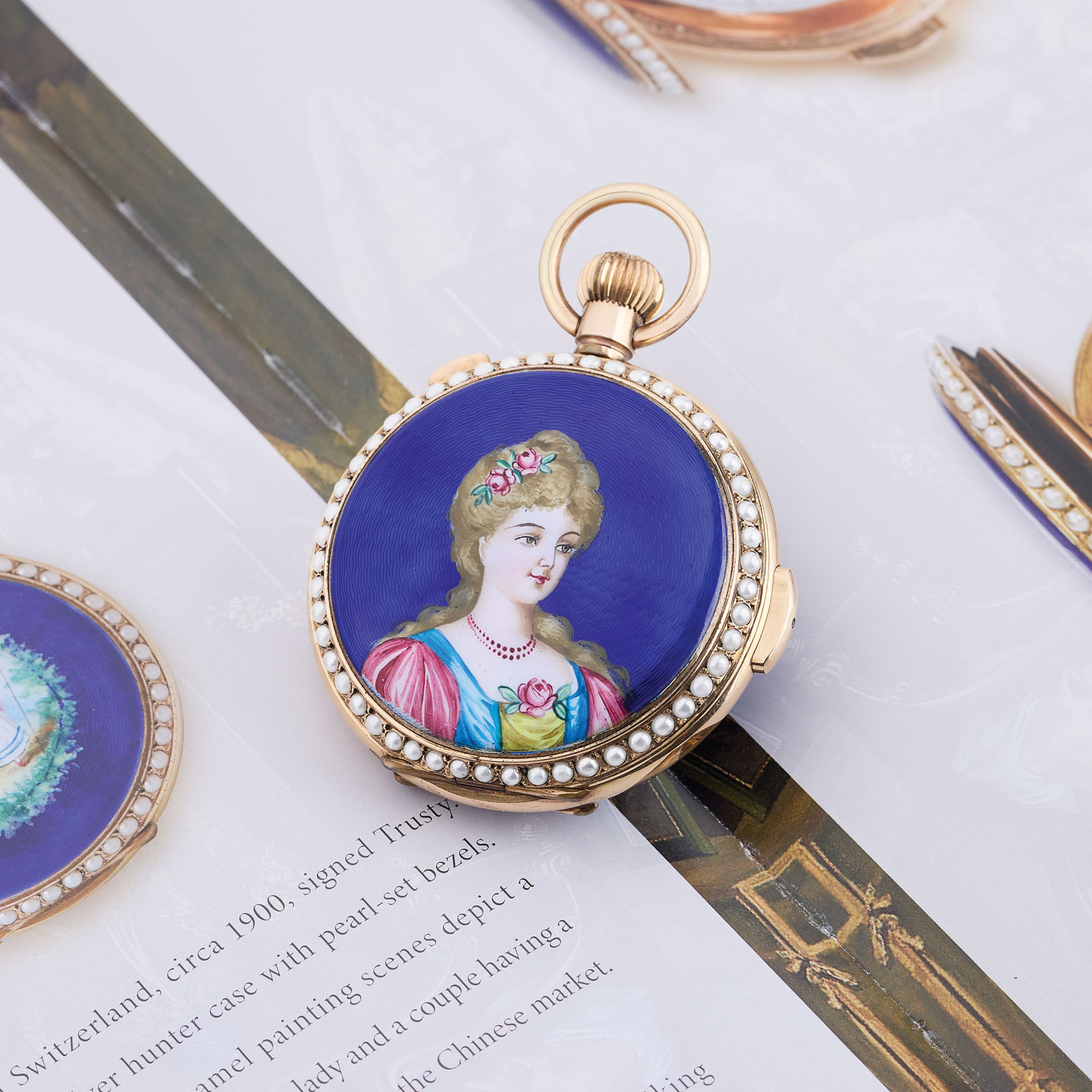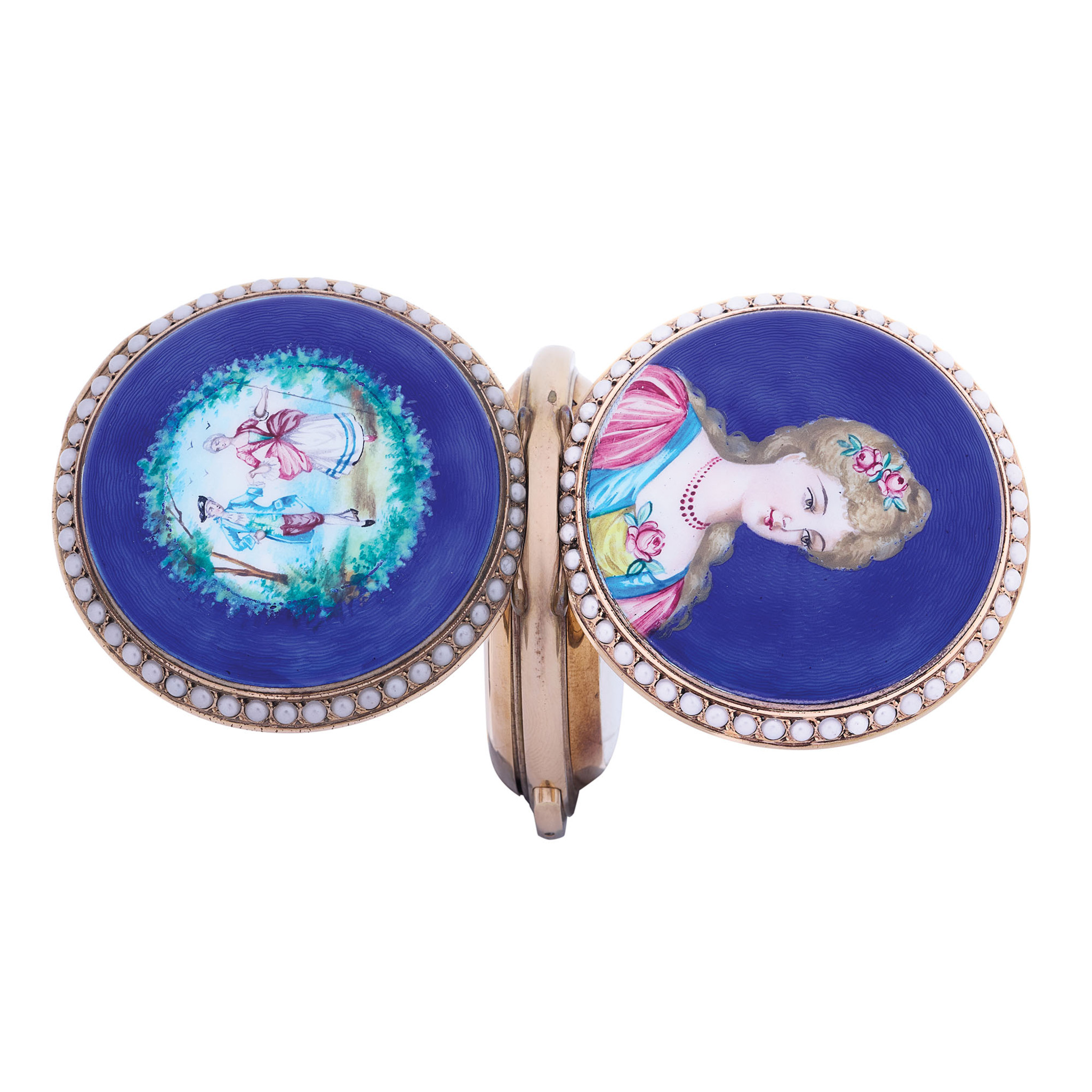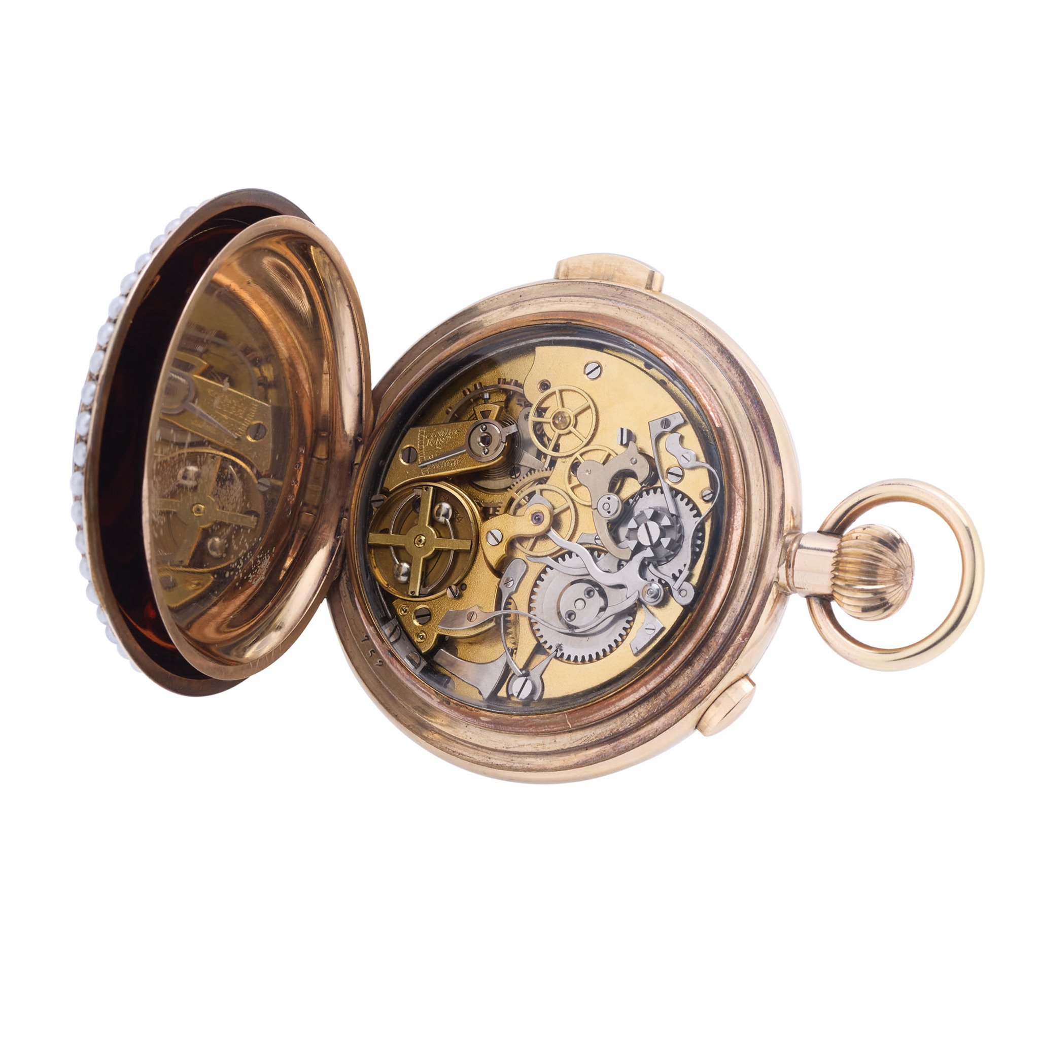 Movement No. 42.8 mm, gilt brass half-plate, straight-line lever escapement, monometallic balance, Breguet balance spring, visible chronograph works, silent, centrifugal repeater train regulator, repeating on gongs by depressing a pushbutton at 6 o’clock.