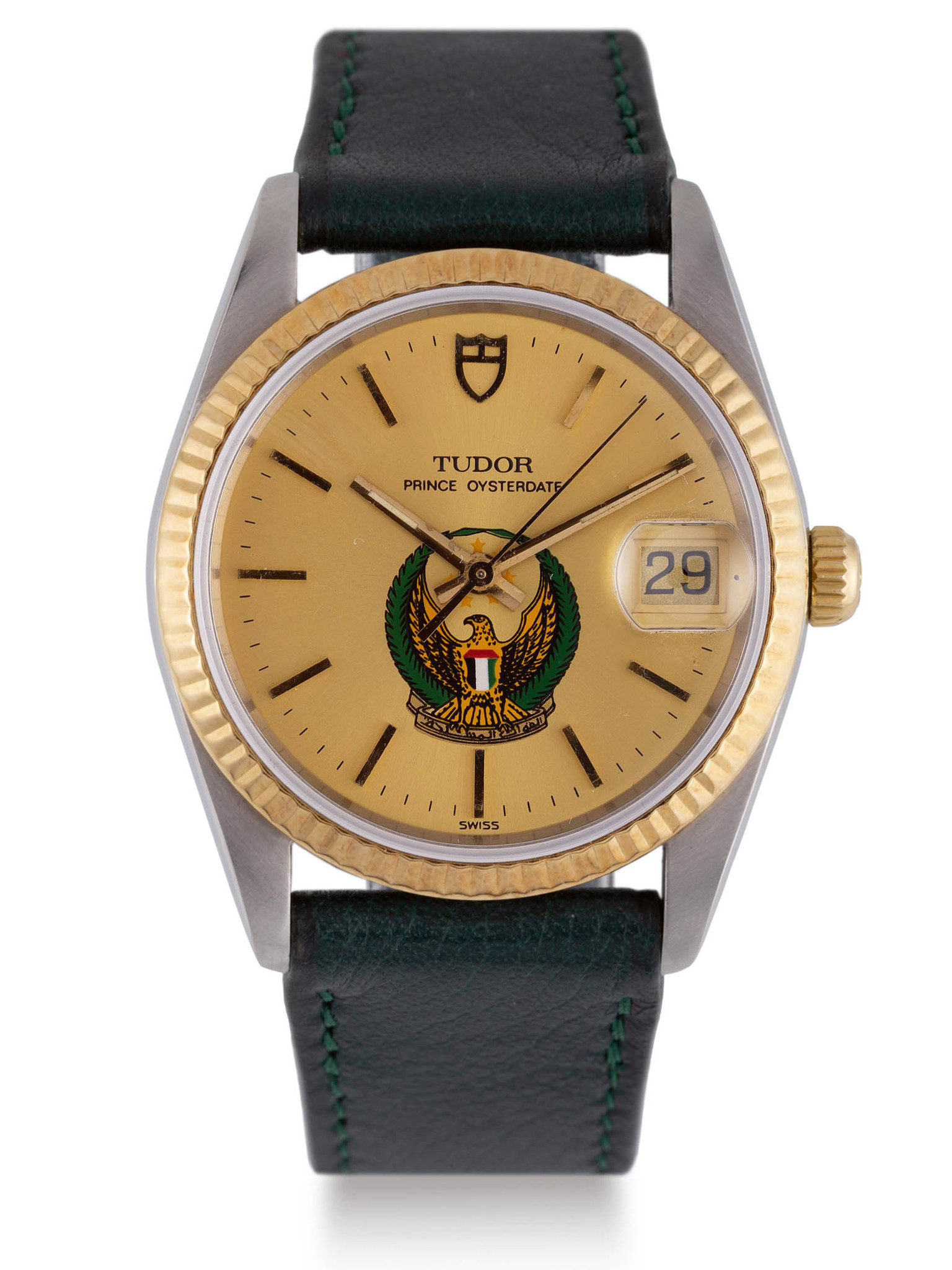 TUDOR PRINCE OYSTER DATE IRAQI EAGLE STEEL AND GOLD Fine and rare stainless steel and gold self-winding wristwatch with date. Belle montre bracelet en or et acier. Bo îtier rond. Couronne et fond vissés. Lunette or striée. Cadran champagne avec dateur à 3 heures. Trotteuse centrale. Mouvement automatique.