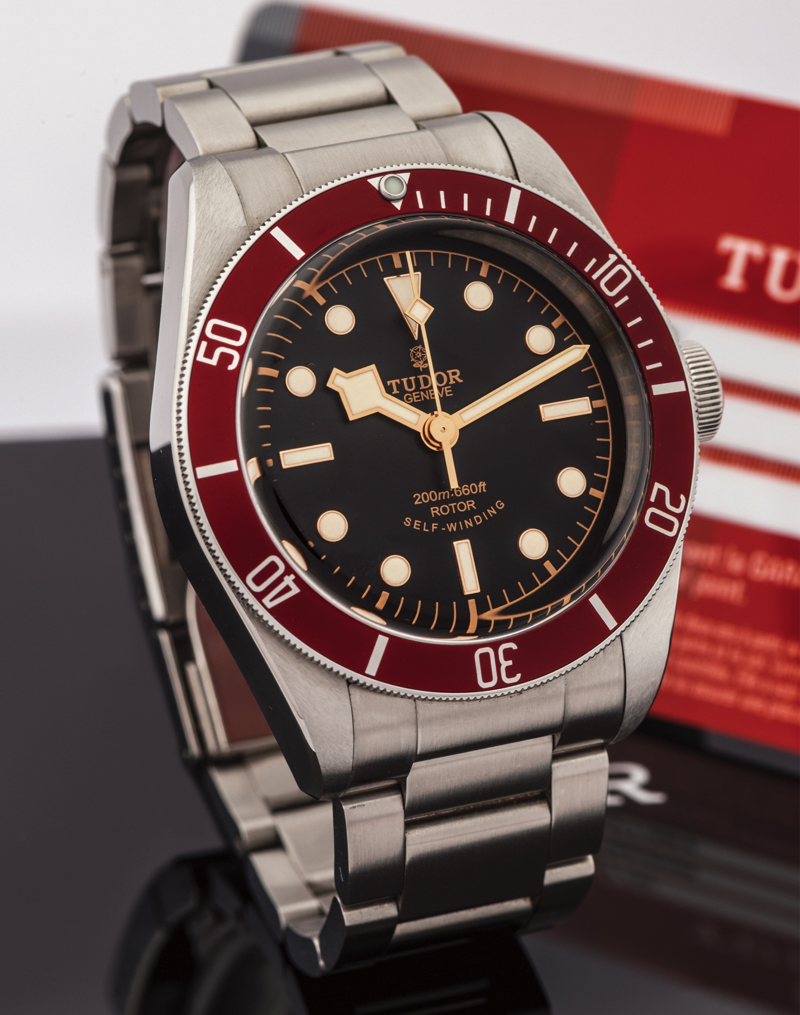 TUDOR REF. 79220R HERITAGE BLACK BAY STEEL Tudor, Geneve, "Black Bay" Rotor Self-Winding 200 m : 660 ft, case No. J921384, Ref. 79220R. Made in 2013. Fine, center seconds, self- winding, water resistant to 200 m, stainless steel wristwatch. Accompanied by the original warranty card, fitted box, Tudor deployant clasp and booklet.