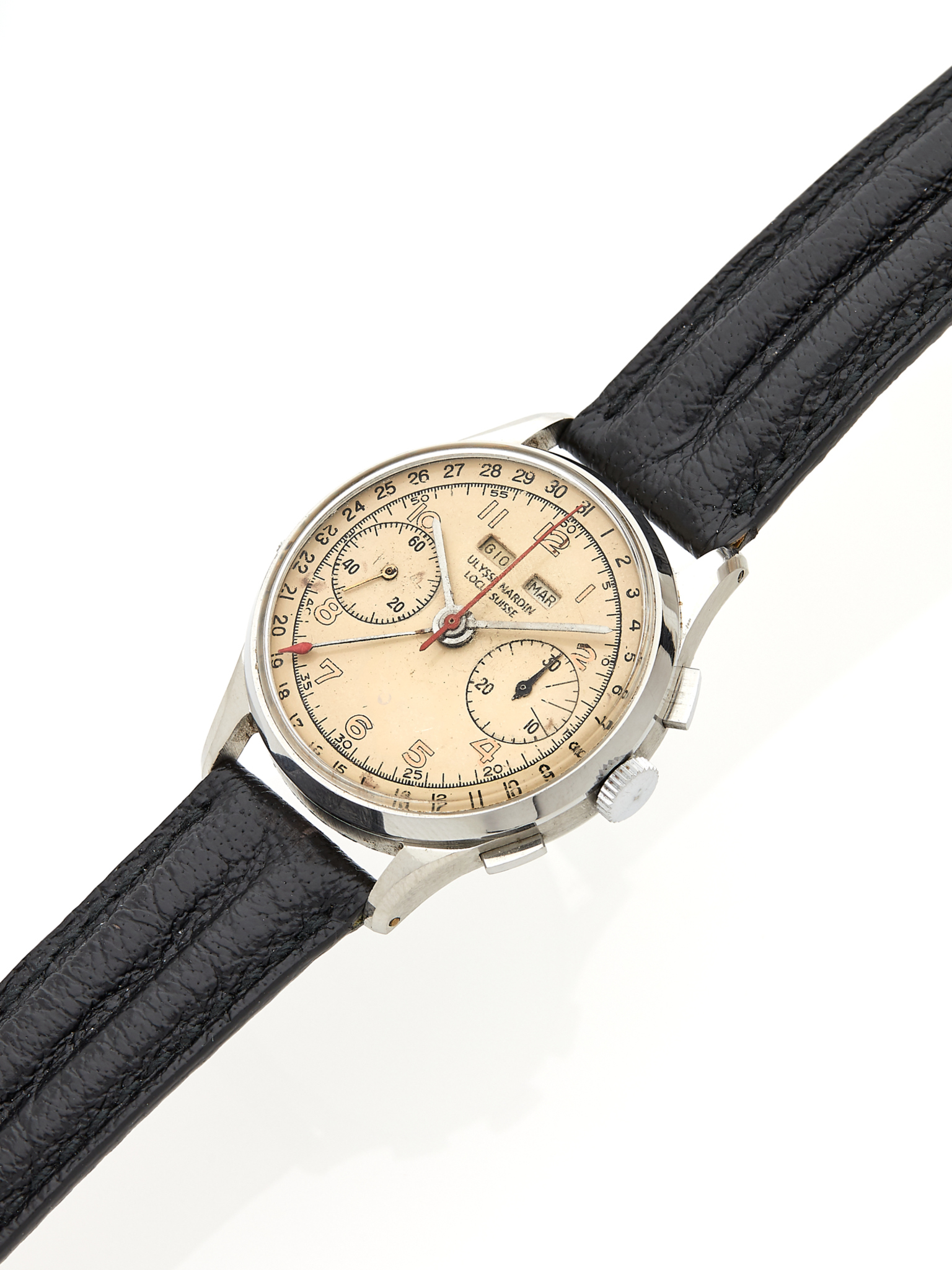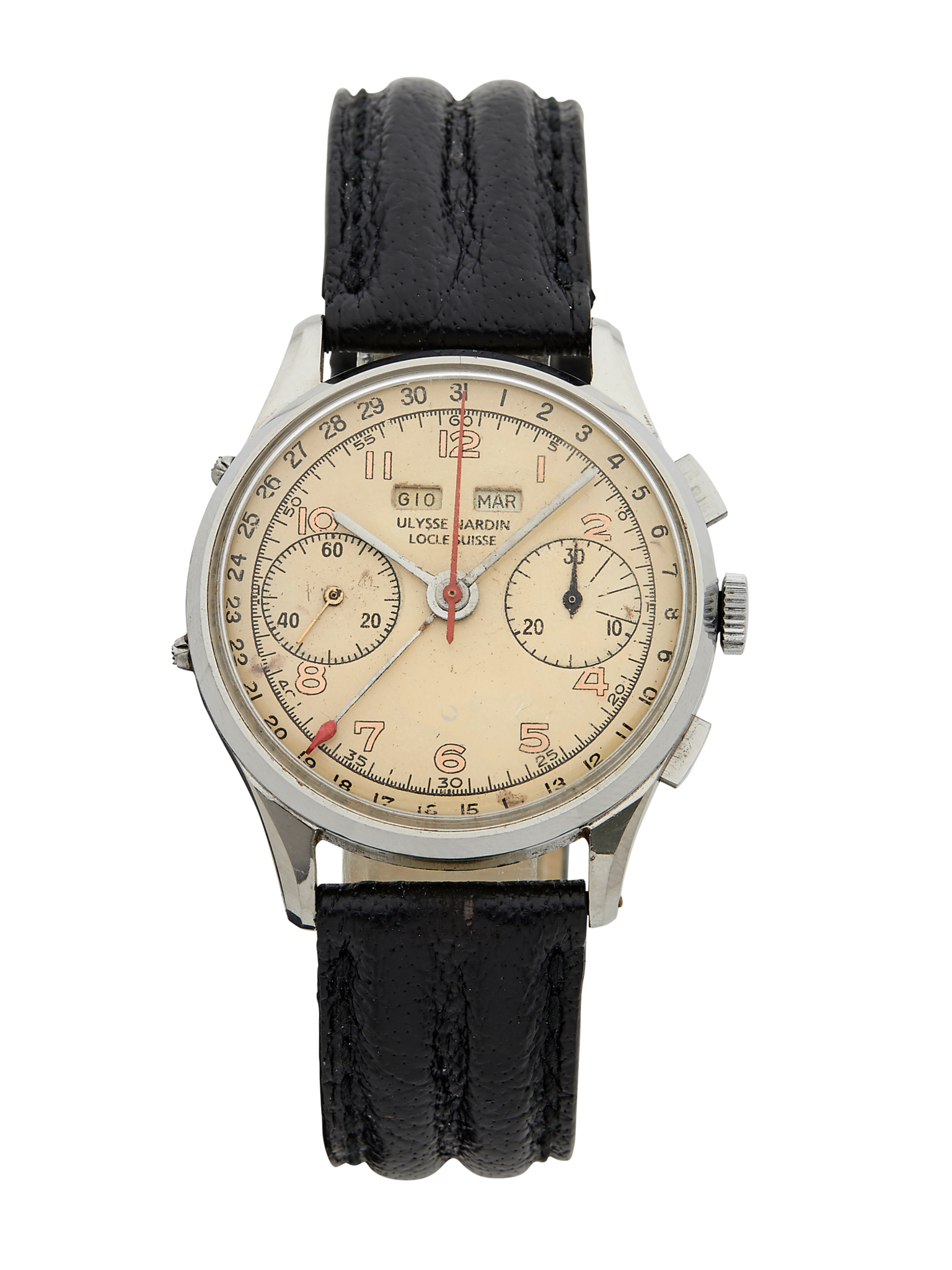 Fine and rare stainless steel manual winding chronograph wristwatch with cream dial. Day, date and month