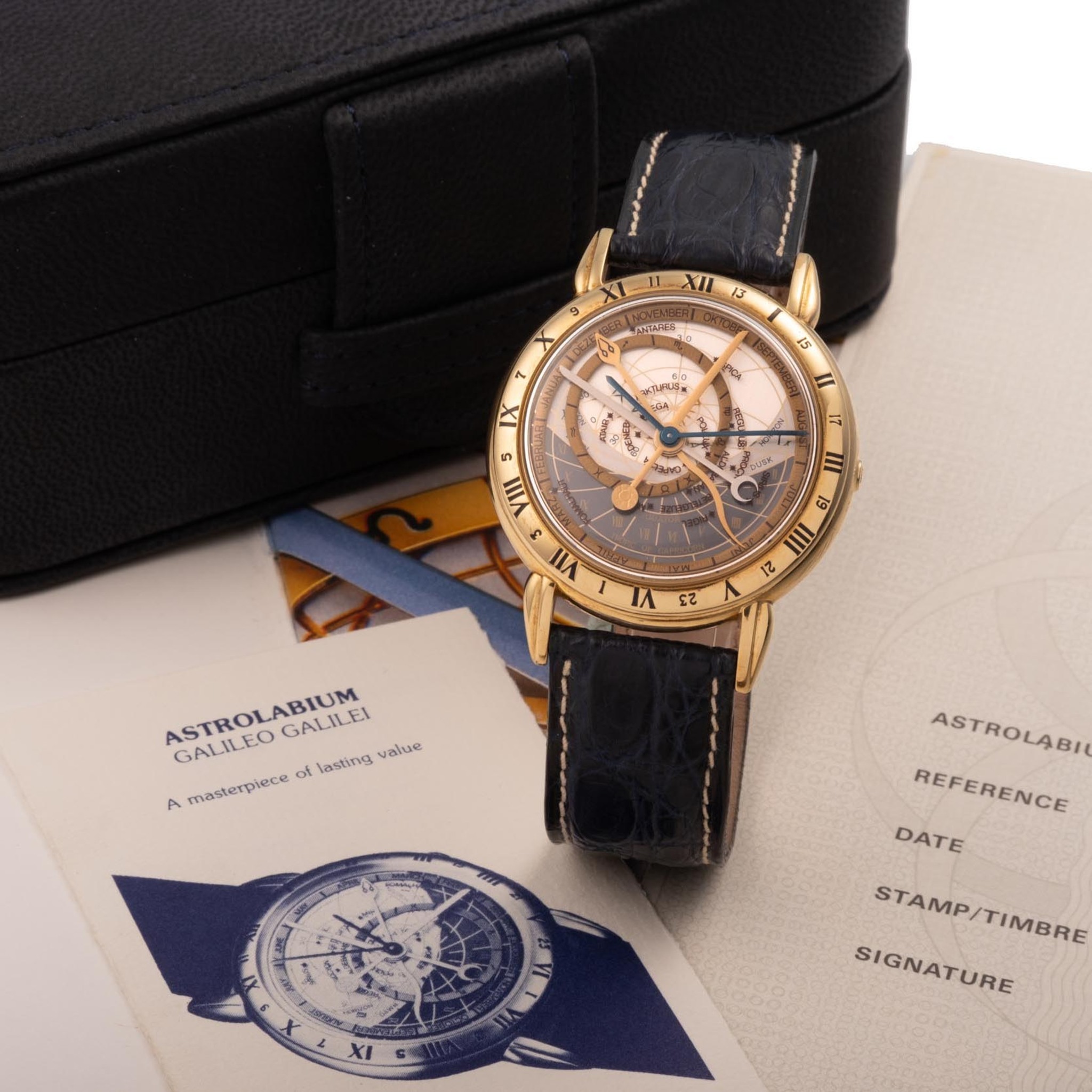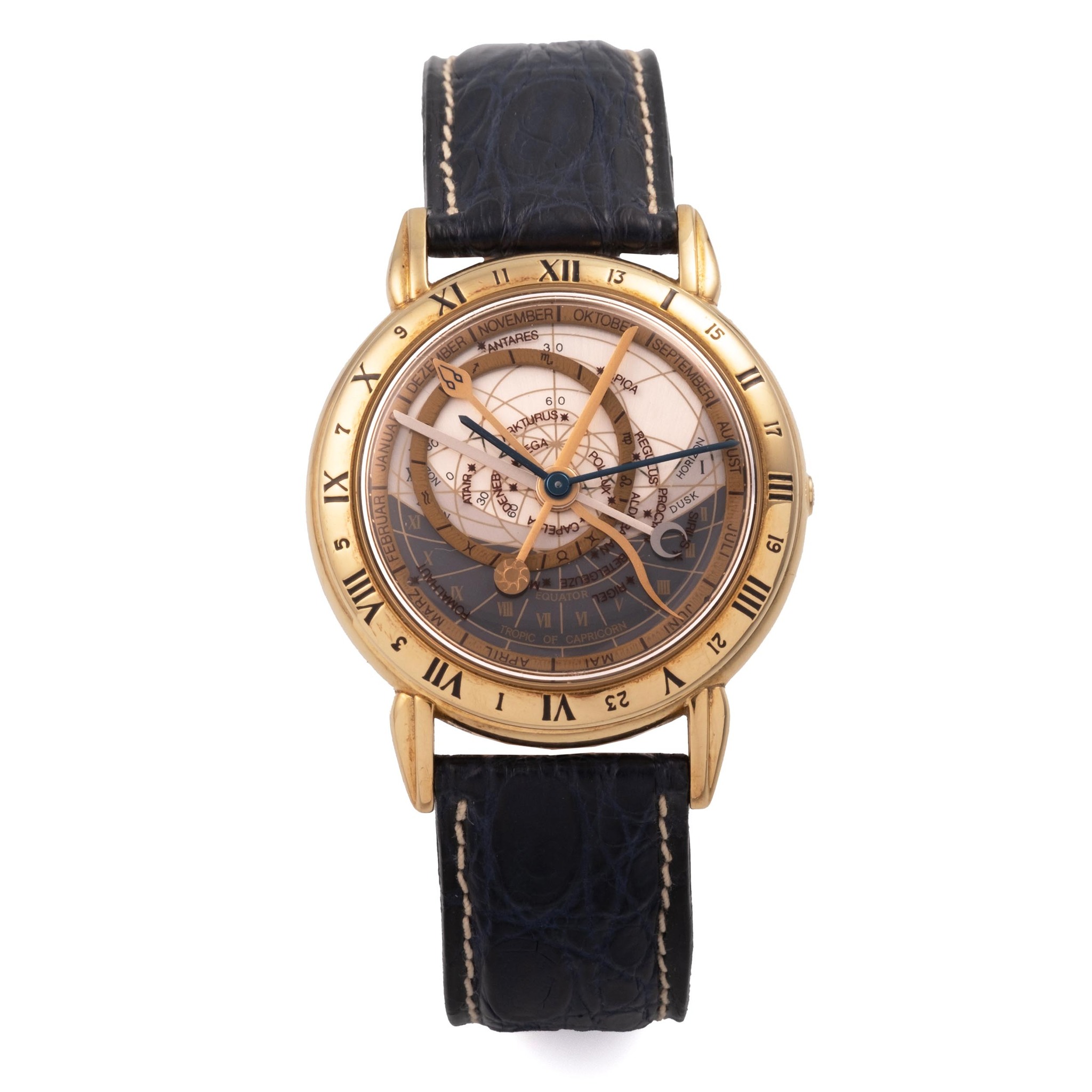 A fine, complicated, 18k yellow gold, self winding astronomic, water resistant, wristwatch with functions of the planetary cycle, days, months, zodiac signs and moon phases.