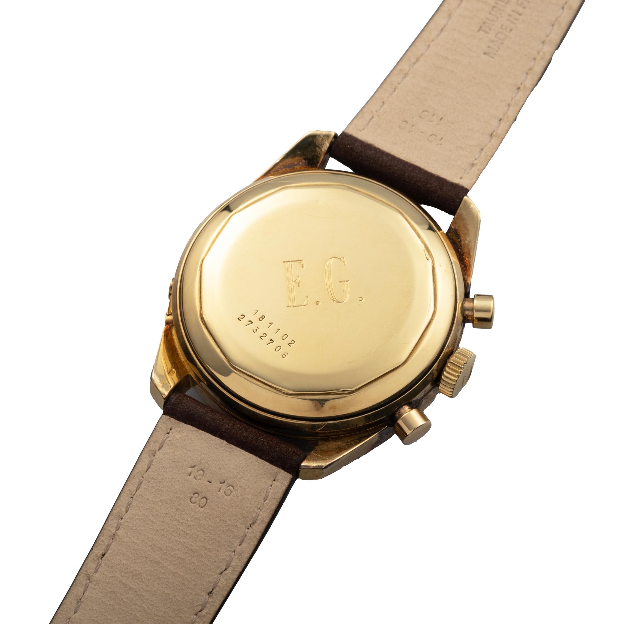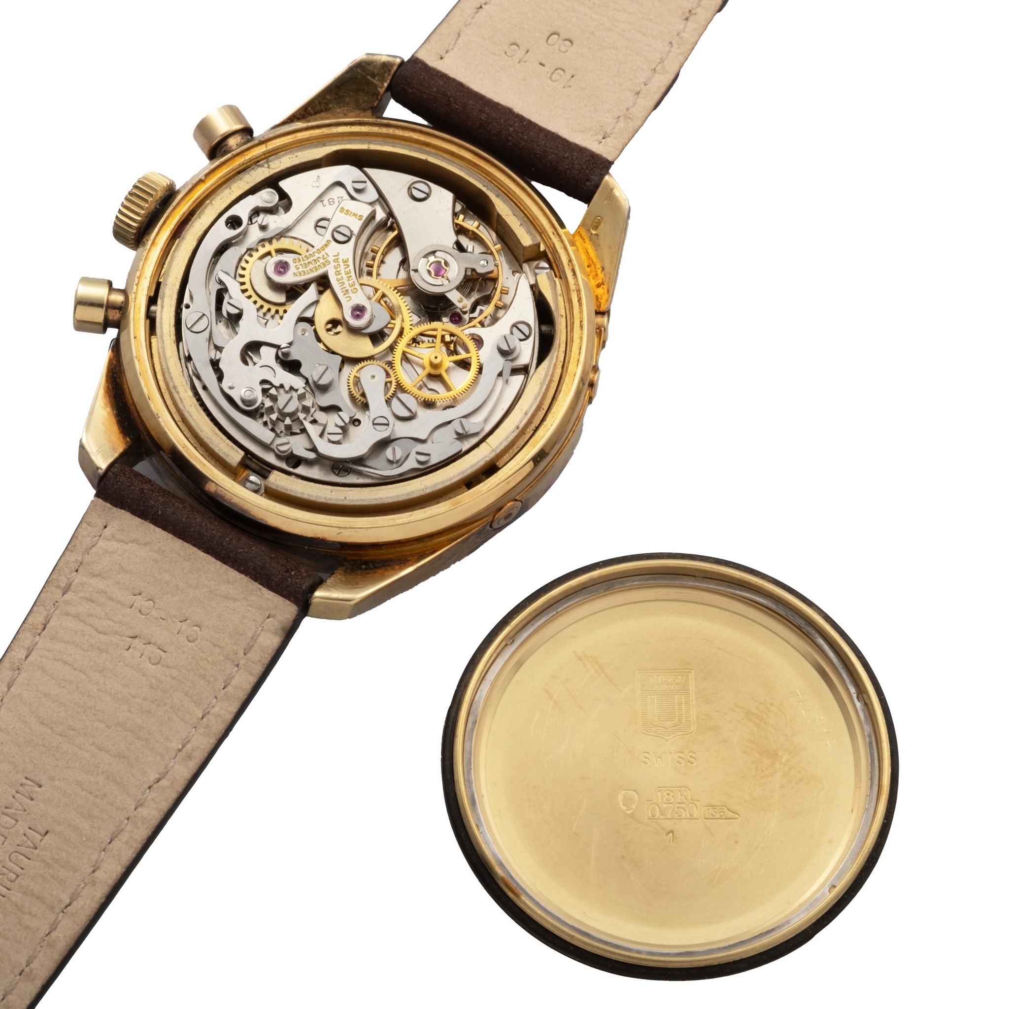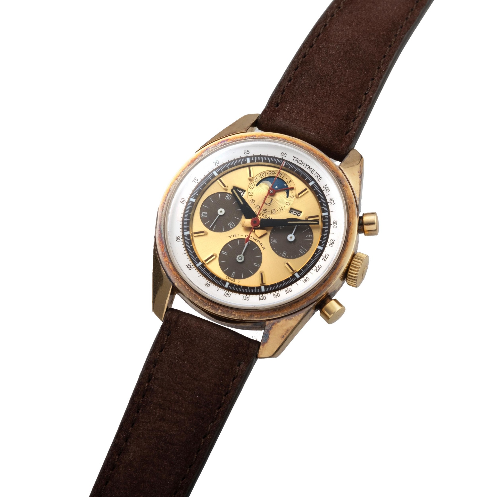 A fine, large and very rare 18k yellow gold chronograph wristwatch with gold dial, 3 brown registers and tachometer scale, day, date and moon phases