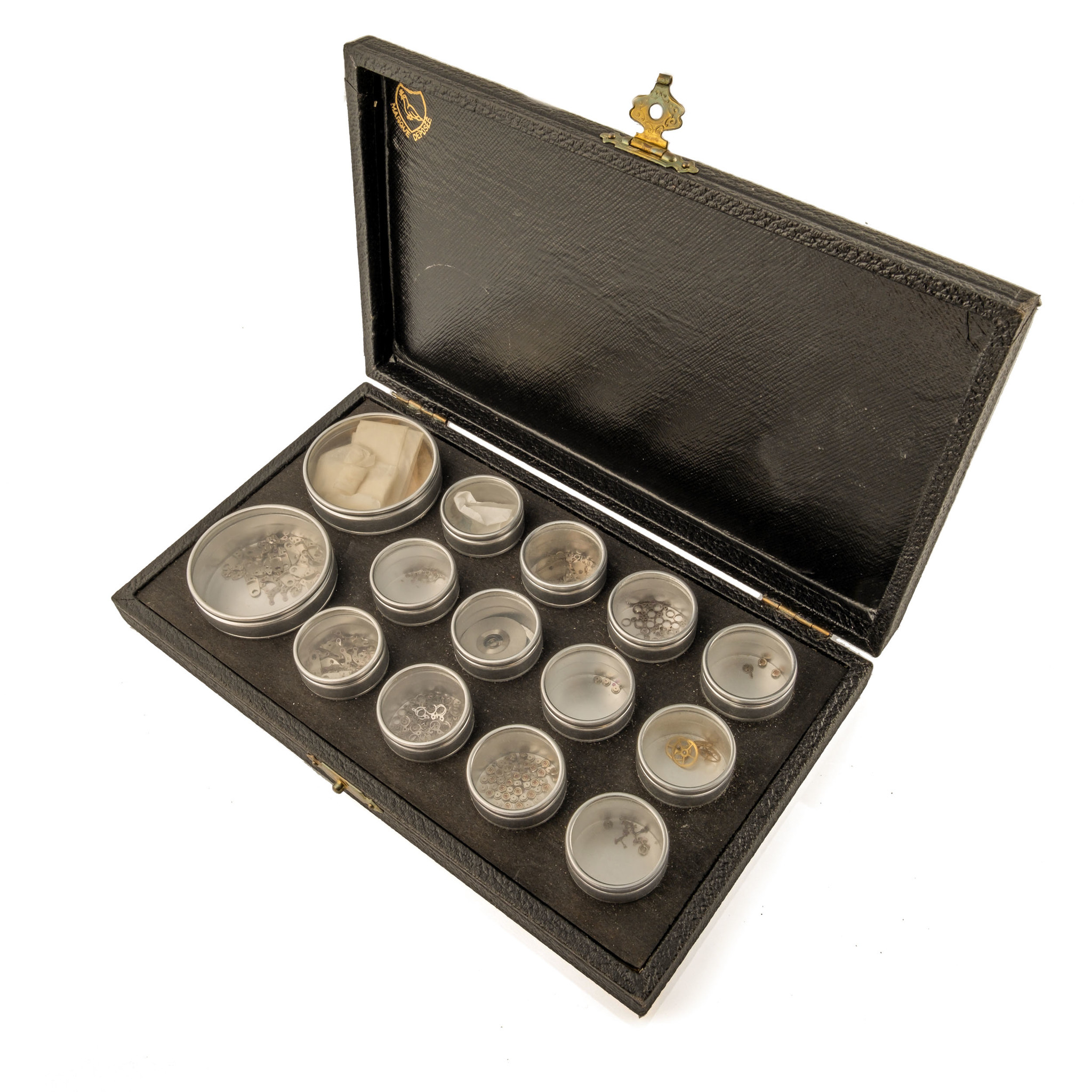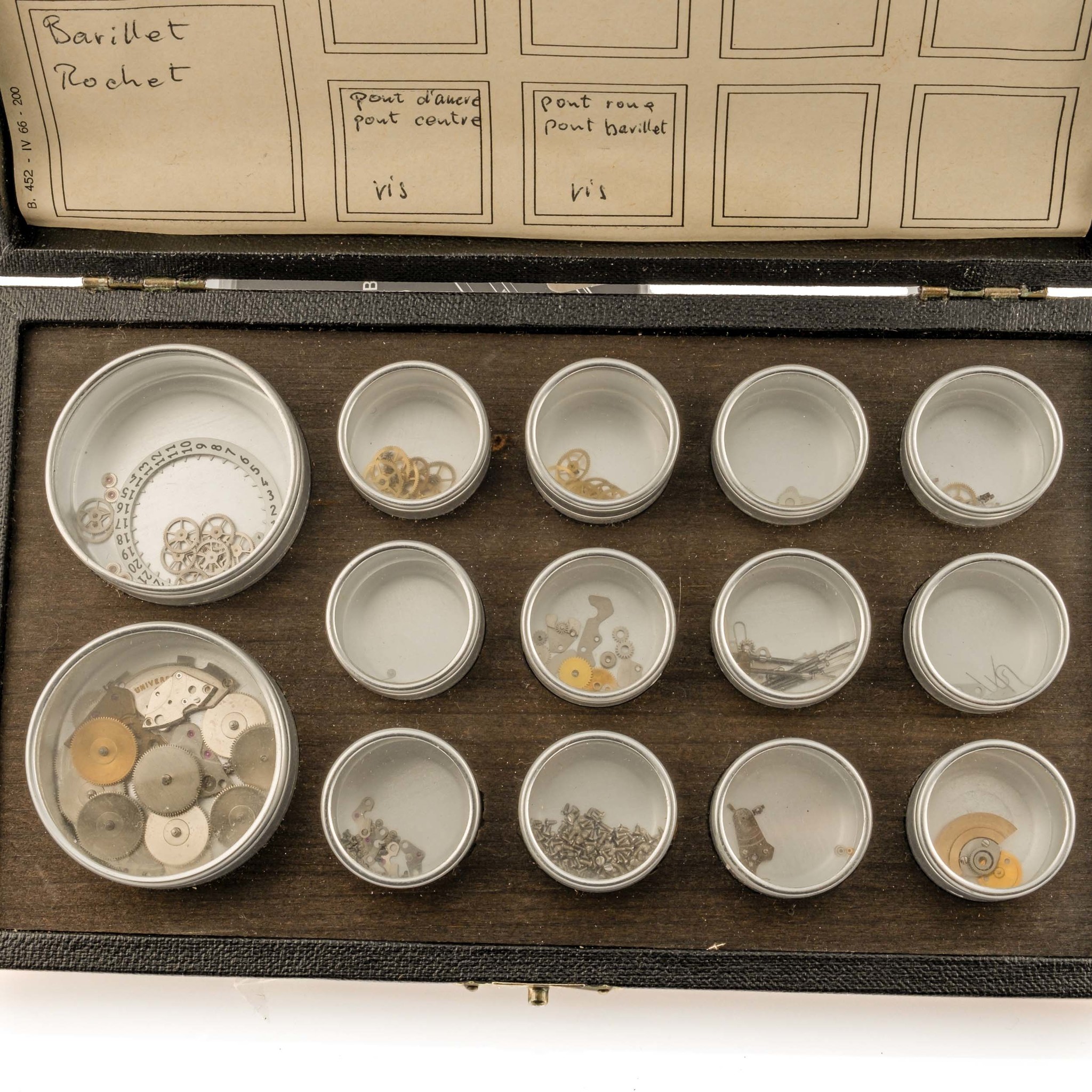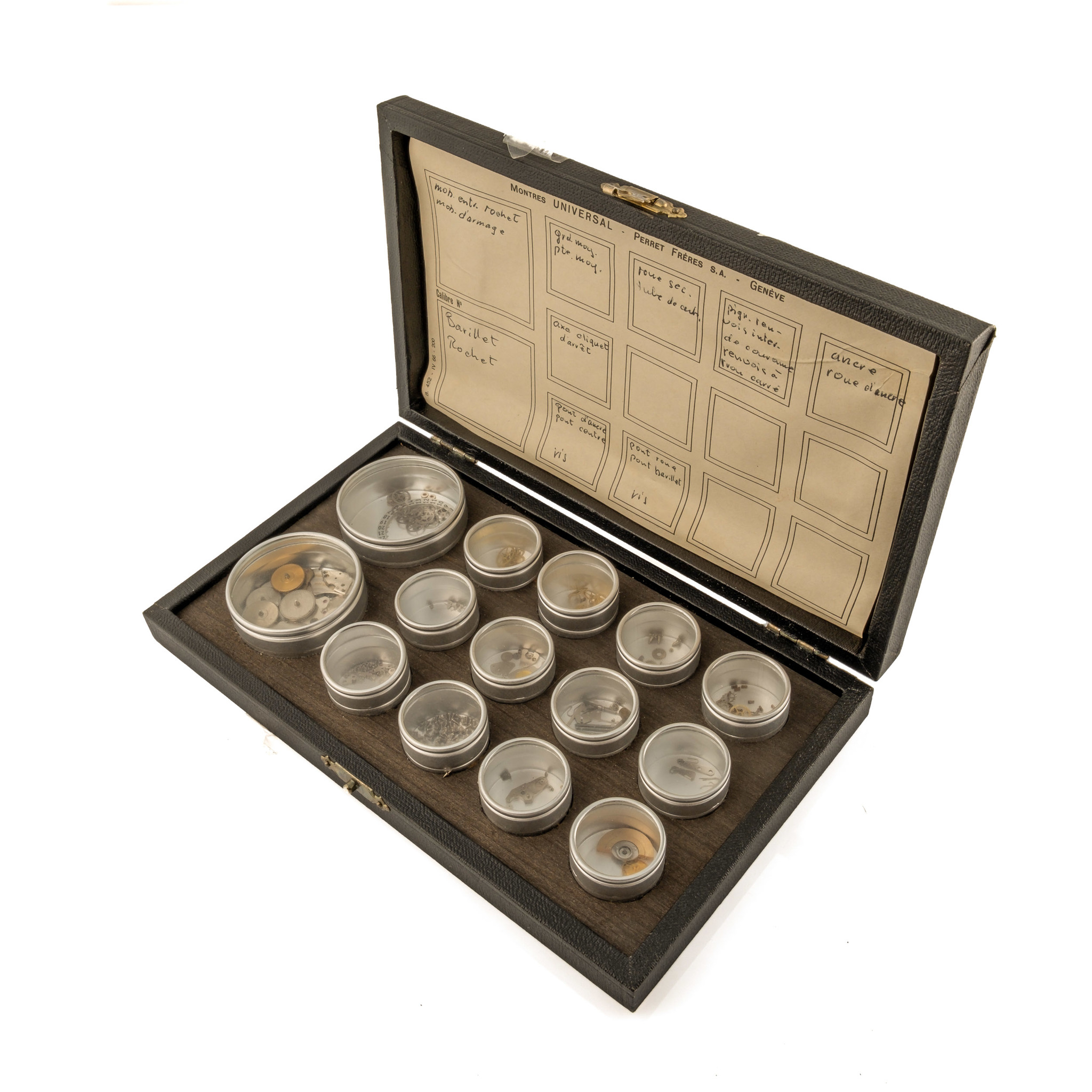 A lot of three boxes of spare parts for various Universal wristwatches calibres (including Cal. 2-66 and Cal. 2-67).
