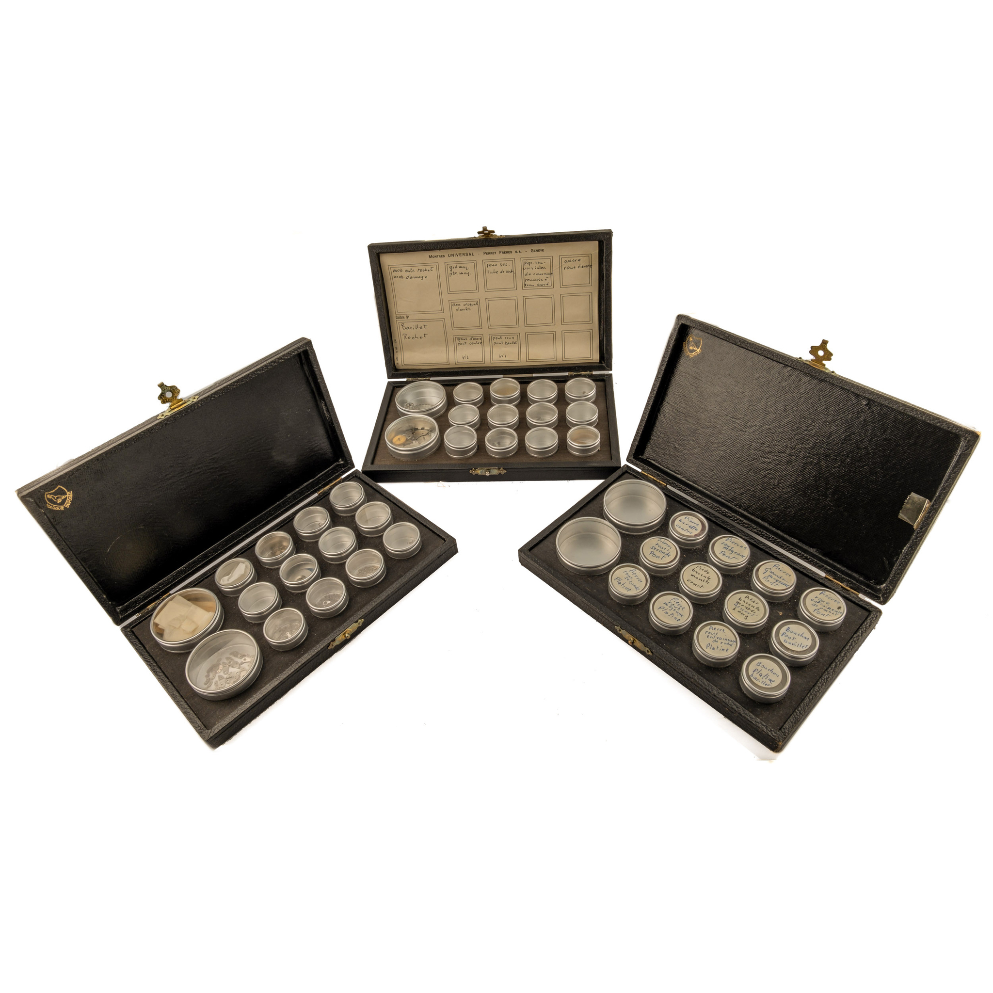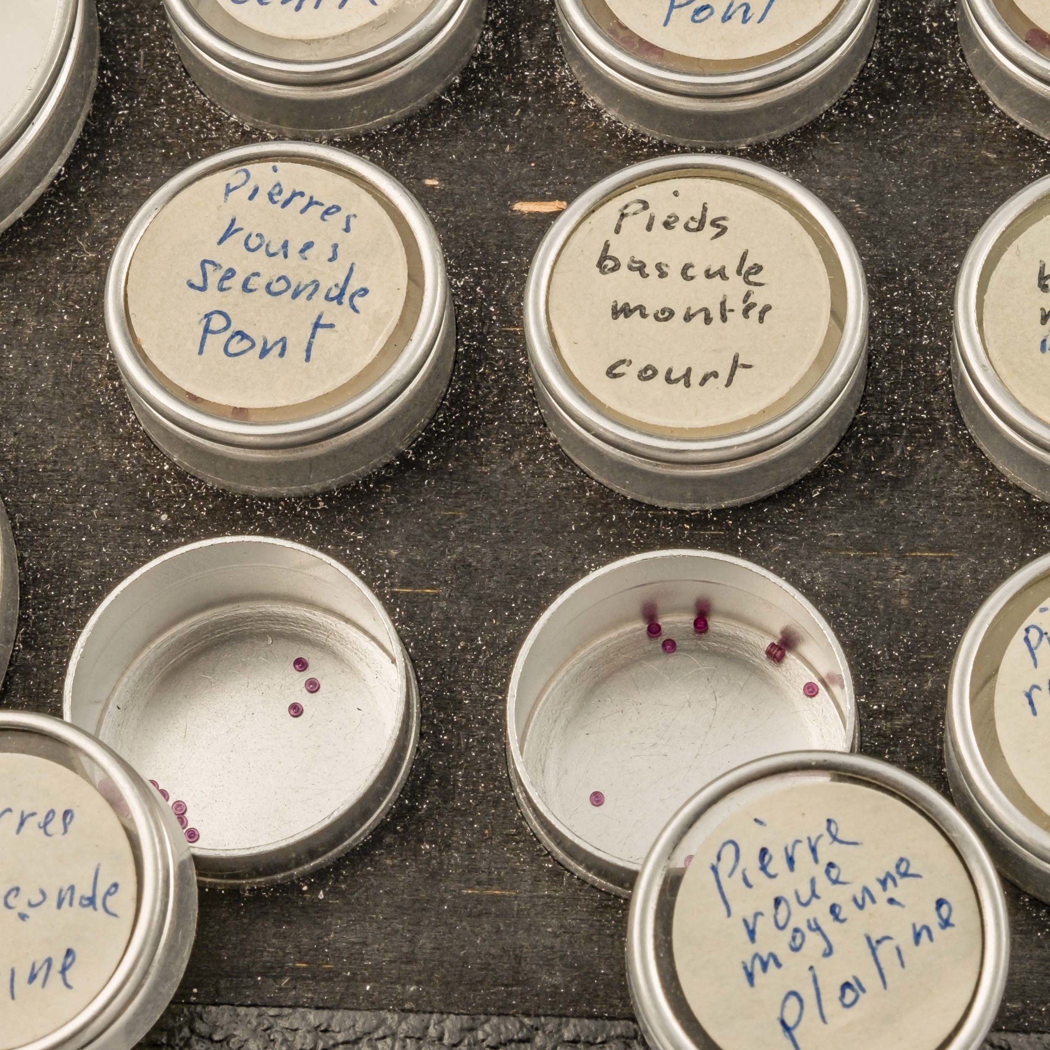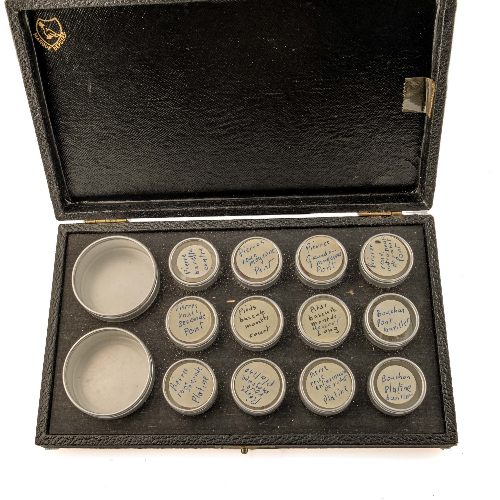 A lot of three boxes of spare parts for various Universal wristwatches calibres (including Cal. 2-66 and Cal. 2-67).