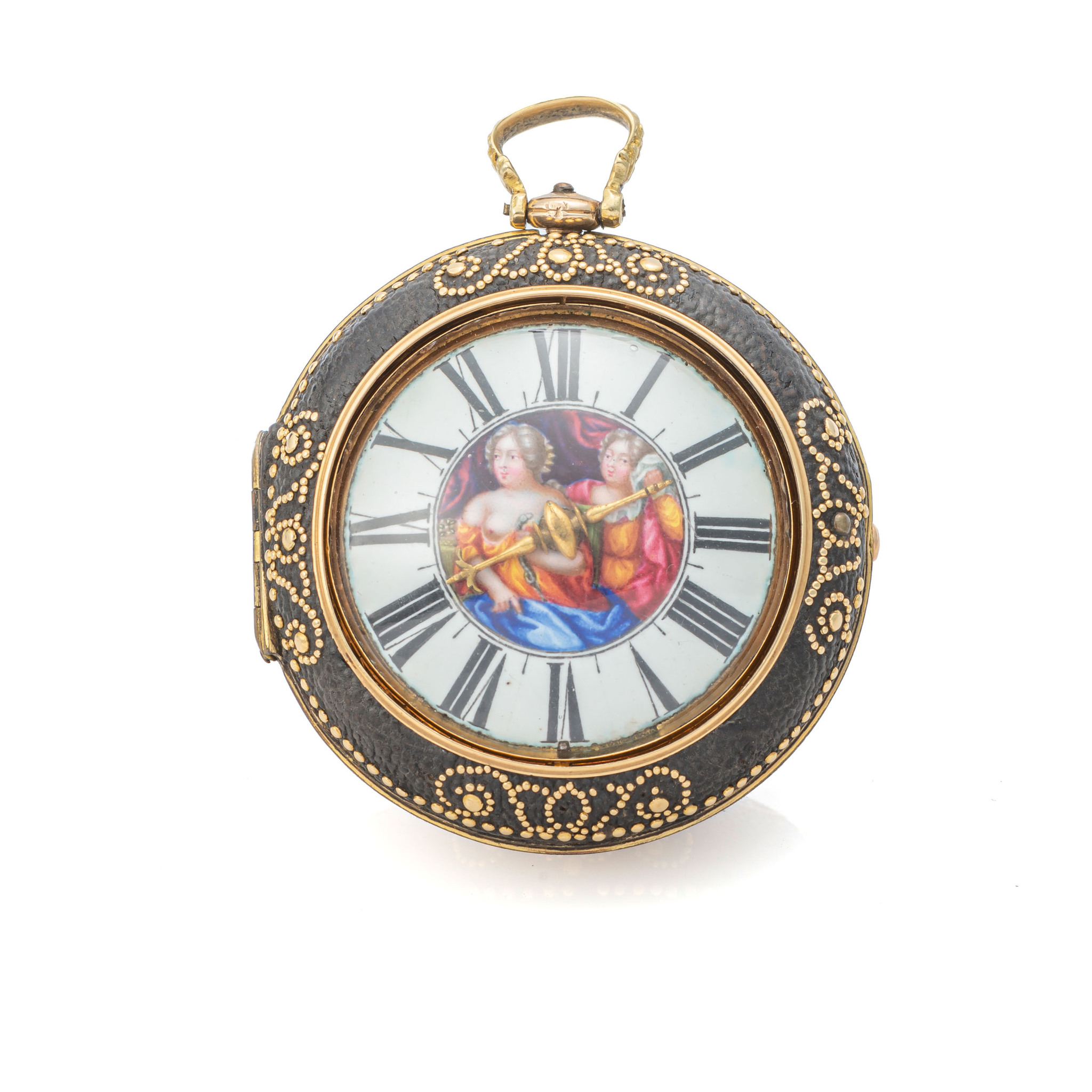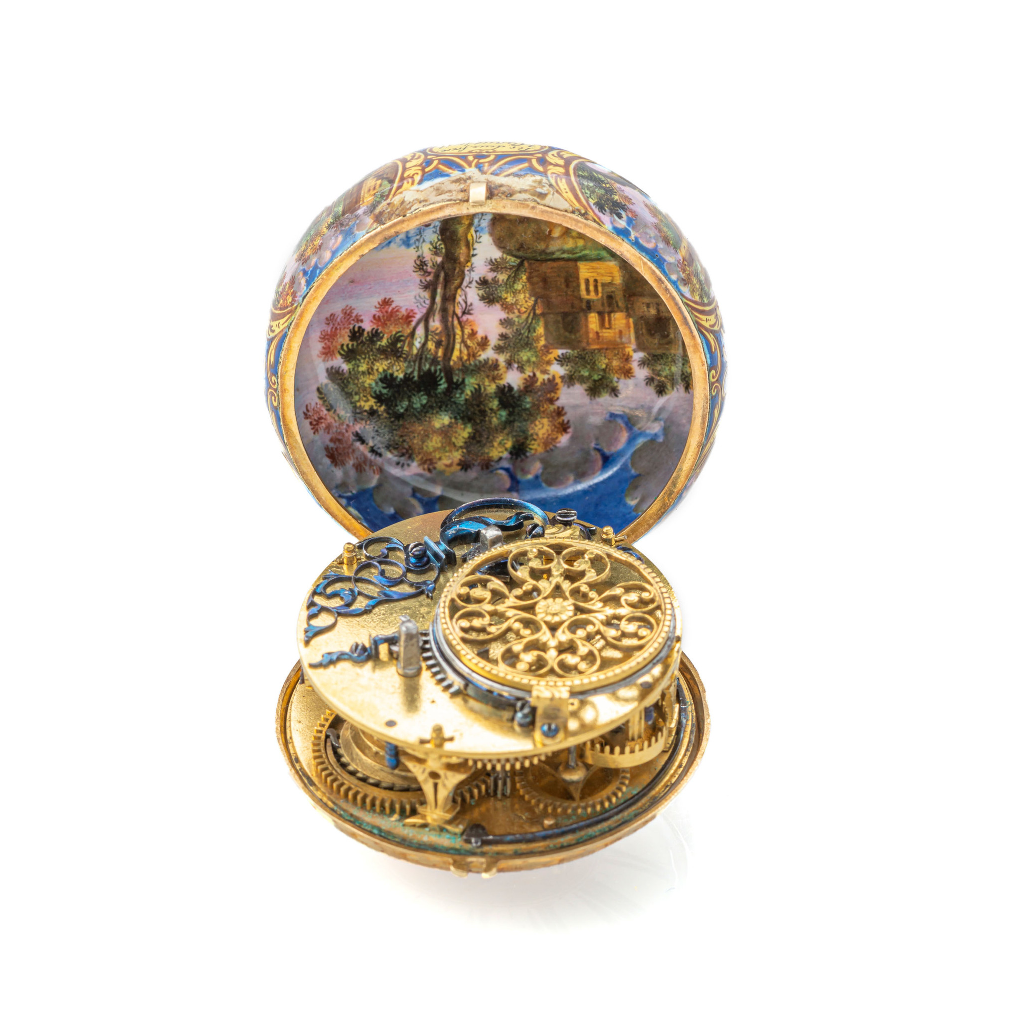 Caliber 14’’’, Fine gilt brass full plate movement with pierced tulip pillars, fusee and chain, three-wheel train, verge escapement with a three-armed steel balance, short early balance spring with rack adjustment, giIt brass cock pierced and engraved in such a way the balance spring can be seen easily, mainspring tension adjusted by a worm screw.