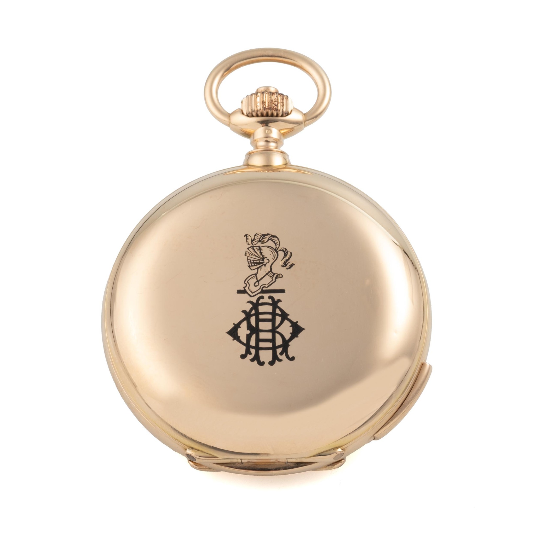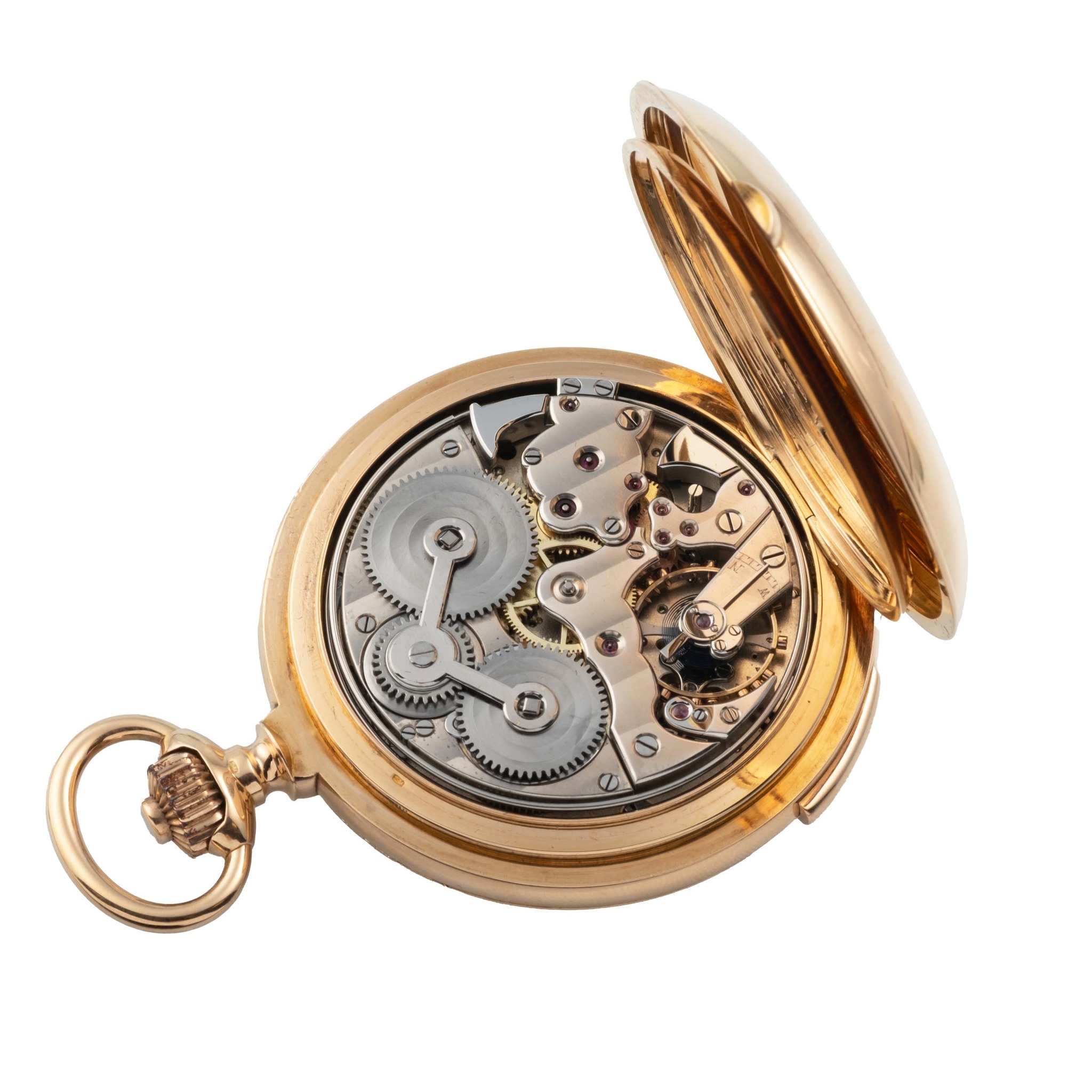 A very fine and rare, 18k gold, manual wind hunting-case, keyless-winding, pocket clock-watch, with subsidiary seconds at 6. Minute-repeater on two steel gongs by two hammers (activated by slide at 6 o’clock). Grande Sonnerie (position lever of “Silence” and “Sonnerie” at 12 o'clock). Twin-barrel differential-winding.