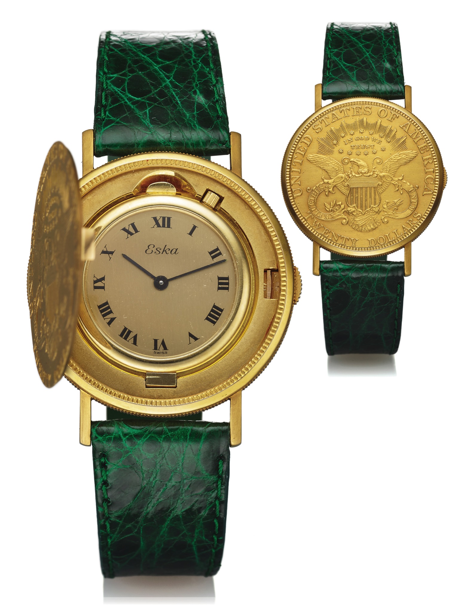 ESKA TWENTY U.S. DOLLAR QUARTZ COIN WRISTWATCH YELLOW GOLD Eska, Swiss, coin watch with concealed dial. Made in the 1990s. Fine, 18K yellow gold, thin, coin quartz wristwatch set into a 20 Dollar U.S. gold coin dated 1904.