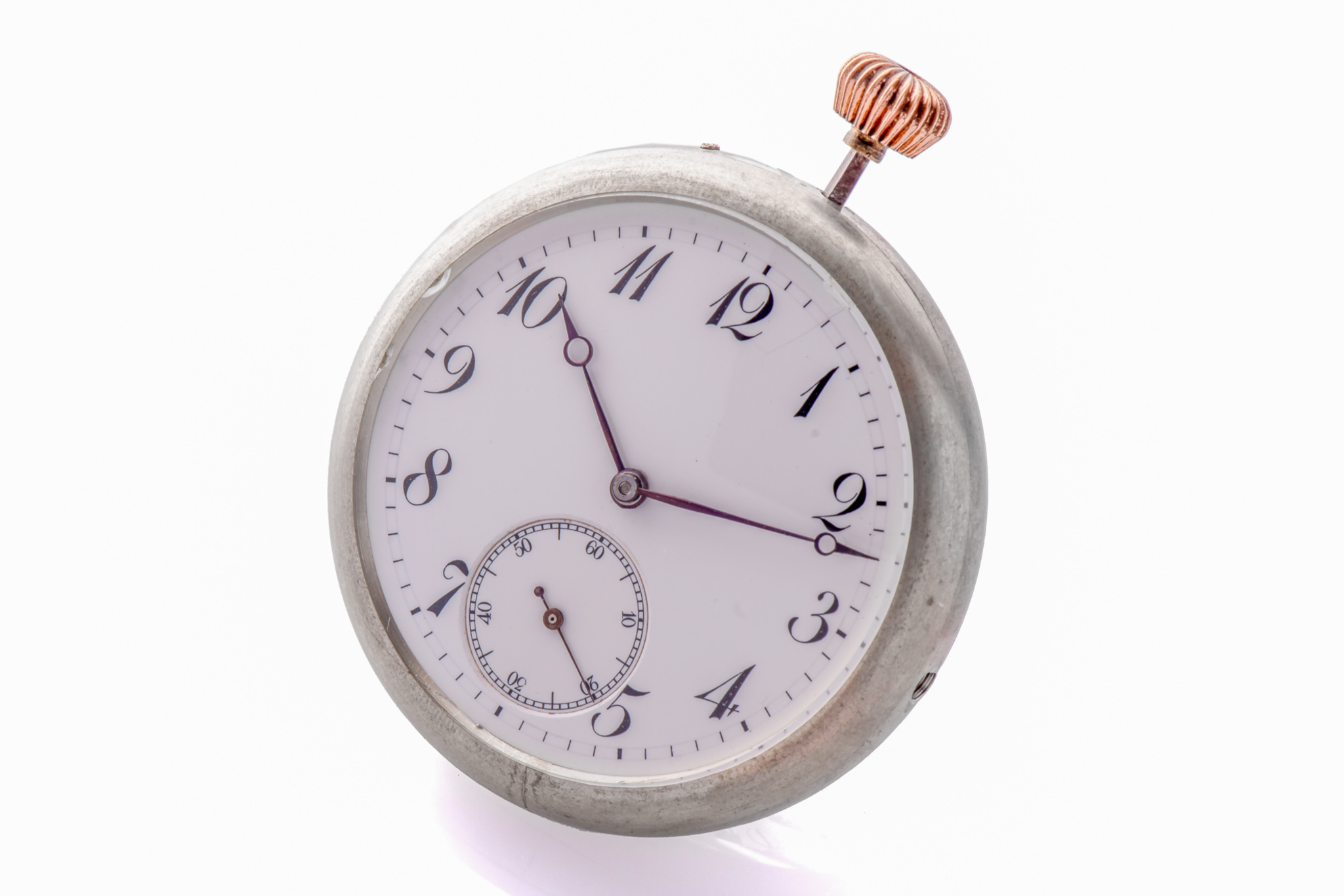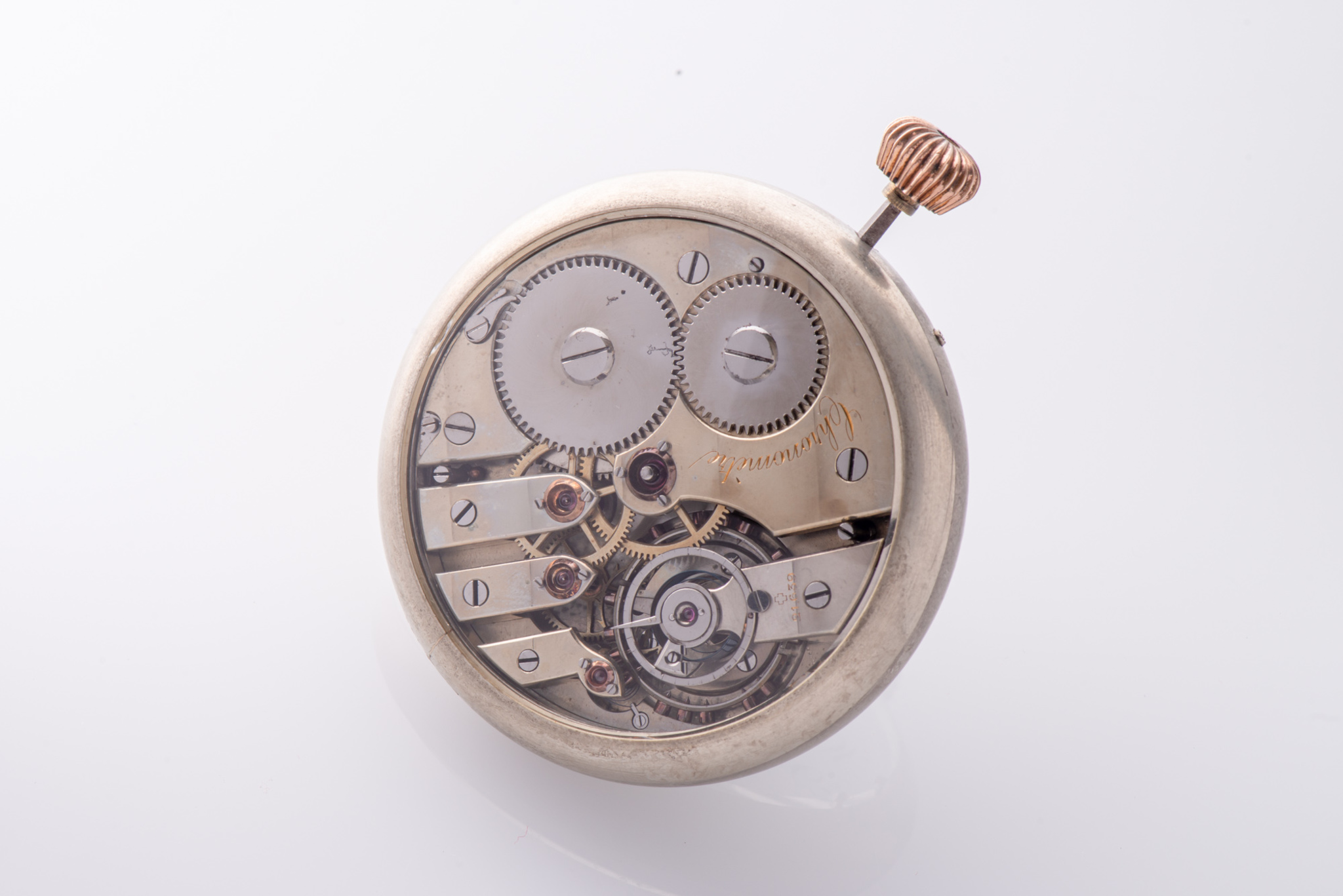 White metal, open-face, keyless-winding, round-shaped, pocket chronometer movement in a working-case, with subsidiary seconds at 6.