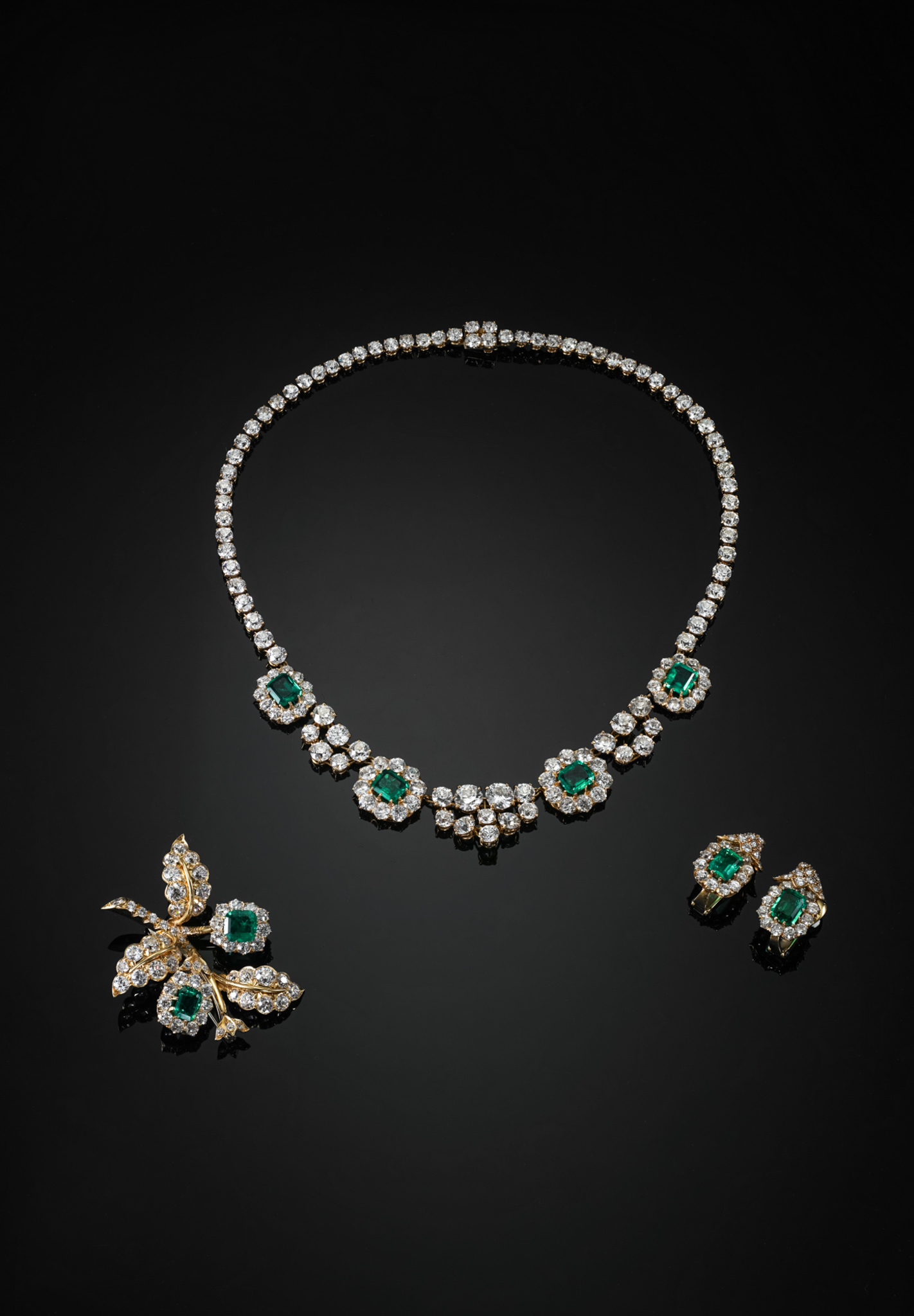 EMERALD AND DIAMOND NECKLACE, EARRINGS AND BROOCH SET