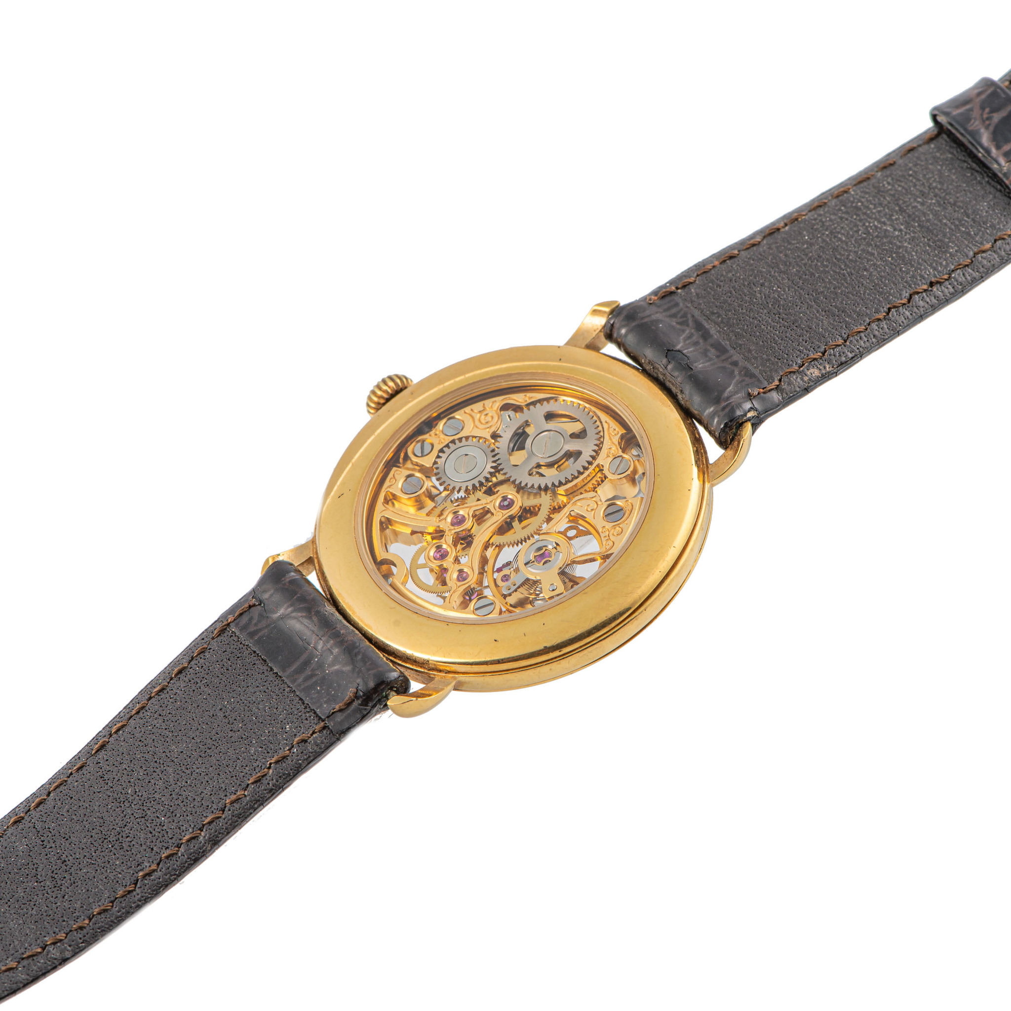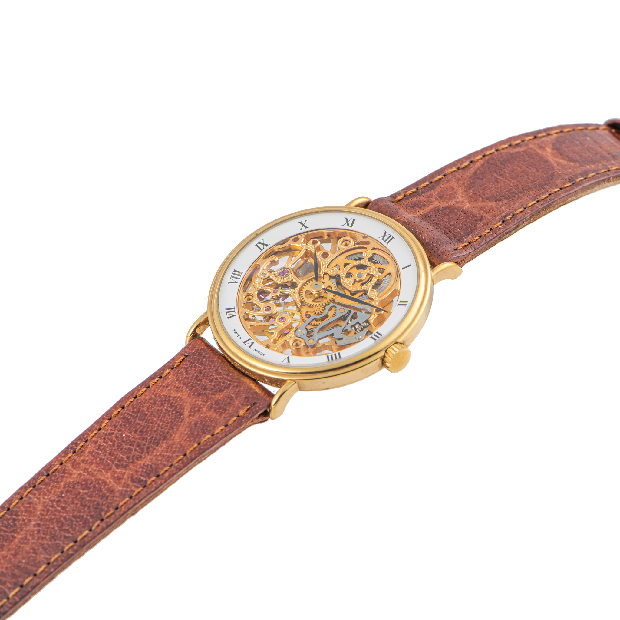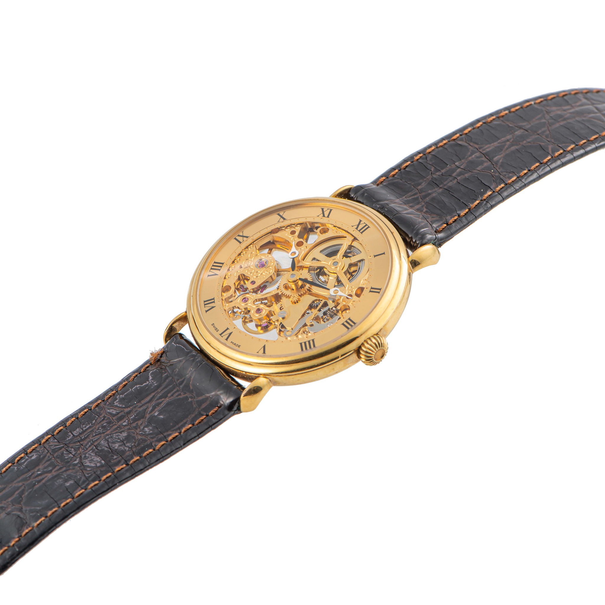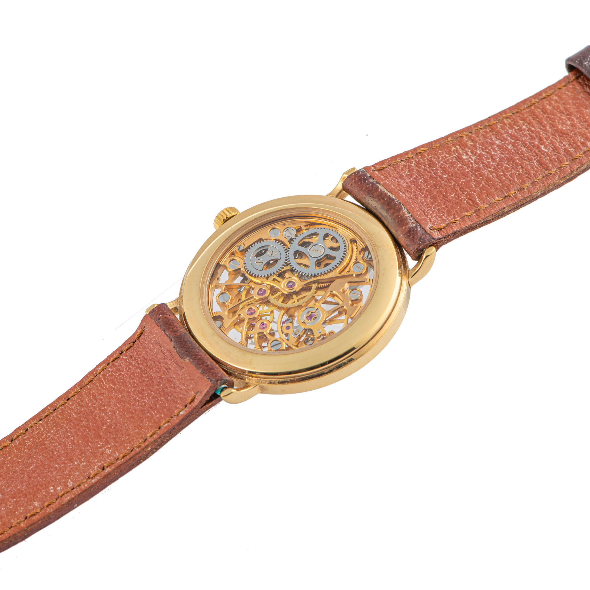 Fine, gold plated, skeletonized, wristwatch, stepped bezel, sapphire crystals.