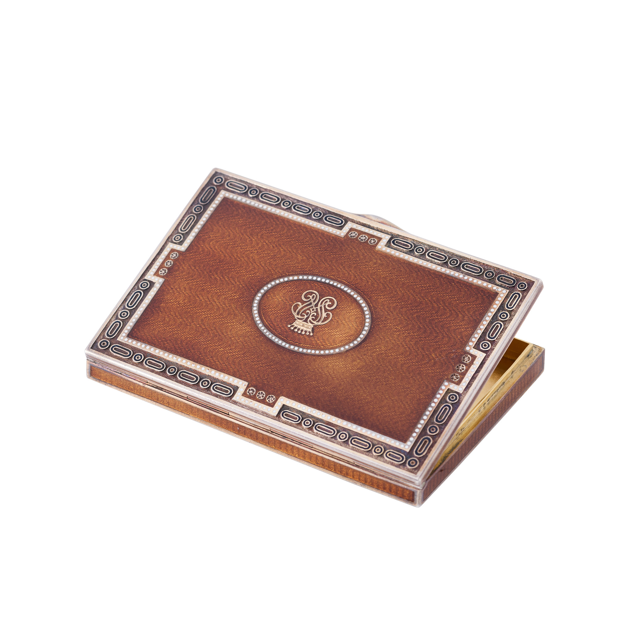 A fine and rare, silver box with hinged cover, box decorated with brown enamel , the center of the cover decorated with emblem, 2 hallmarks stamped inside the box.