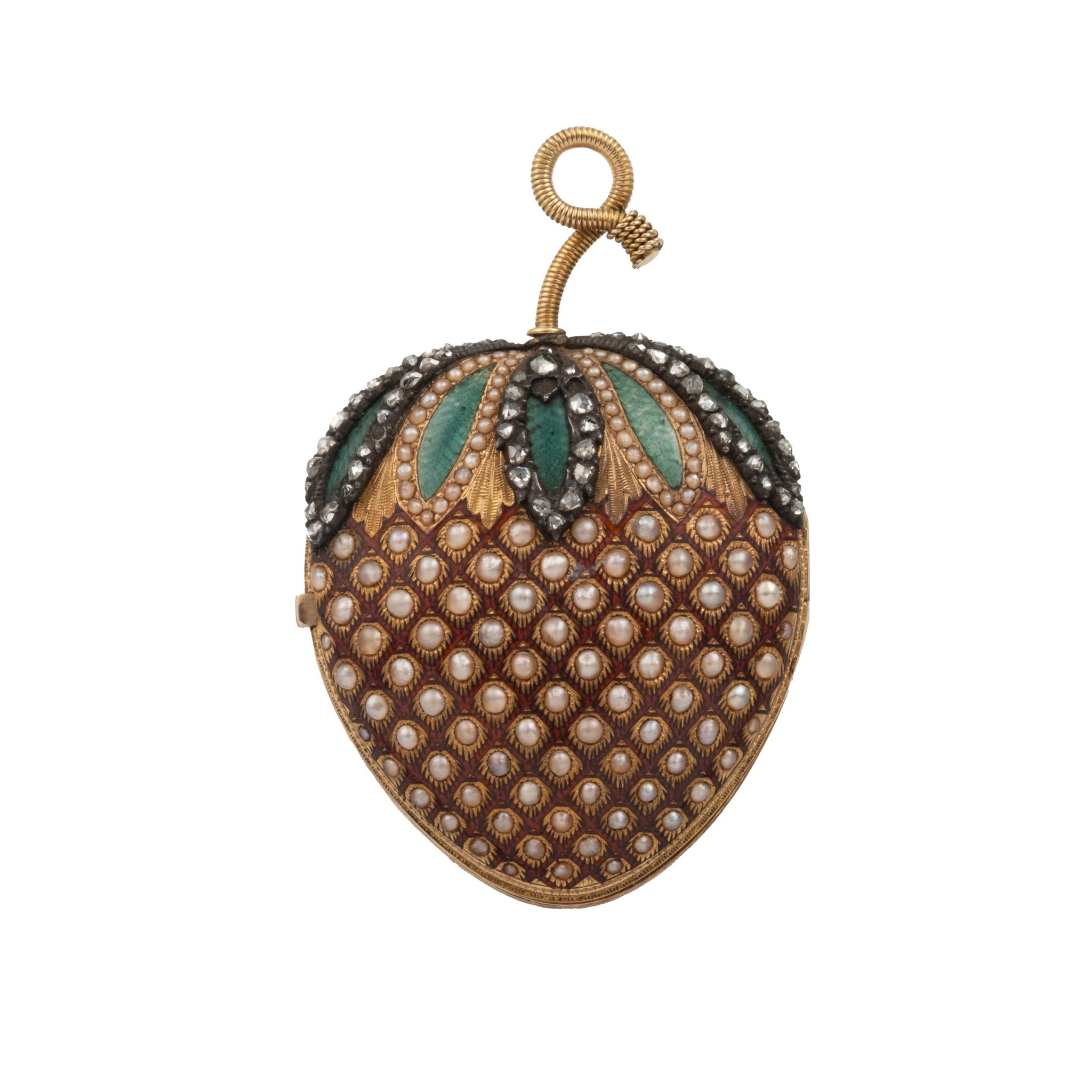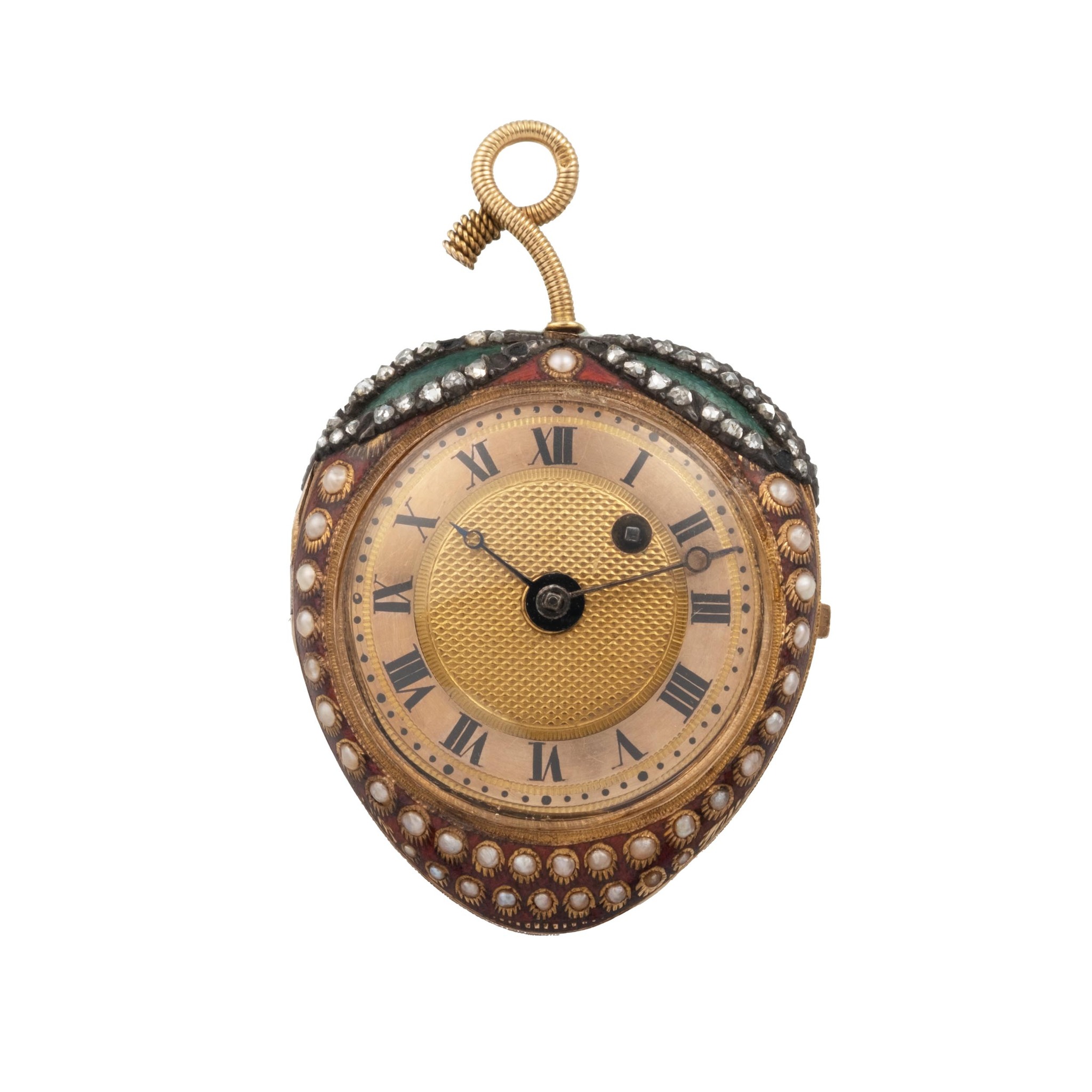 A very fine and rare, 18k gold, 18k gold, enamel, pearl and rose-cut diamond-set, manual wind the back of the fruit in red enamel with half pearls for seeds, green enamel on top for the leaves set with graduated half pearls and alternately set with rose-cut diamonds, spring-loaded bezel, gold stem forms the pendant. Gold dial, champlevé with radial Roman numerals, outer dot minute divisions, engine-turned centre. Blued-steel Breguet hands.