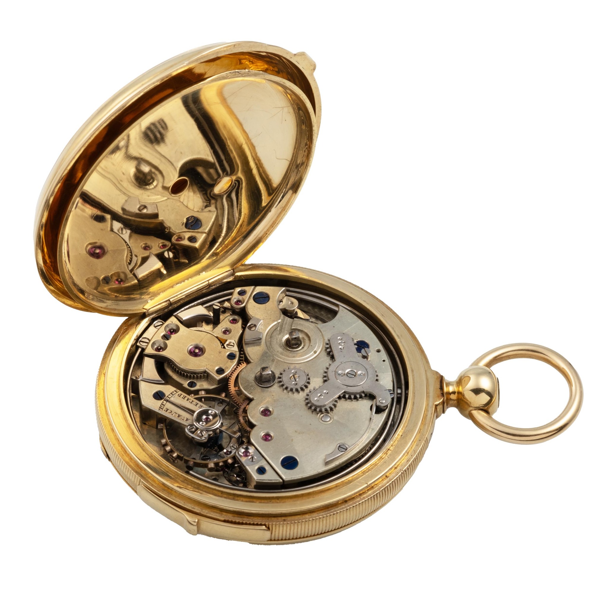 A fine, 18k yellow gold, manual wind half hunting case, key-winding pocket watch with quater repeater, enamel dial with blue steel fleur de Lys hands.