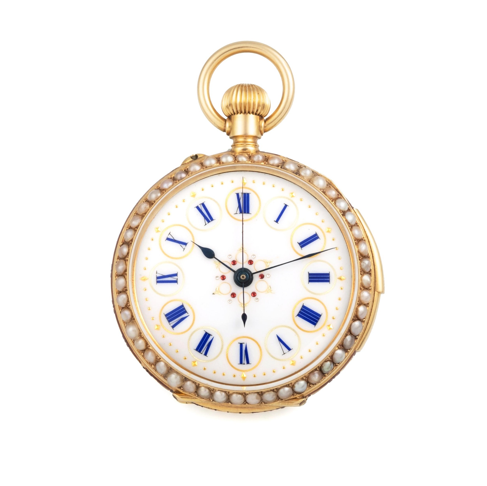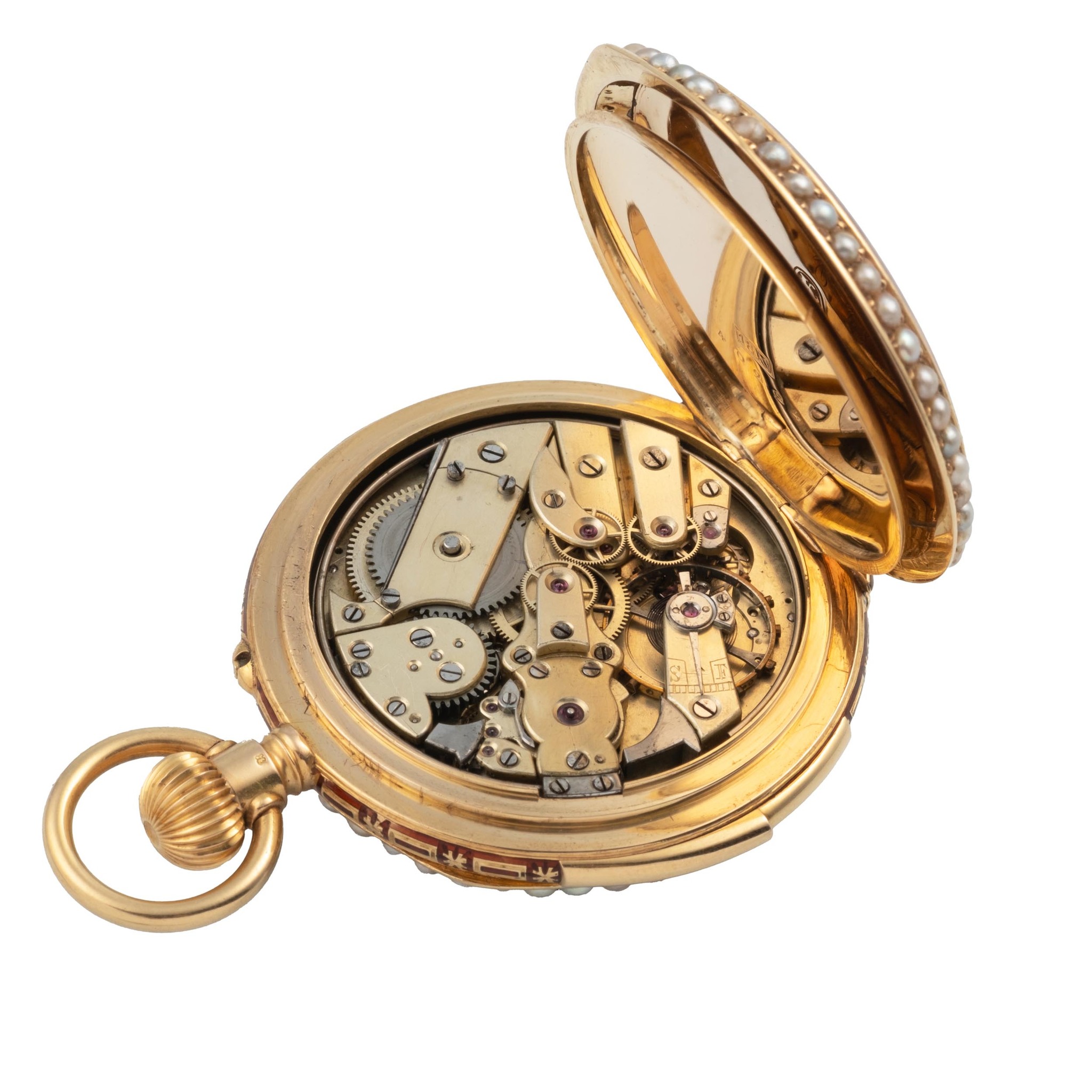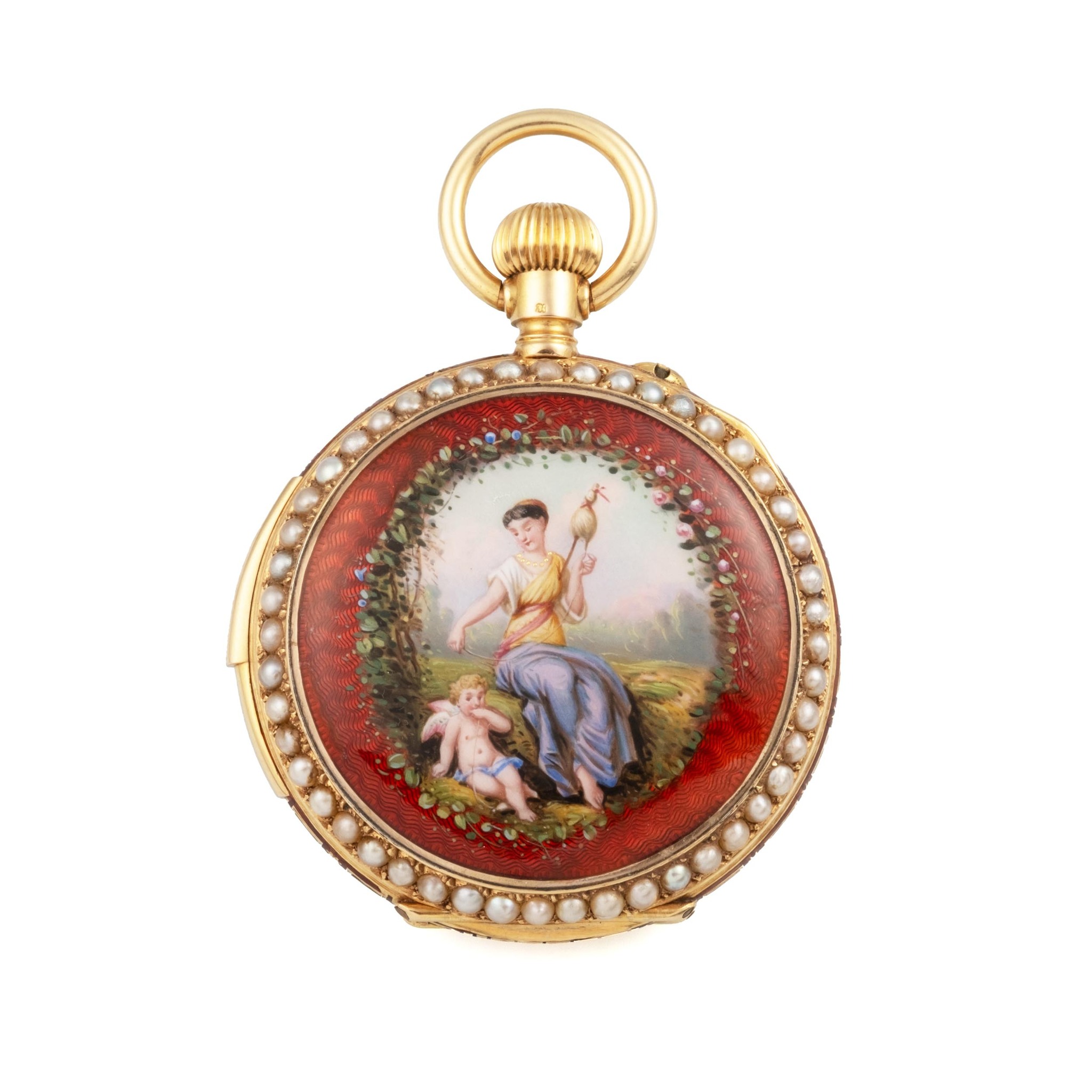 A very fine and rare, 18k gold, enamel and pearls, manual wind open face, keyless-winding, small pocket watch, made for the Chinese market, with centre-seconds. Minute-repeater by two hammers. Translucent enamel case-back, with polychrome painting on enamel in the centre showing a young woman spinning her distaff with Cupid at her feet; bezels set with half-pearls. Case-band engraved and red enamelled in champlevé decoration. White enamel dial with radial Roman numerals and gold “paillons” décor; blued steel “Spade” hands.
