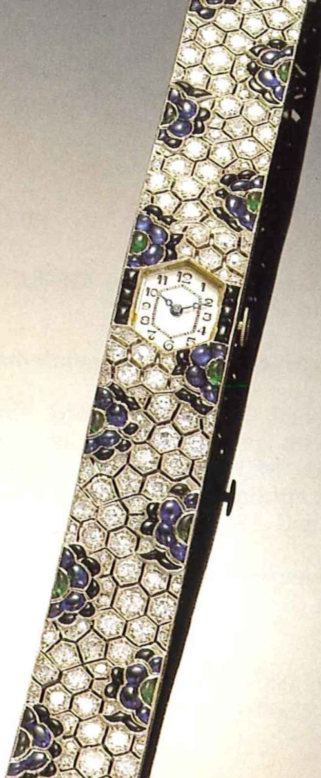 Vacheron & Constantin, Genève, No. 392900, case No. 7846 by Verger Frères Paris, circa 1922. Extremely fine and rare "Tutti Frutti", hexagonal, platinum, diamonds, sapphires and eineralds lady's wristwatch.