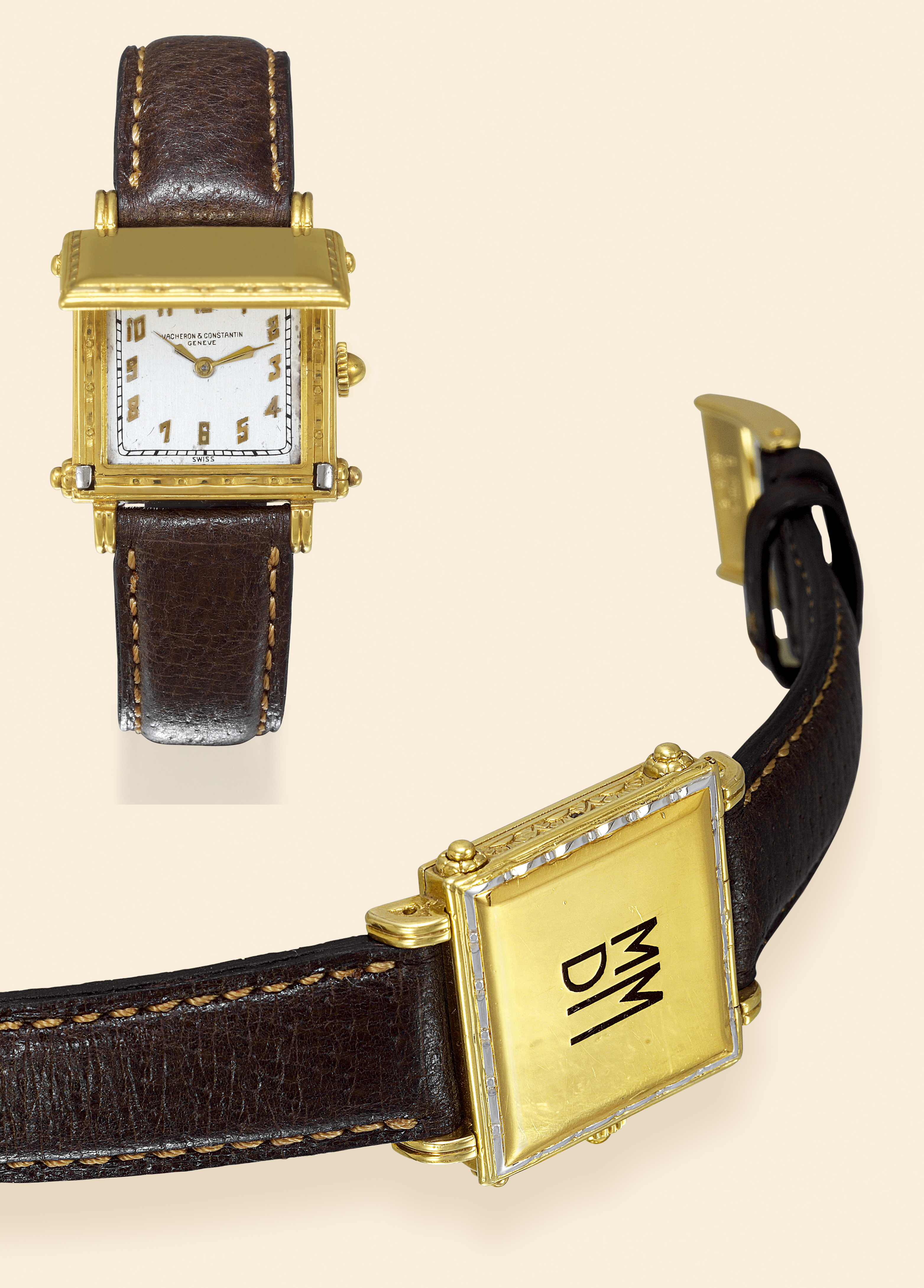 C. Three-body, solid, polished and brushed, gold cover with enamel monogram ?MDM?, engraved border inlaid with platinum, opening via pushers in the band, band engraved with floral arches, bezel with ribbon engraving, engraved lugs, hinged back. D. Silvered, brushed, with applied yellow gold ?cubiste? numerals, outer minute track. Gilt steel ?moderne? hands. M. Cal. R.A. 9???90 18/12, rhodium-plated, 18 jewels, cut bimetallic compensation balance adjusted to five positions, flat balance spring. Dial, case and movement signed. Dim. 27 x 27 mm. Thickness: 7.8 mm.
