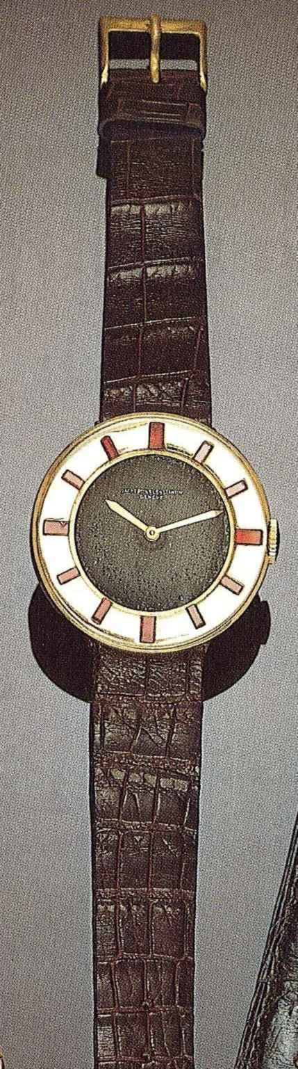 C. massive, polished, bezel graduated with 12 rubies., hooded lugs, bevelled crystal. D. black dial. "Bâton" gold hands. M. 9"', rhodiumed, 15 jewels, lever escapement, cut bimetallic balance adjusted to 3 positions, Breguet balance-spring. Dial, case and movement signed. In very good condition. Diam. 30 mm.