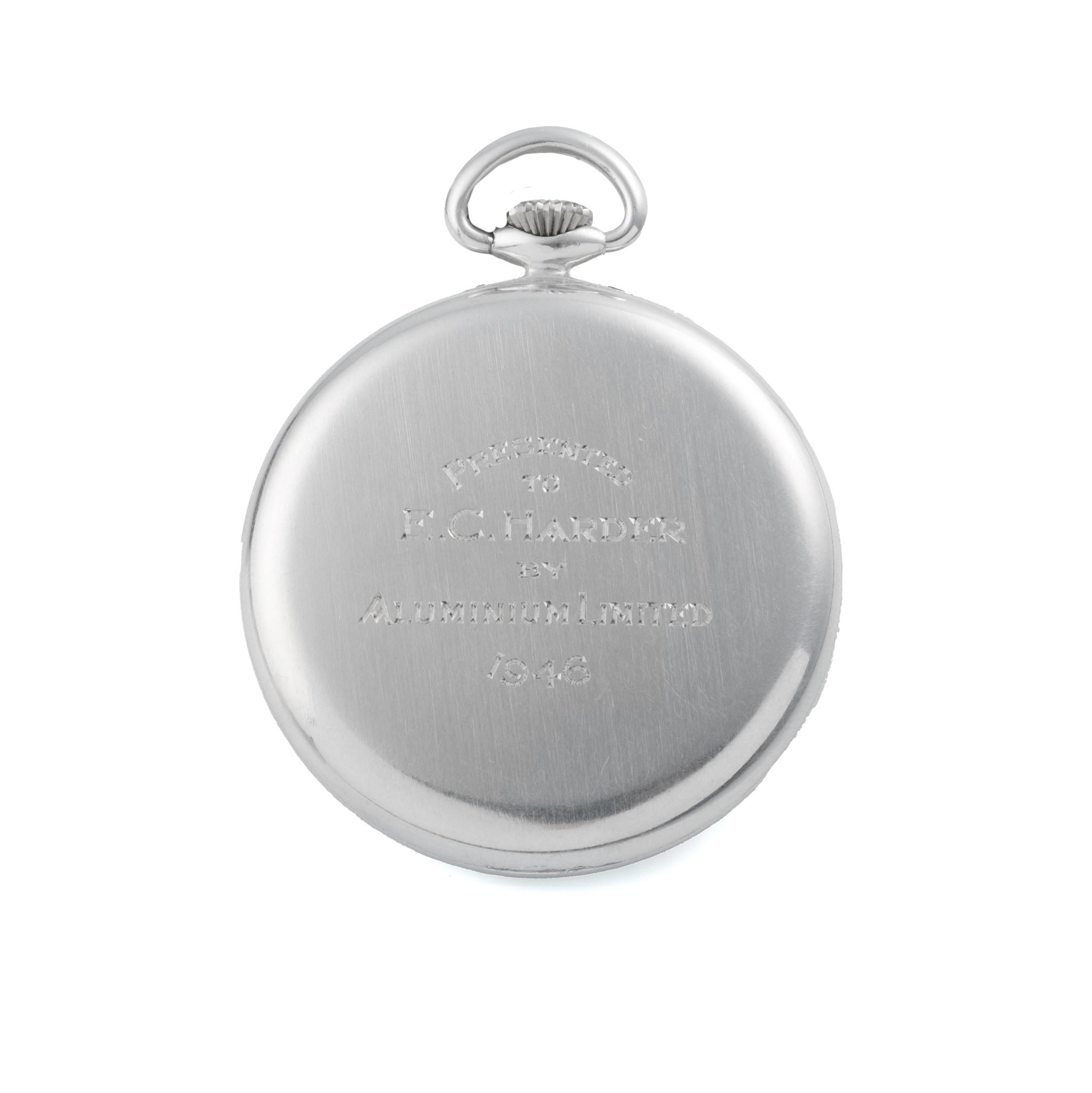 A fine and rare, aluminum, manual wind open-face, keyless-winding, ultra-light dress-watch, snap-on case-back, subsidiary seconds at 6, aluminium dial and aluminium Breguet hands. Case-back engraved in taille-douce with a dedication by Aluminium Limited 1946.