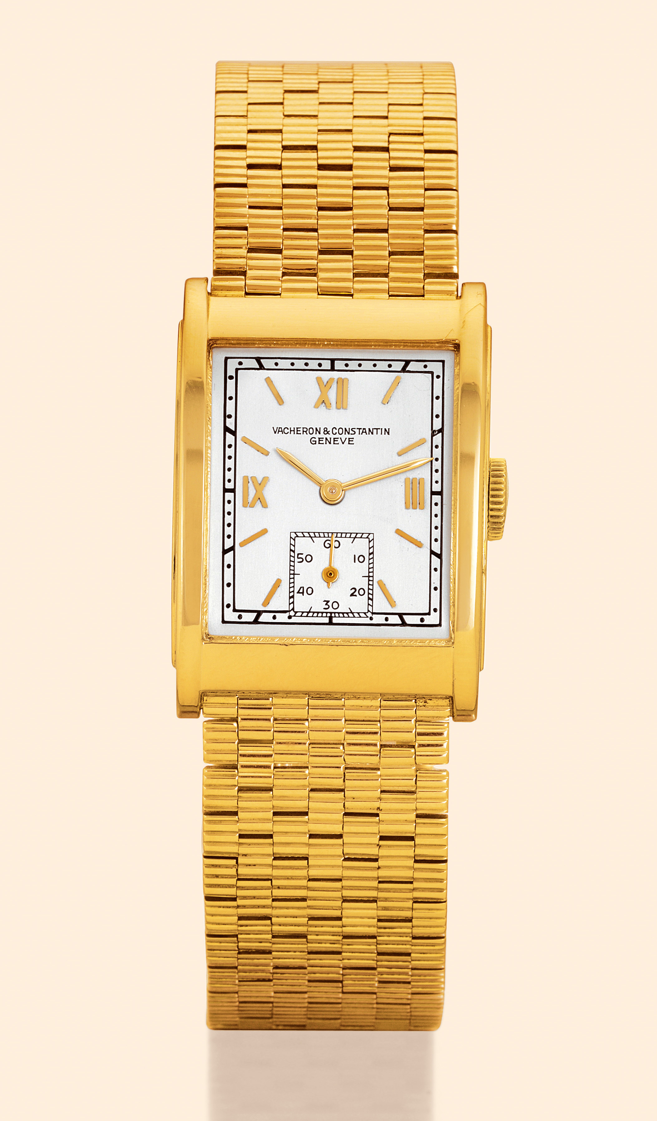 Vacheron & Constantin, Genève, No. 427280, case No. 266275. Import marks for London, 1939. Very fine, rectangular, curved, 18K yellow gold gentleman's wristwatch with 14K gold tile-link bracelet.