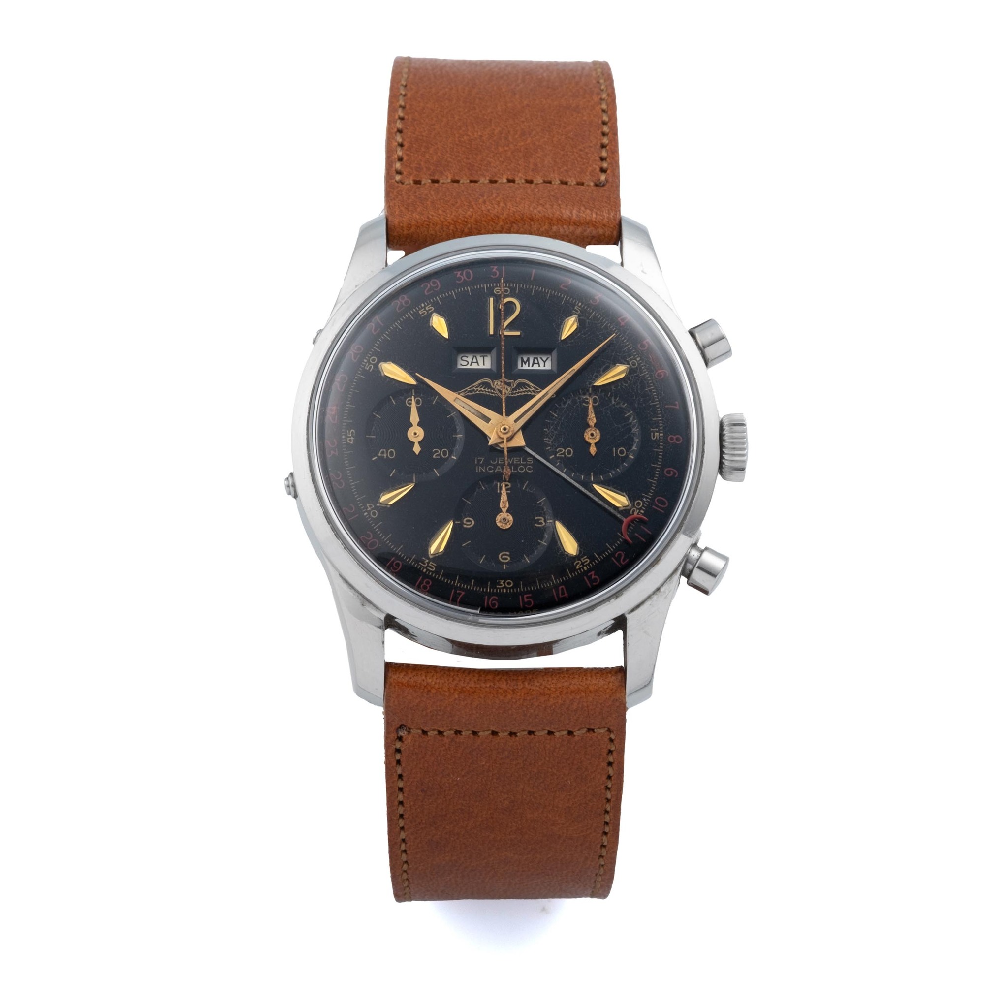 A large, rare, stainless steel, manual wind waterproof triple date chronograph wristwatch with black dial