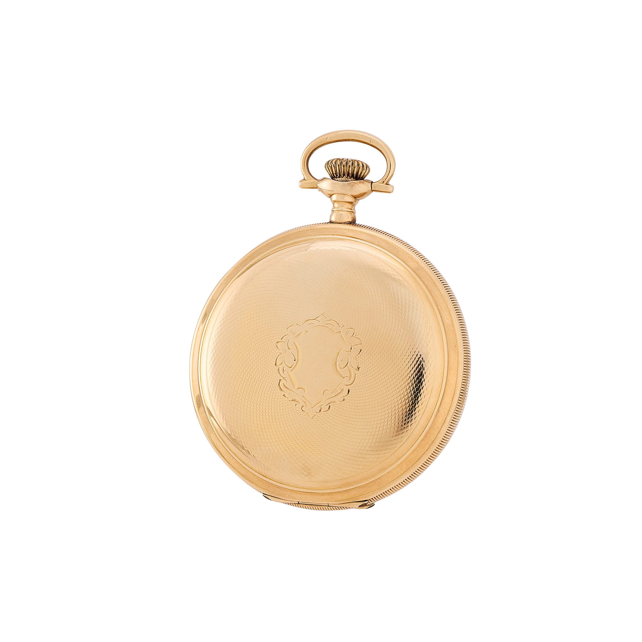 A fine,14k yellow gold hunting-case decorated with engraving, keyless-winding pocket watch with enamel dial and subsidiary seconds at 6.