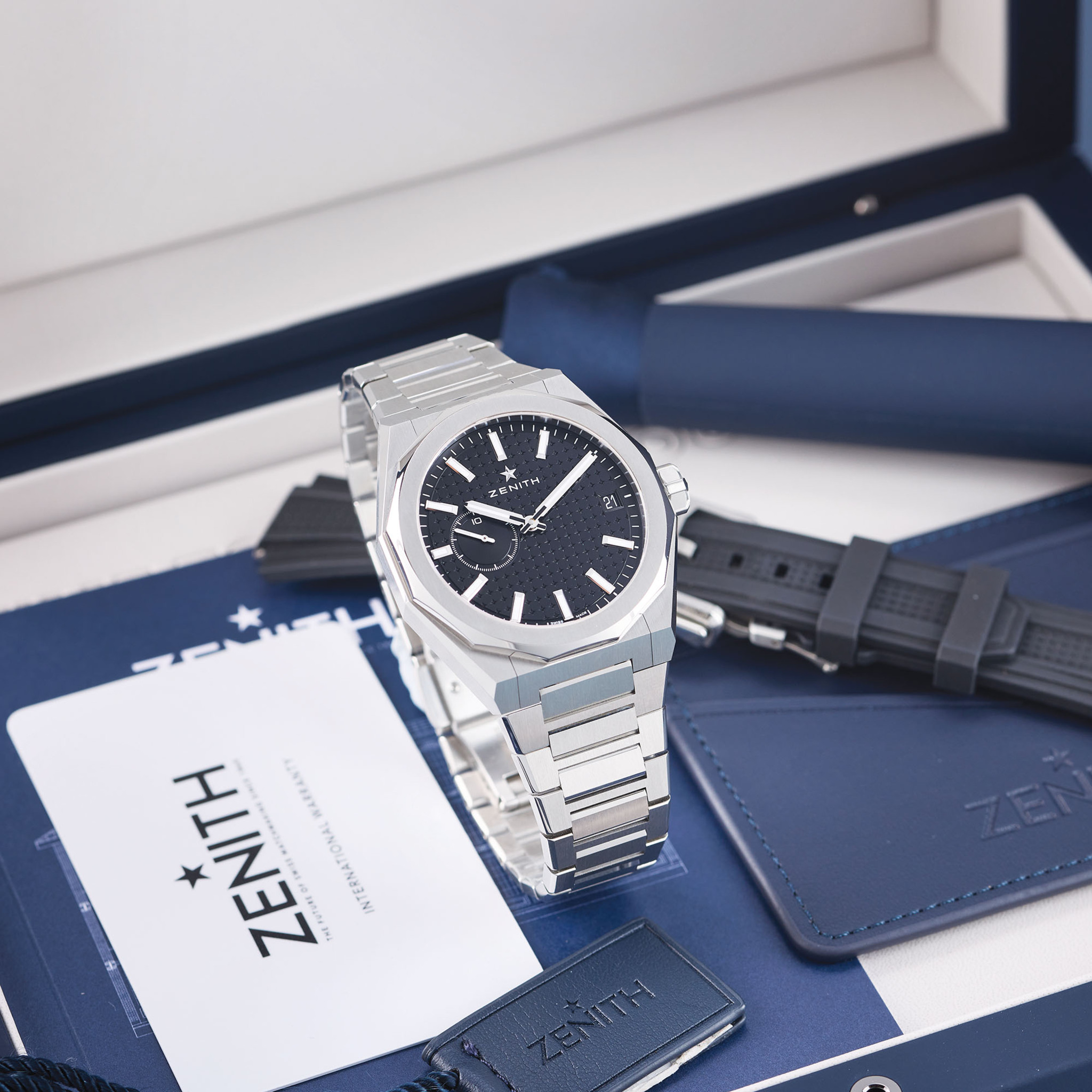 Accessories Zenith fitted box, international warranty dated 2025, additional rubber strap, instruction booklet, leather card holder, cloth, tag