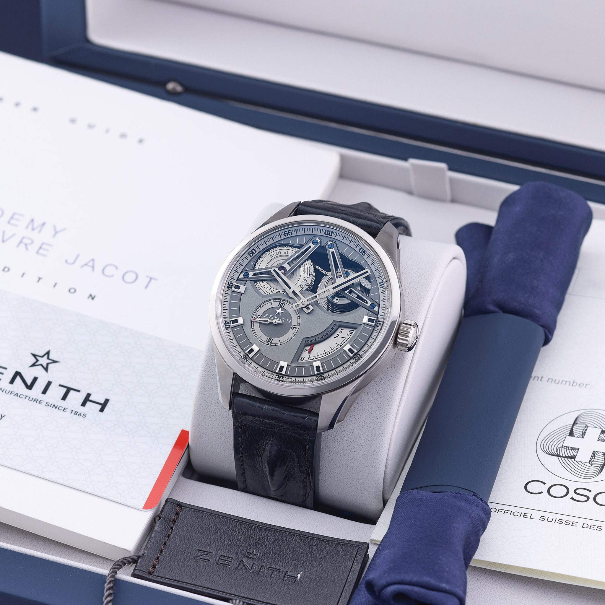 Accessories Zenith fitted box, warranty card dated 2024, instructions booklet, COSC certificate, tag, cloth