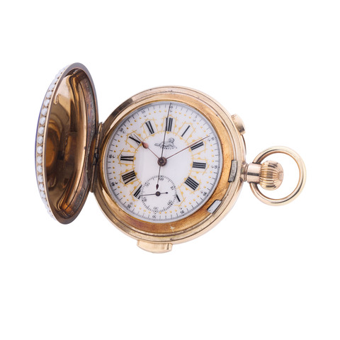 A very fine and rare, 18k gold and silver, manual wind open face key-winding pocket watch, quarter-repeating pocket watch with ruby cylinder escapement. White enamel with radial Roman numerals, outer minute divisions, eccentric subsidiary seconds at 5 o'clock. Blued steel Breguet hands.Grading System: AAA