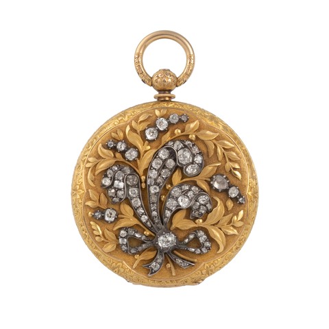 An extremely fine and extremely rare, 18k yellow gold and diamonds set, manual wind hunting case, key-winding pocket watch, the band and borders engraved with foliage decoration, the cover chased in high relief with rose-cut diamond-set foliage, the back decorated en suite with flowers and musical instruments. Hinged gold cuvette with engine-turned border, also engraved with technical details. White enamel dial with Turkish numerals. Gold Breguet hands.