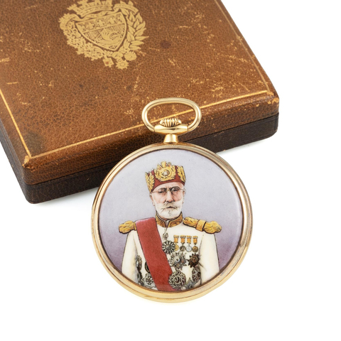A fine and rare, 18k yellow gold and enamel open-face, keyless winding pocket watch. Presentation watch with the back of the watch depicts an enameled portrait of Mohamed el-Amine Bey in ornate uniform with numerous official decorations. Silver dial, Arabic numerals with subsidiary seconds at 6.