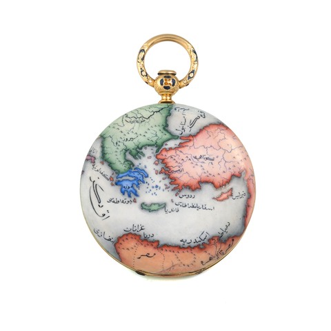 An extremely fine, important and unique, 18k yellow gold and enamel, manual wind hunting case, key winding pocket watch, entirely painted on enamel a map of the Ottoman Empire. White enamel dial with Turkish numrals, outer minute divisions. Breguet steel hands. Decorated on both sides with geographical maps of the Ottoman Empire, finely painted in translucent enamel (underglaze). • Side 1: Green representation of European Turkey, including Greece and the Balkans, with toponymy in the Ottoman Arabic alphabet. • Side 2: Red representation of Asian Turkey, including Anatolia and the Levant. These maps are remarkably precise, illustrating the relief, coasts, seas, and major cities, whose names are inscribed in Ottoman Turkish.