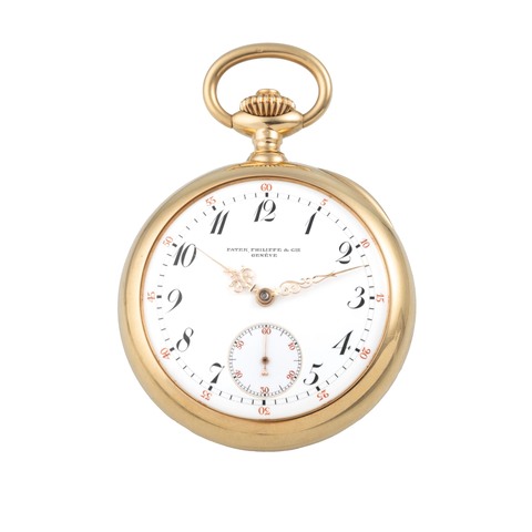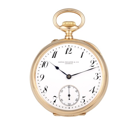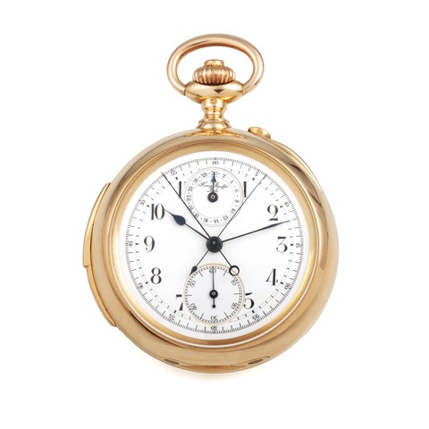 A very fine and rare, 18k yellow gold, manual wind open-face, minute repeating pocket watch, minute repeater, split-seconds chronograph with white enamel dial and blue steel spade hands.